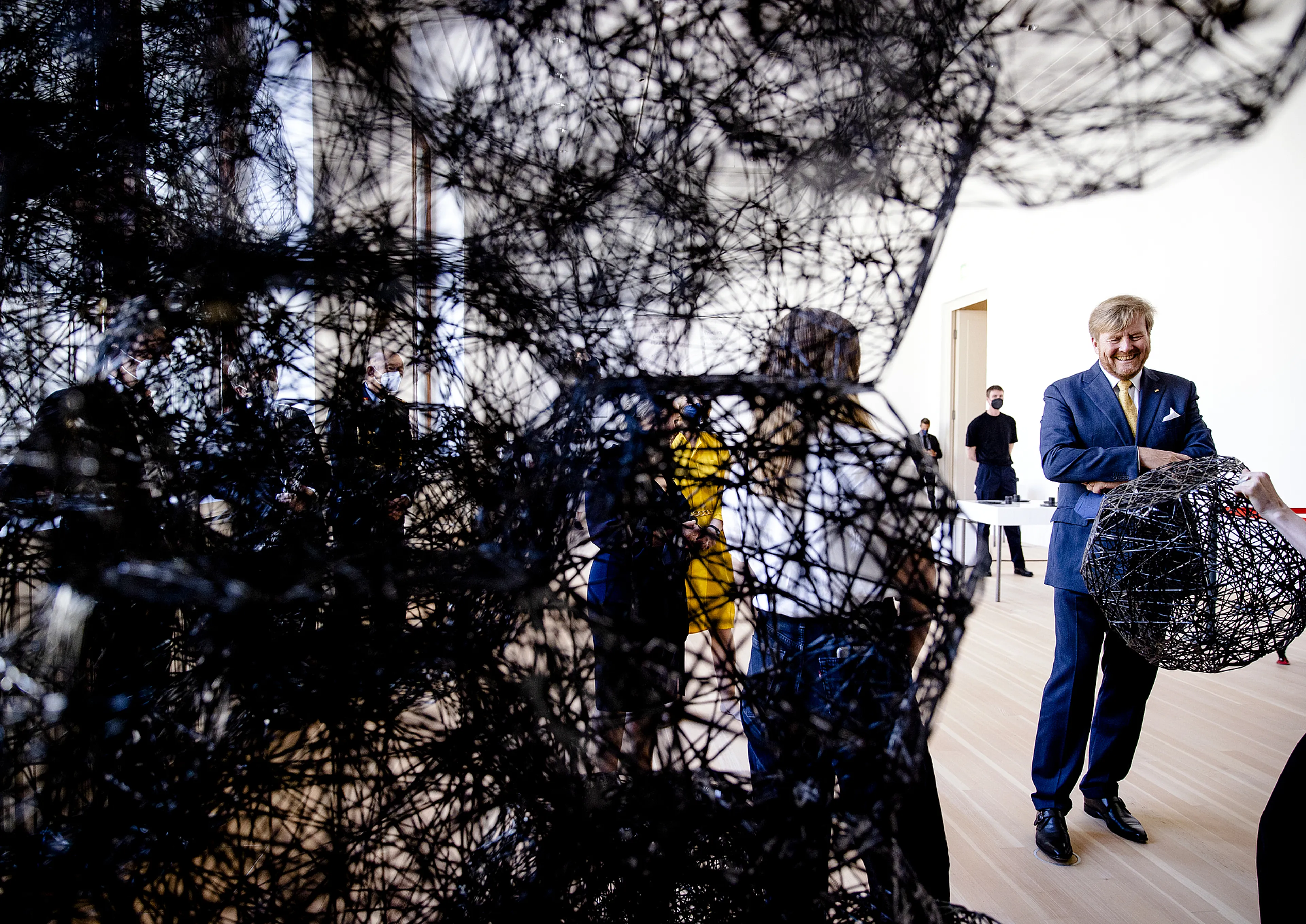 Hier, bij de Martin Gropius Bau, hadden de nieuwsgierigen kans om een glimp op te vangen van het koningspaar. Al werden de door een Duitse verslaggeefster als lokaas ten behoeve van een selfie met Máxima meegebrachte bloemen niet aangenomen. Het staatsbezoek kreeg in het fraaie gebouw, net langs de voormalige Berlijnse muur, zowel een duurzame als culturele dimensie dankzij het programma 'All Good(s)', waar onder meer nieuwe materialen voor mode en kunst te zien waren. Máxima nam ruim de tijd om de 'stoffen' te bekijken die onder meer uit plastic - Albert Heijn tassen - zijn gemaakt. Het materiaal was niet geschikt voor een Prinsjesdagjapon zo vertelde ontwerpster Michelle Baggerman. ,,Daarvoor is het nog te hard en weinig buigzaam."