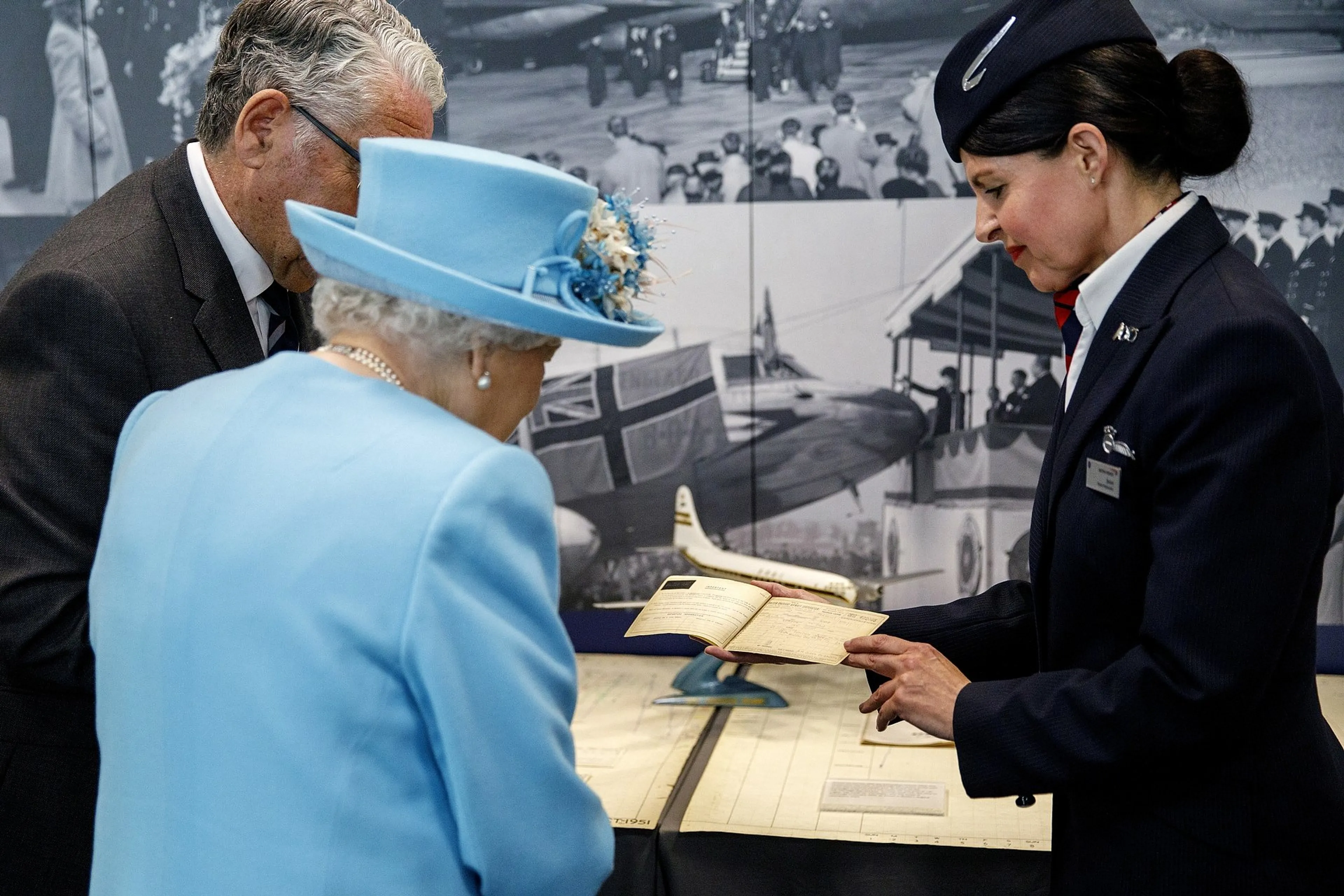 In het bedrijfsmuseum van British Airways trof Elizabeth onder meer ook haar eigen eerste vliegticket voor een vlucht die ze met haar man prins Philip naar Jamaica maakte.