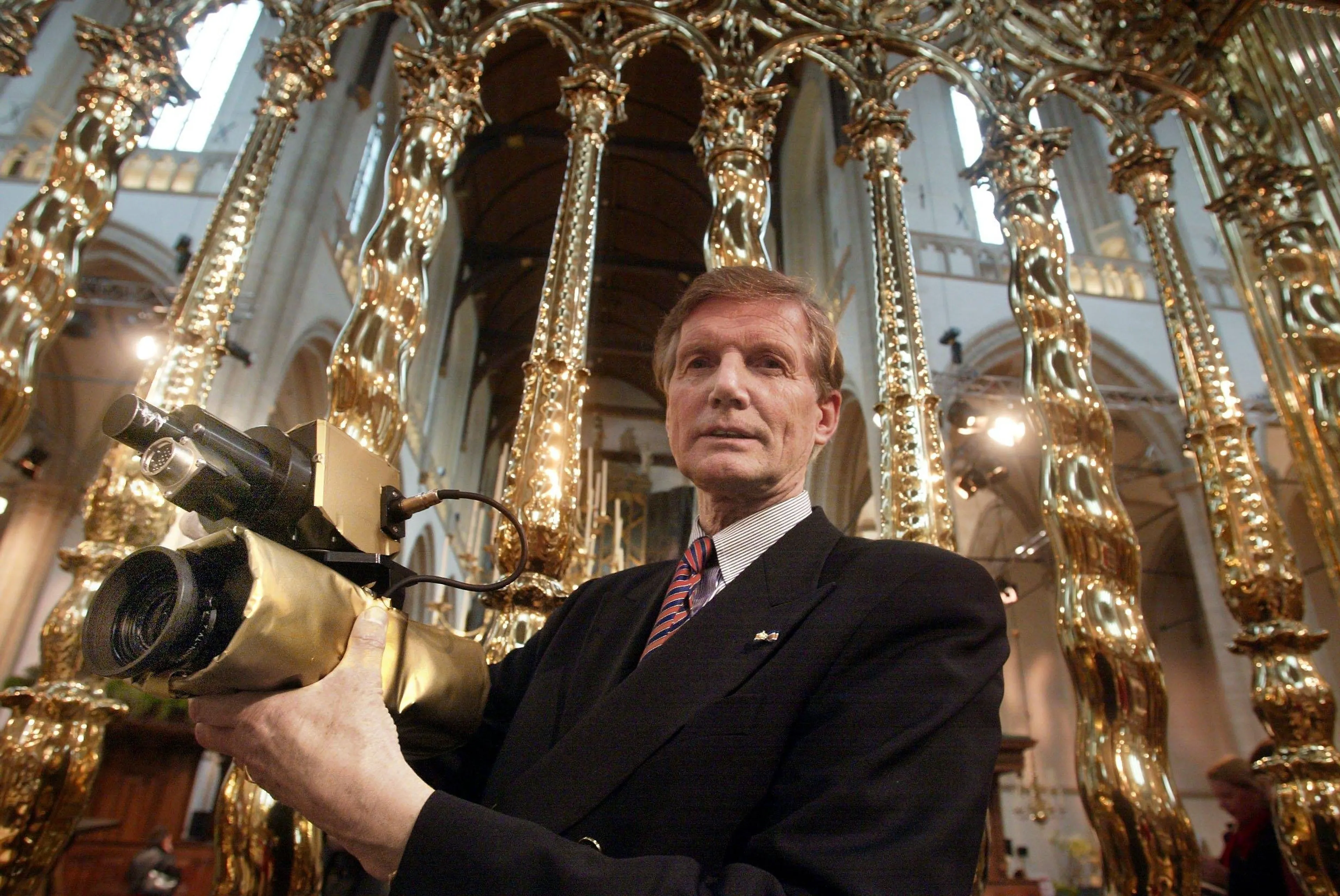 Rudolf Spoor in actie tijdens het huwelijk van Willem-Alexander en Máxima. Op de tweede foto toont hij hoe hij goudpapier om kleine cameraatjes had gewikkeld, die hij vervolgens tussen het koperen hekwerk in de kerk plaatste. Zo was er niks van te zien en kon hij toch een goed shot maken op het bruidspaar.