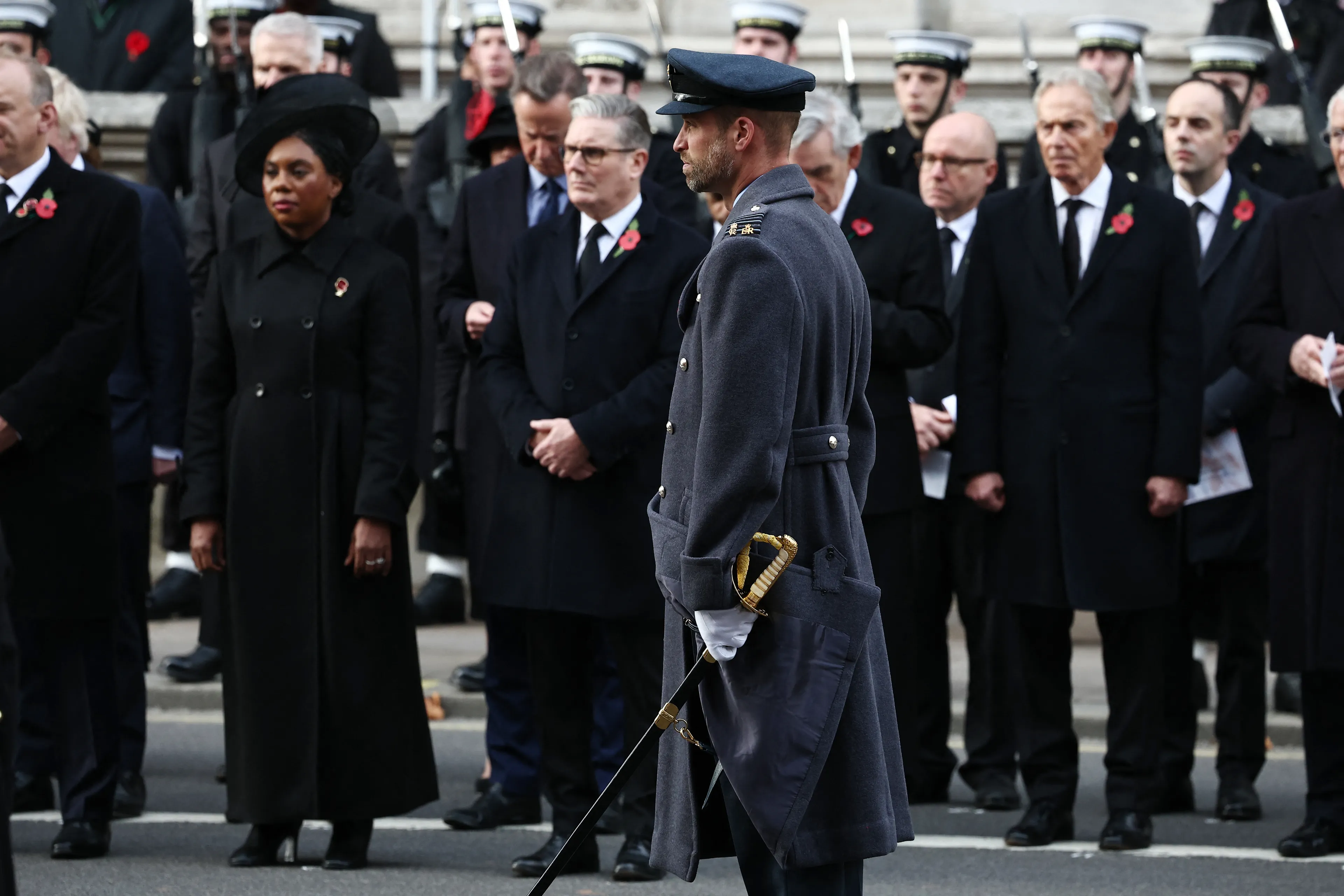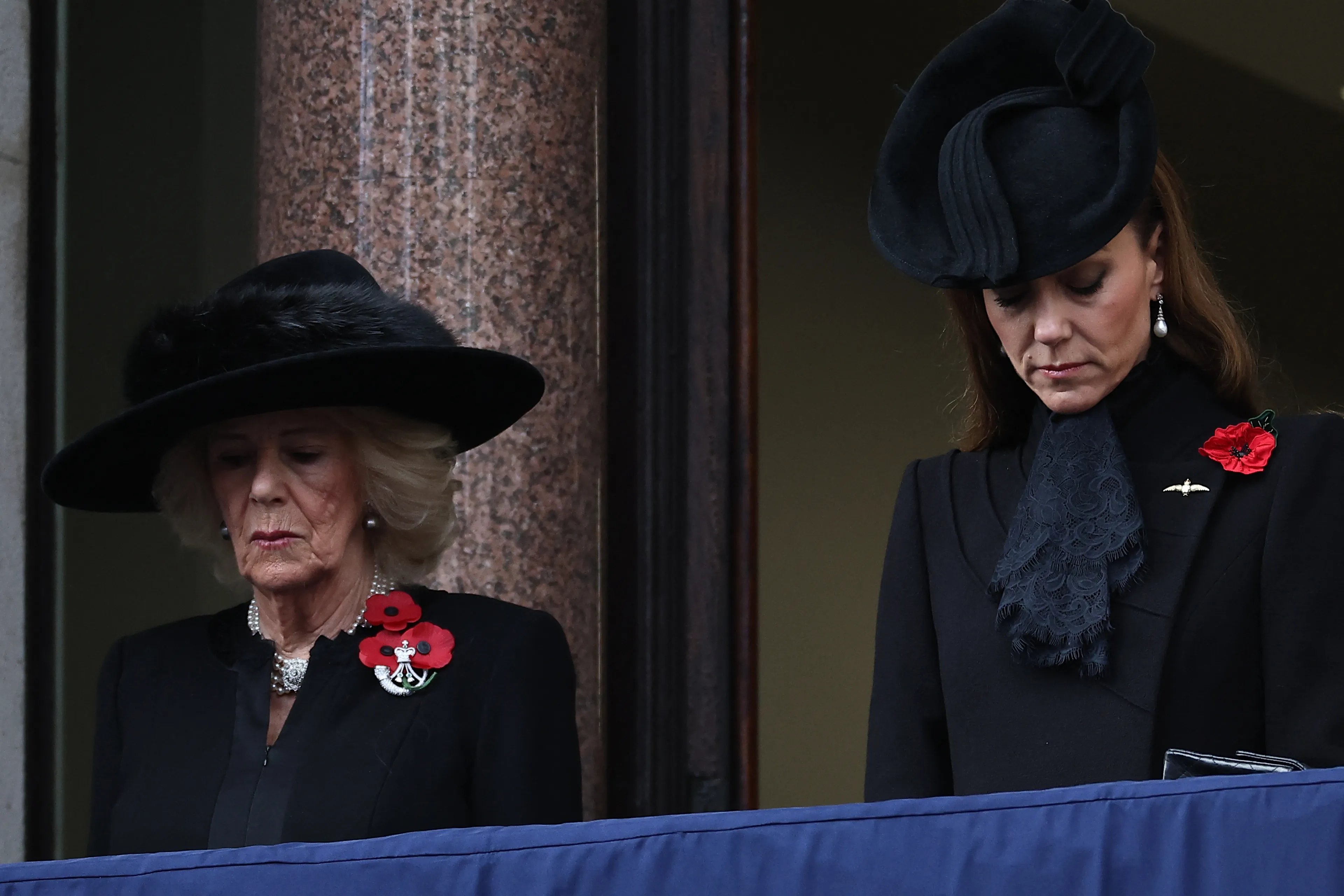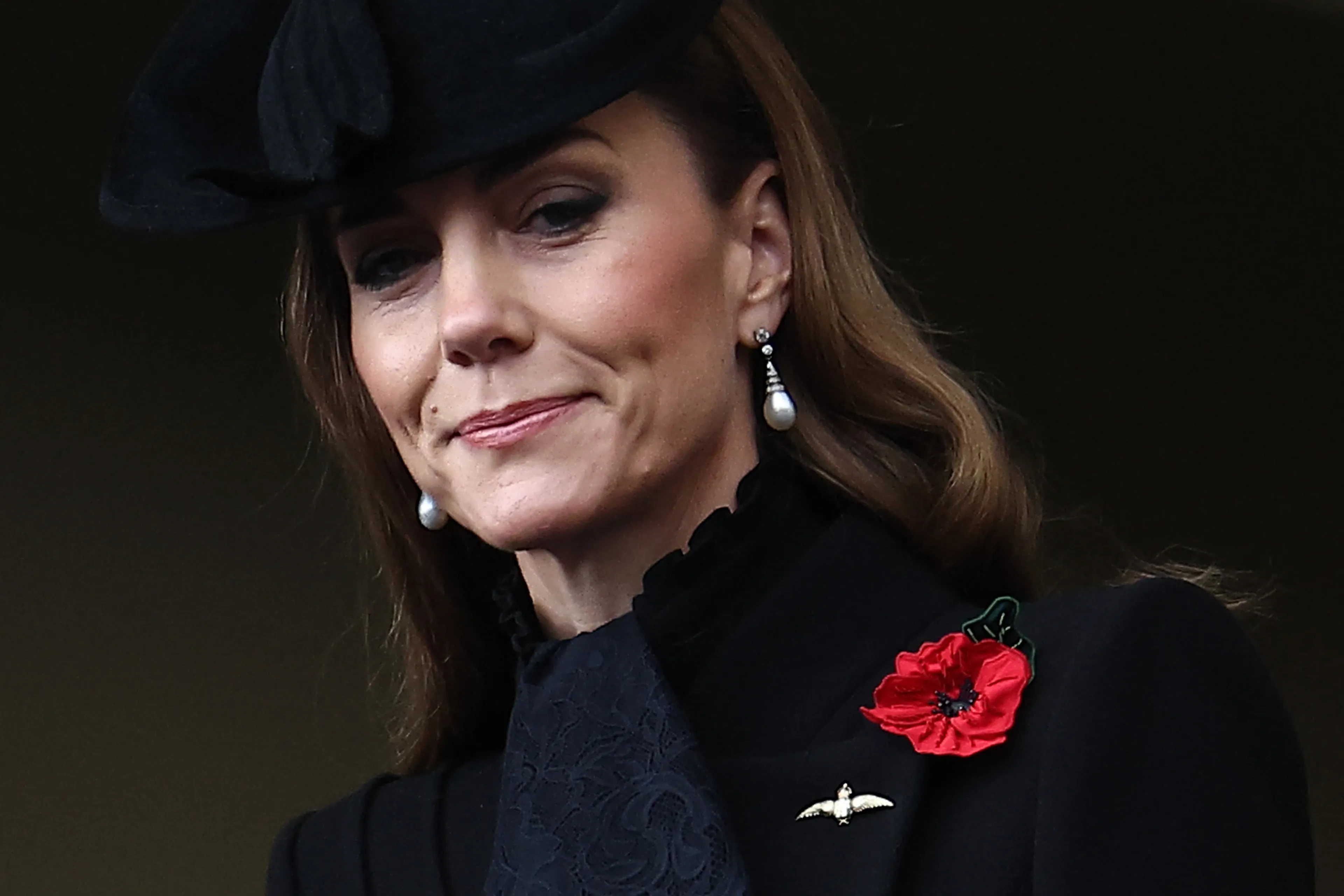 Catherine, de prinses van Wales oogt vanaf het balkon sereen en beheerst in een geheel zwarte outfit, met als accessoires een zwarte hoed, sjaal, haar RAF-speld en de traditionele rode klaproos. In haar oren hangen oorbellen van prinses Diana. De zogeheten Collingwood pareloorbellen van haar overleden schoonmoeder waren een geschenk in 1981 van het juweliershuis Collingwood, de vaste juwelier van de familie Spencer, ter gelegenheid van haar verloving met toenmalig prins Charles.