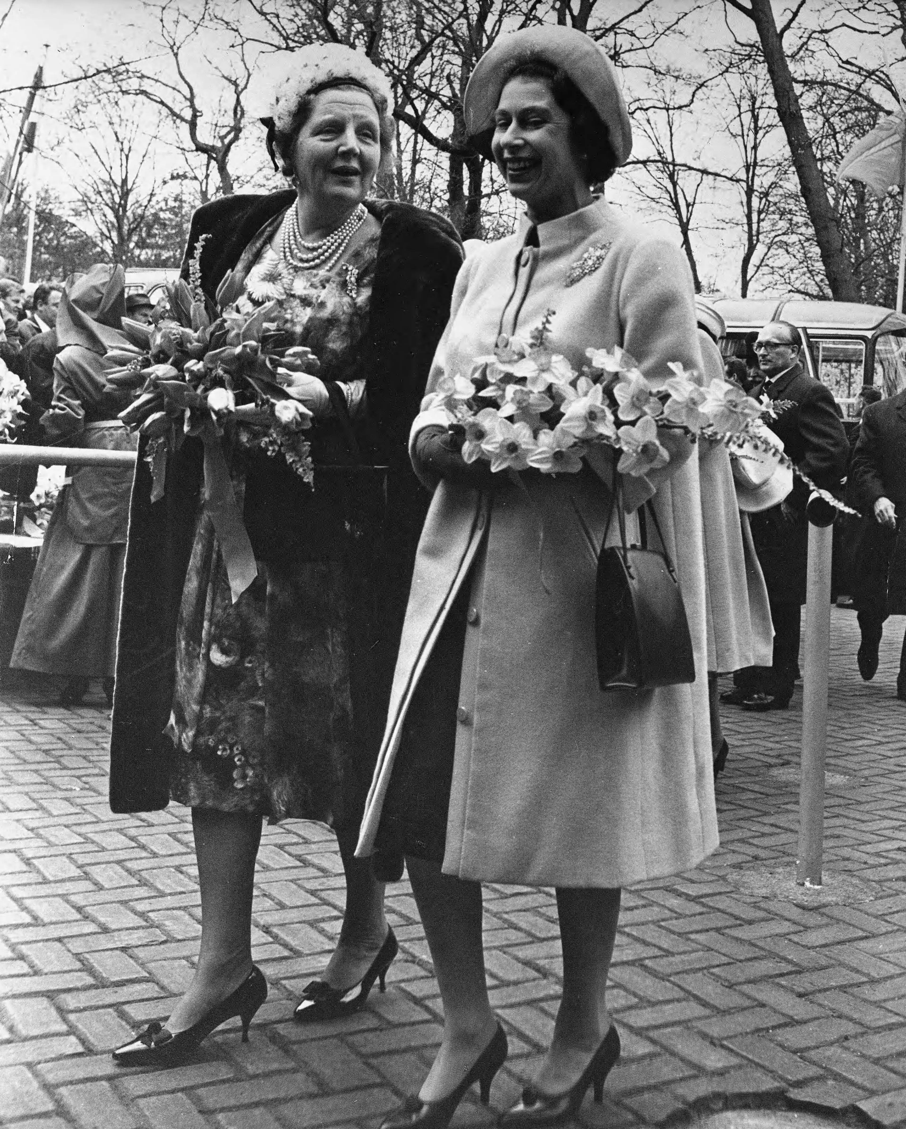 Op 2 mei 1962 brengen koningin Juliana en prins Bernhard opnieuw een bezoek aan de Keukenhof, in verband met de viering van hun 25-jarig huwelijk. Onder de gasten is ook de Britse koningin Elizabeth, die hier naast Juliana te zien is.