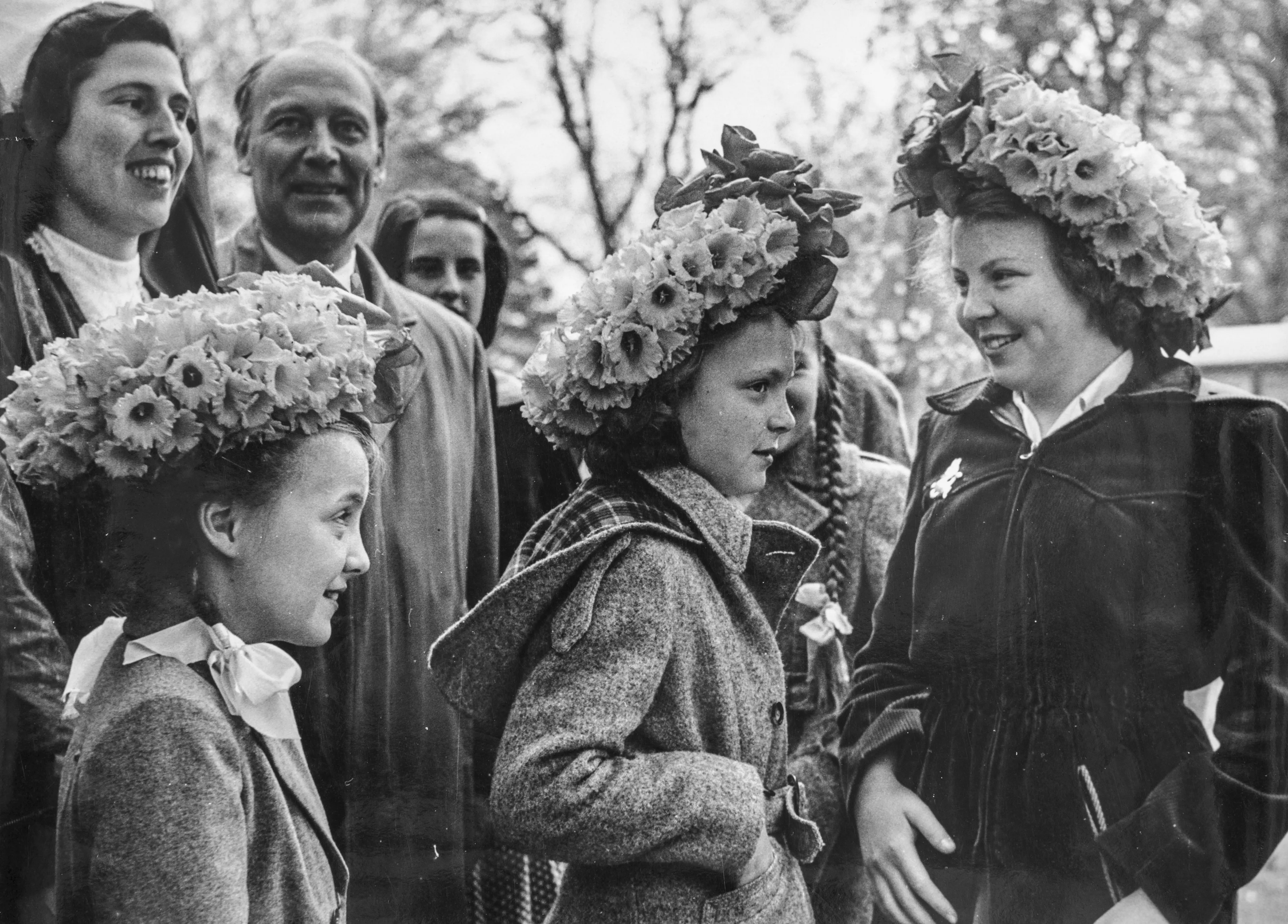 Op deze schattige foto zien we de drie zussen prinses Beatrix, prinses Irene en prinses Margriet met een kransje op hun hoofd tijdens een bezoek aan de Keukenhof in 1952.