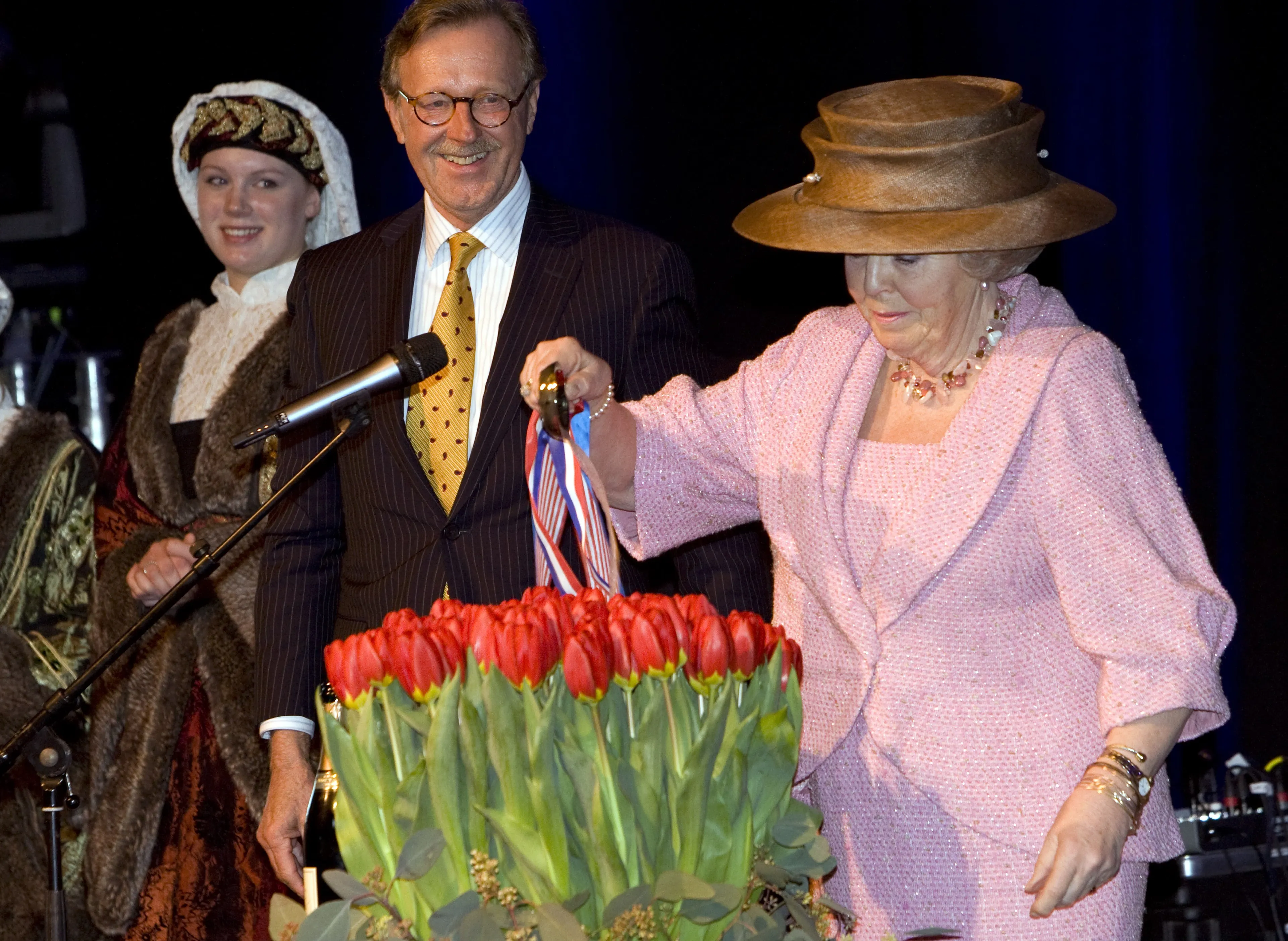 Prinses Beatrix is in 2009, toen nog als koningin, aanwezig bij de 60e opening van de Keukenhof. De koningin doopt een bos bloemen met champagne.