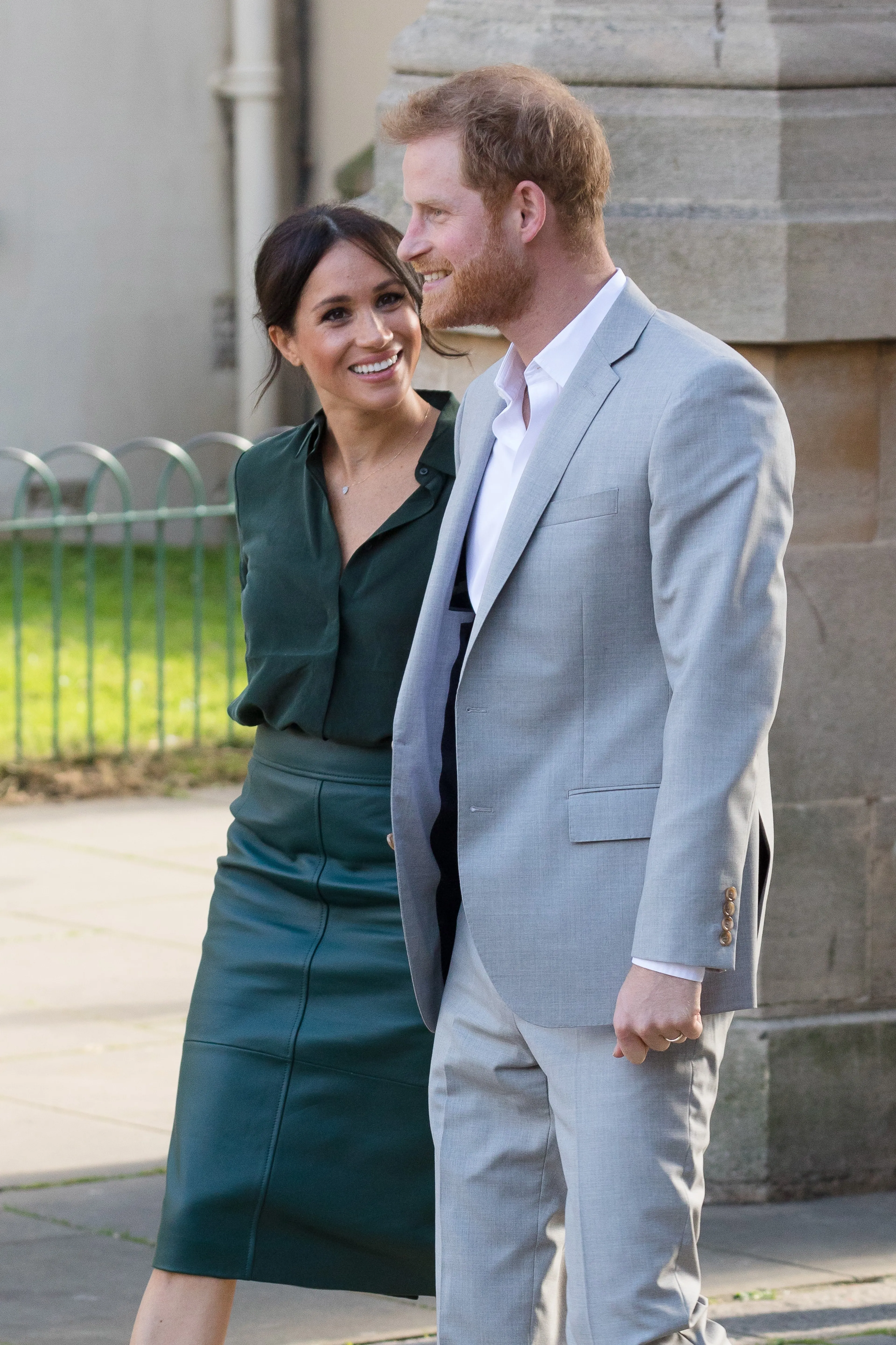 Ook hertogin Meghan heeft haar weg naar leren kledingstukken gevonden. Ze combineert het (imitatie-)leren item met een ander materiaal zoals satijn of wol om meer diepgang te creëren in een outfit. En ook Meghan doet dit met een monochrome outfit.
