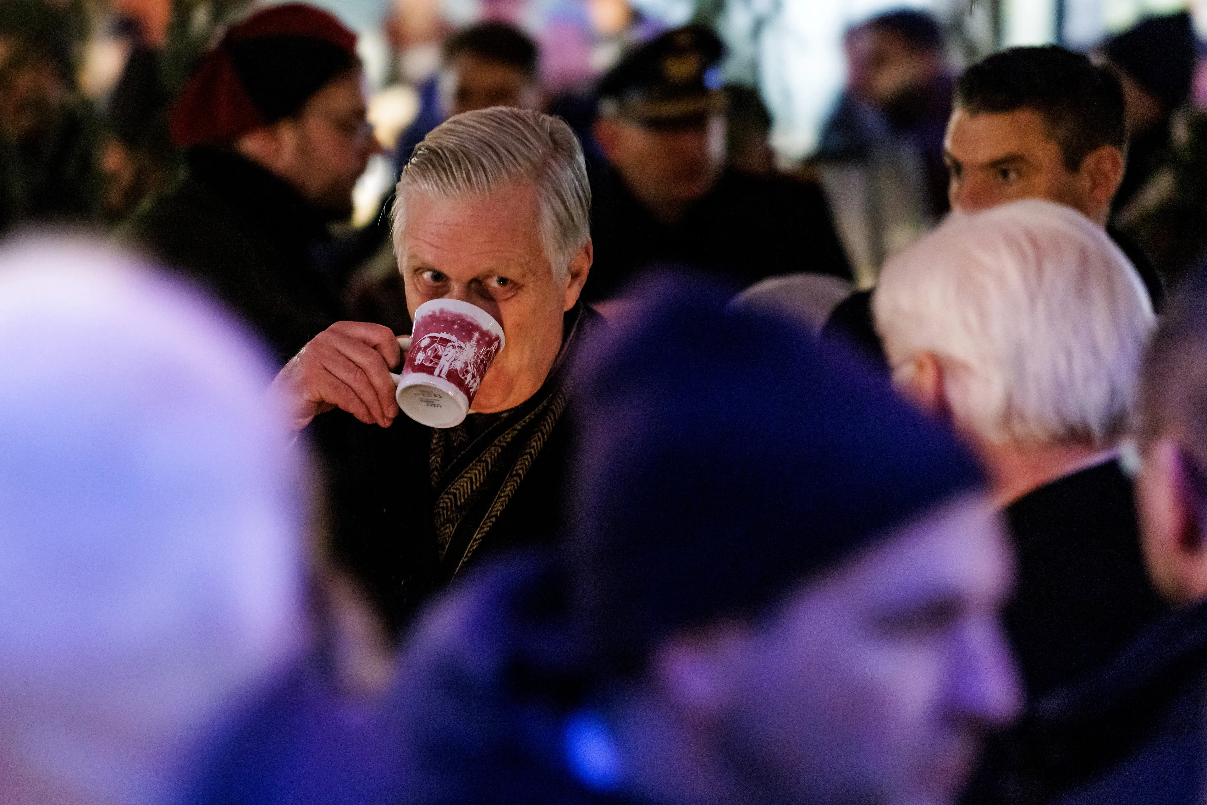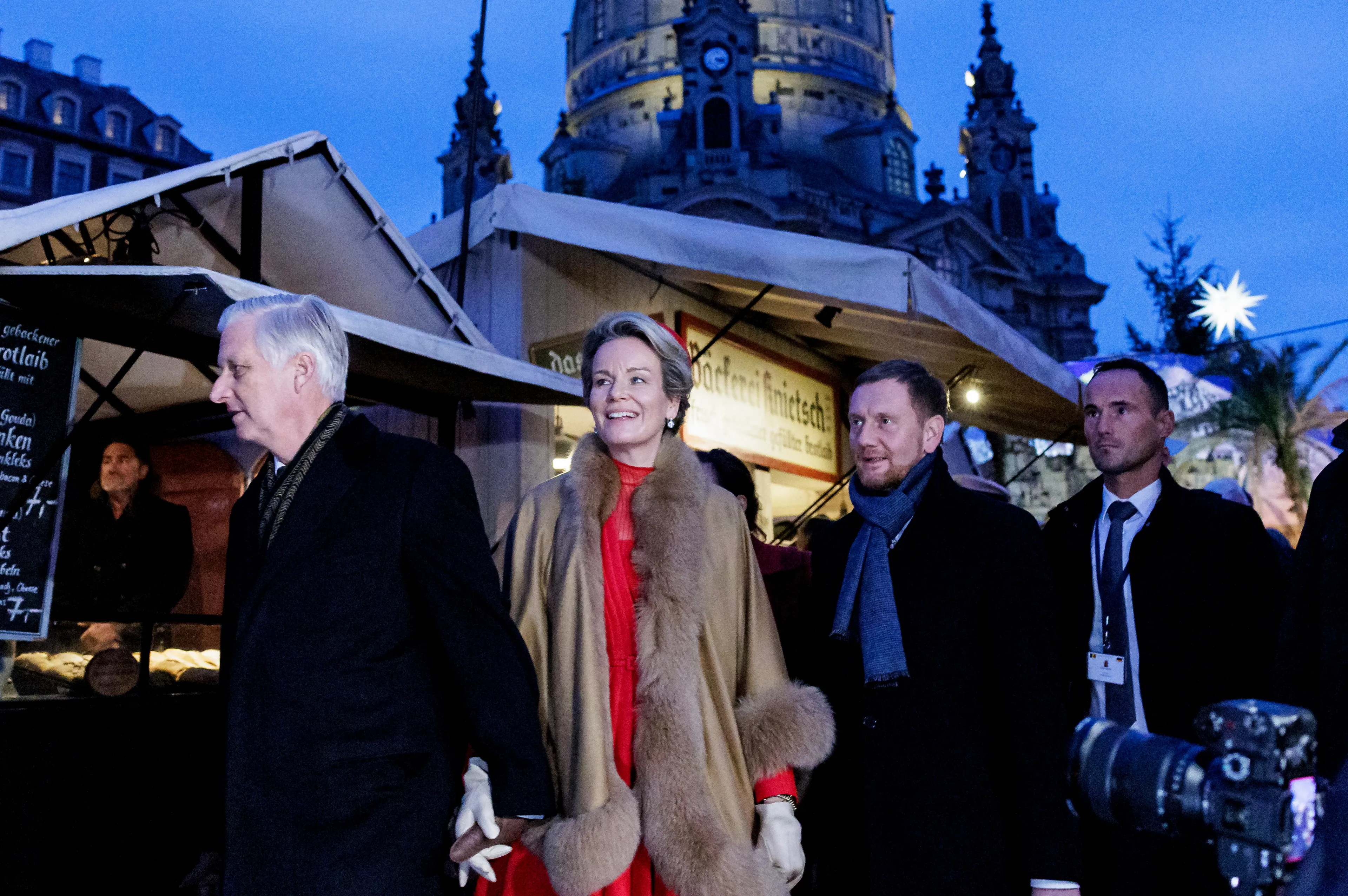 Onze zuiderburen Filip en Mathilde namen ook een kijkje op de kerstmarkt. Dat deden ze niet in België, maar in de Duitse plaats Dresden. Daar was het Belgische koningspaar begin deze maand namelijk op staatsbezoek. Het bezoek aan Duitsland werd sfeervol afgesloten aan een tafeltje onder de kerstboom. Daar dronken Filip en Mathilde een glaasje glühwein en aten ze van een kerststol.