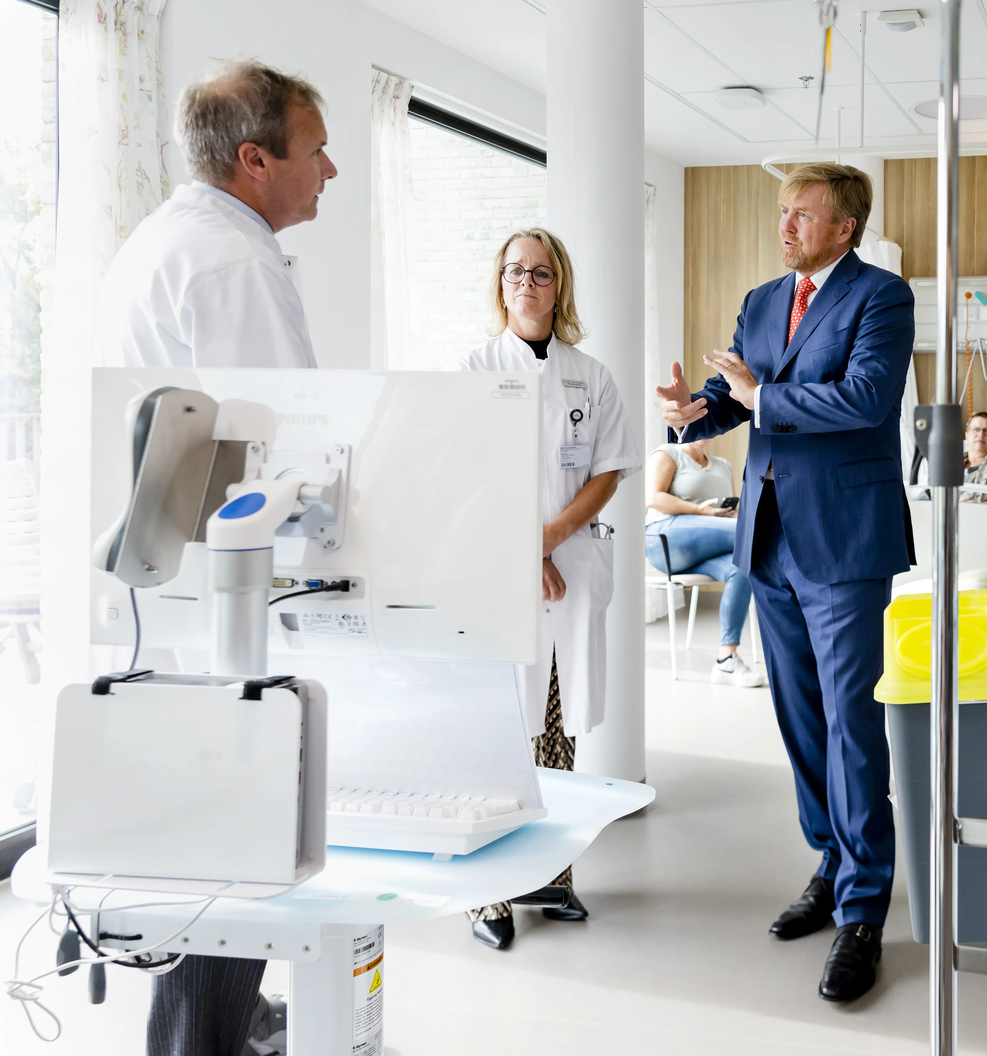Koning Willem-Alexander kreeg dinsdag onder meer een rondleiding door het ziekenhuis. Zo sprak hij er met medewerkers van de afdeling oncologie over het thuis organiseren van chemotherapie.