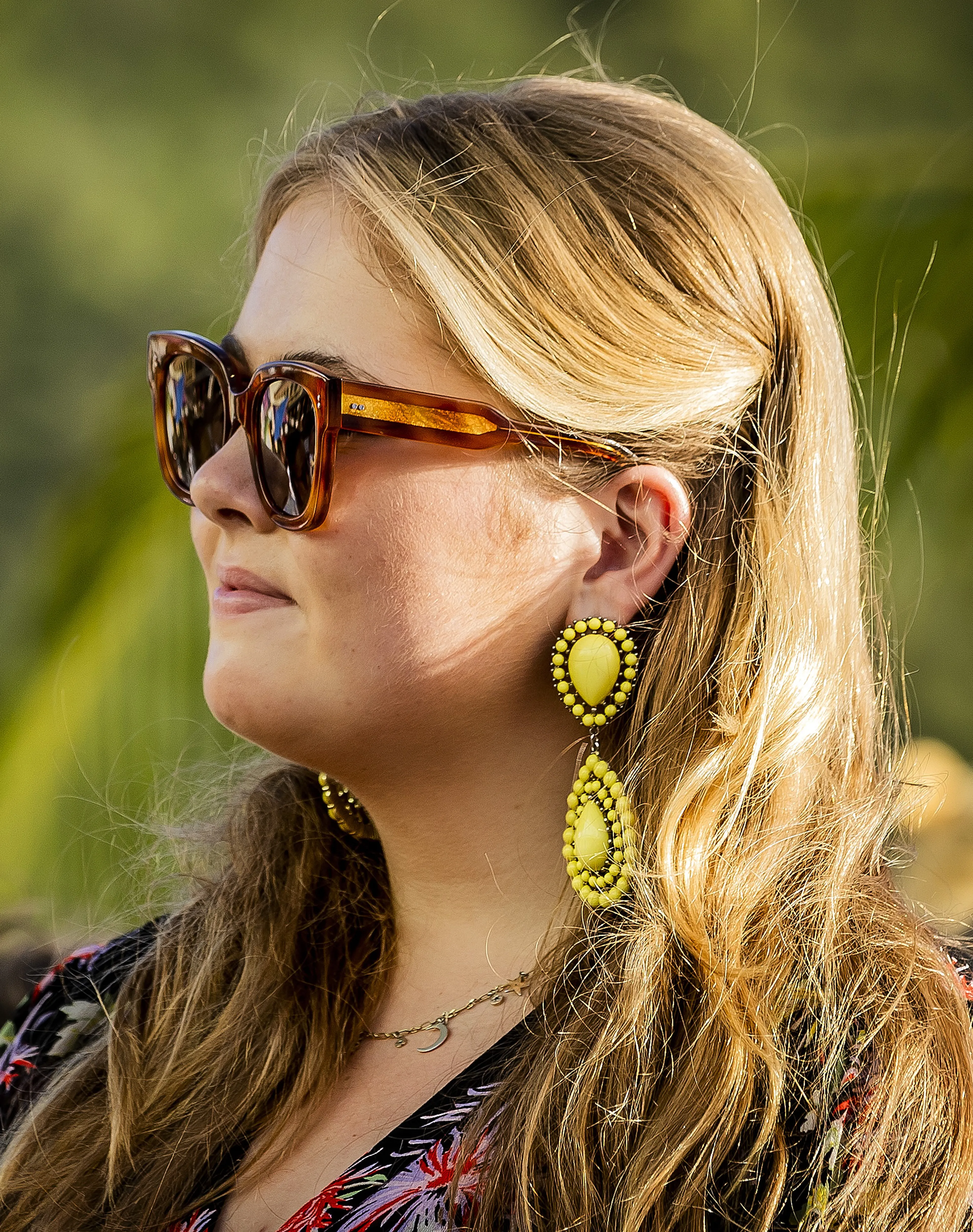 Voor een bezoek aan de Caribische eilanden haalt ze haar kleurrijke looks met bijpassende accessoires uit de kast. "Grote oorringen, grote oorhangers, veren, bloemen: alles zagen we in haar oren verschijnen. Eén van de meest opvallende oorbellen die Amalia op de Cariben droeg wat mij betreft waren de dancing jellyfish van Nederlandse makelij. Het zijn kwallen gemaakt van roggeleer. Dat zijn van die hele speciale materialen die op zo'n manier perfect matchen bij de outfit. Ik word hier heel blij van."