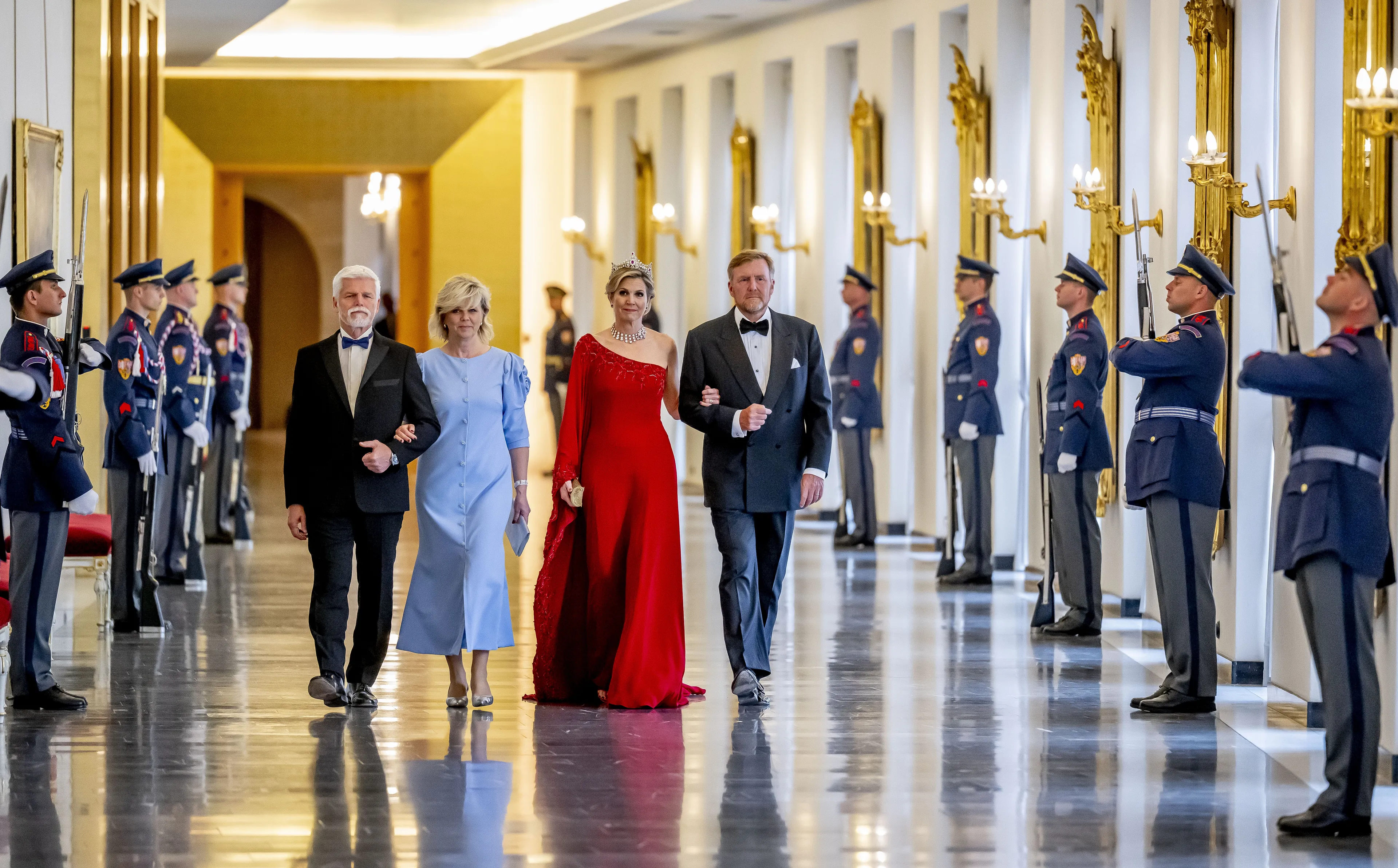 Via de witte corridor verplaatst het gezelschap zich vervolgens naar de Noordervleugel, waar de passade plaatsvindt. Iets na achten begint dan het staatsbanket met een toespraak van koning Willem-Alexander en president Pavel.