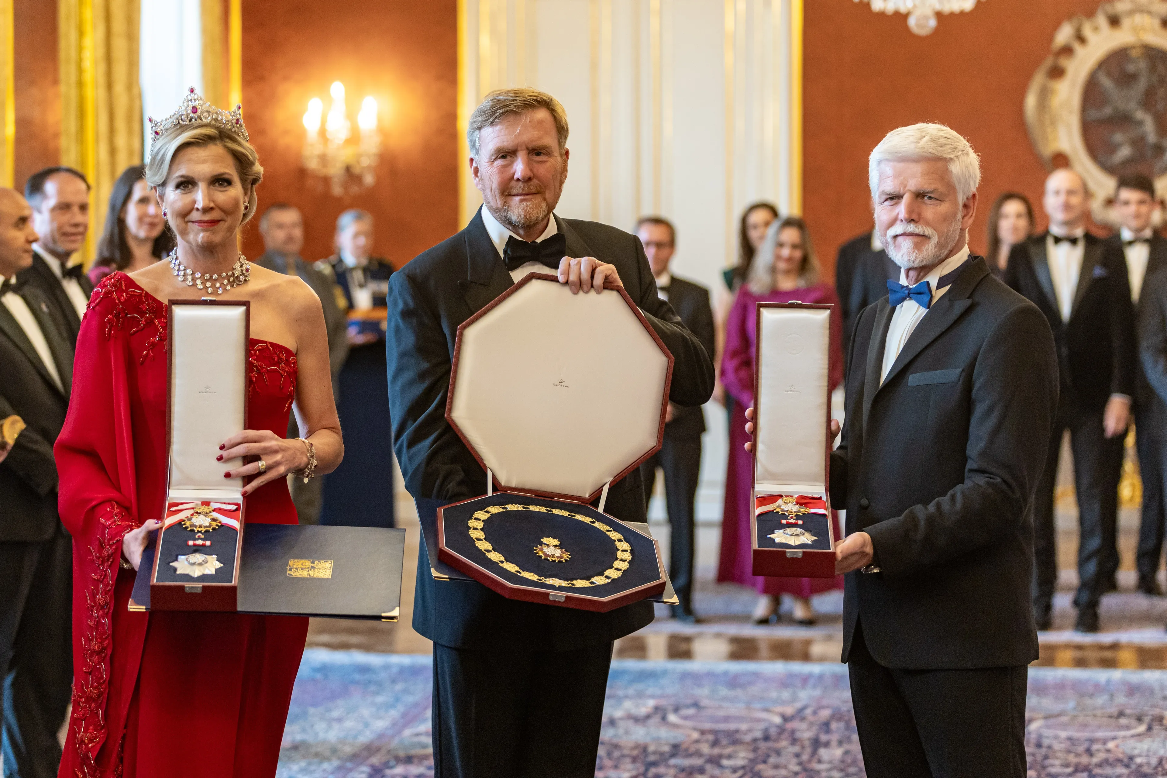 Koning Willem-Alexander krijgt uit handen van president Pavel een onderscheiding in de hoogste Tsjechische ridderorde: de Orde van de Witte Leeuw, Eerste Klasse met de Keten. Koningin Máxima krijgt in dezelfde orde de Orde van de Witte Leeuw, een Eerste Klasse onderscheiding. President Pavel ontvangt het Ridder Grootkruis in de Orde van de Nederlandse Leeuw uit handen van de koning. Ook zijn echtgenote mevrouw Pavlova krijgt de Huisorde van het Koninklijk Huis, de Kroonorde, rang: Grootkruis.