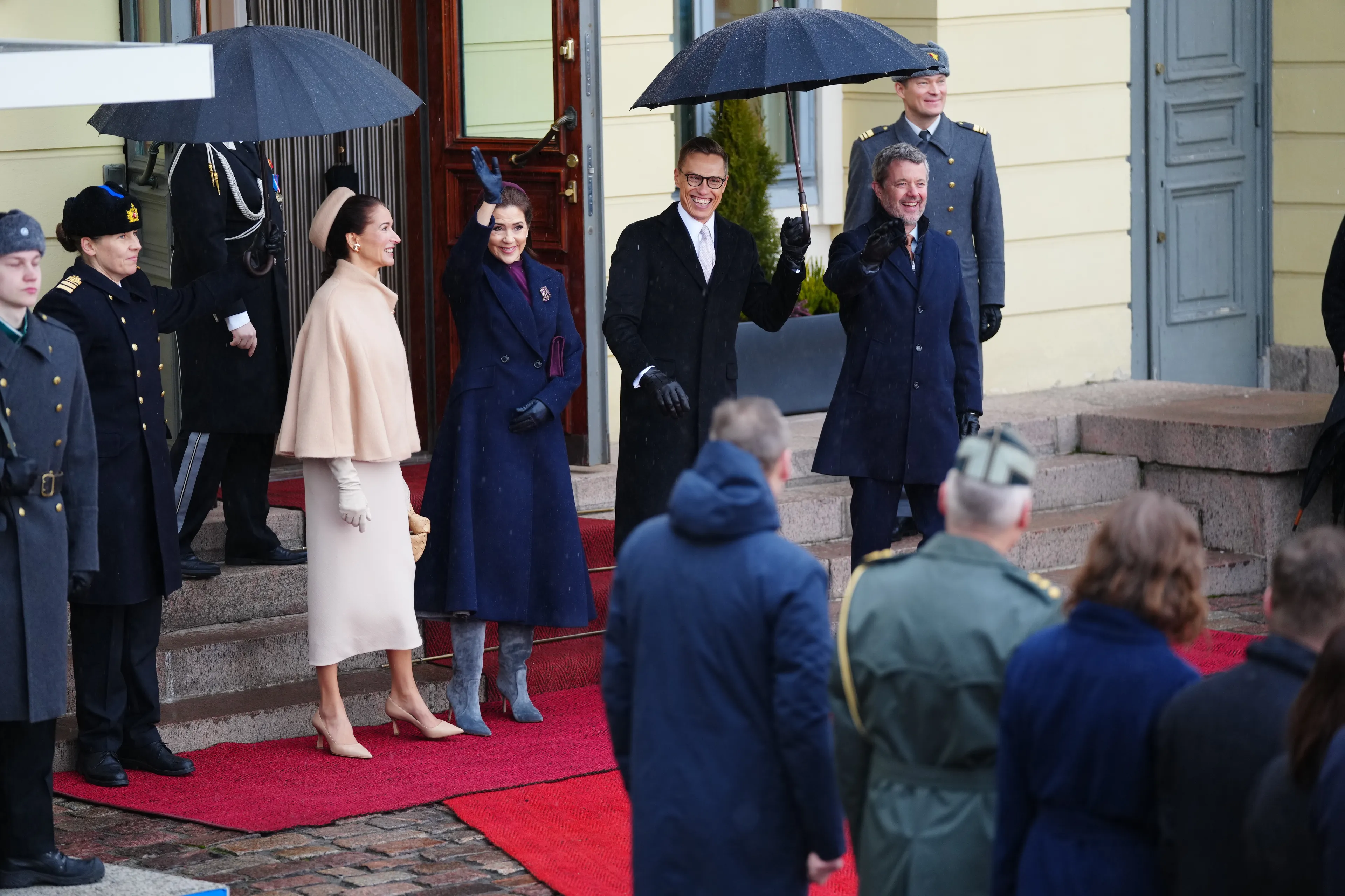 Zoals gebruikelijk bestaat de start van een staatsbezoek uit veel ceremonieel. Koning Frederik en koningin Mary werden ontvangen door de Finse president Alexander Stubb en zijn echtgenote Suzanne Innes-Stubb. Door de heren werd de erewacht geïnspecteerd, er vond een welkomstreceptie plaats, het gastenboek werd ondertekend en de geschenken werden uitgewisseld. De stellen leken het op de foto's goed met elkaar te kunnen vinden.