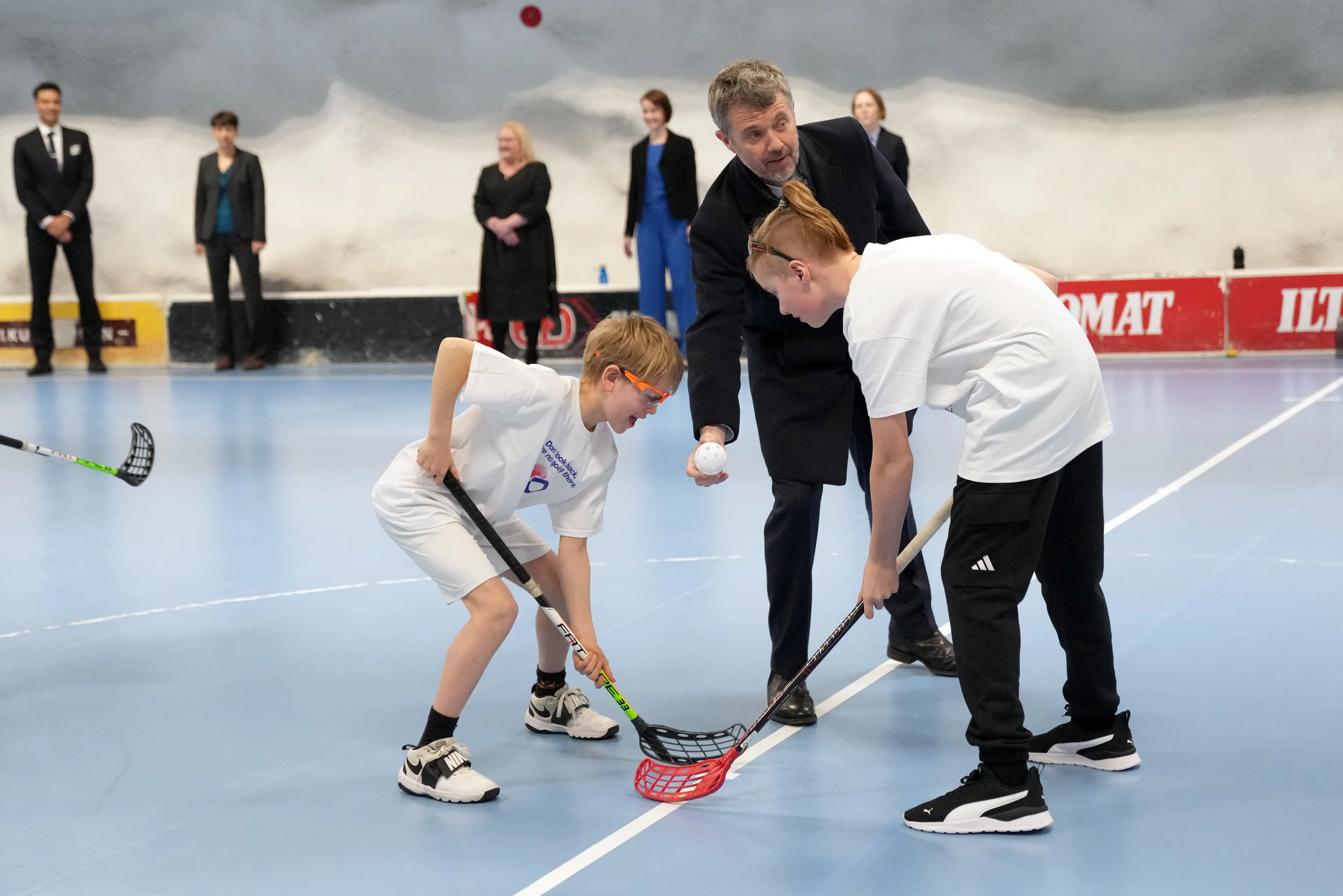 Tijdens de lunch kwam het gezelschap weer samen waarna ze met elkaar op pad gingen. Het paar kreeg een rondleiding in de schuilplaats bij het burgerbeschermingskamp Merihaka. Het dient als bescherming tijdens crisissituaties maar wordt in vredestijd gebruikt voor recreatieve doeleinden, zoals sportactiviteiten. Koning Frederik gaf tijdens het bezoek het startsein voor een wedstrijd floorball.
