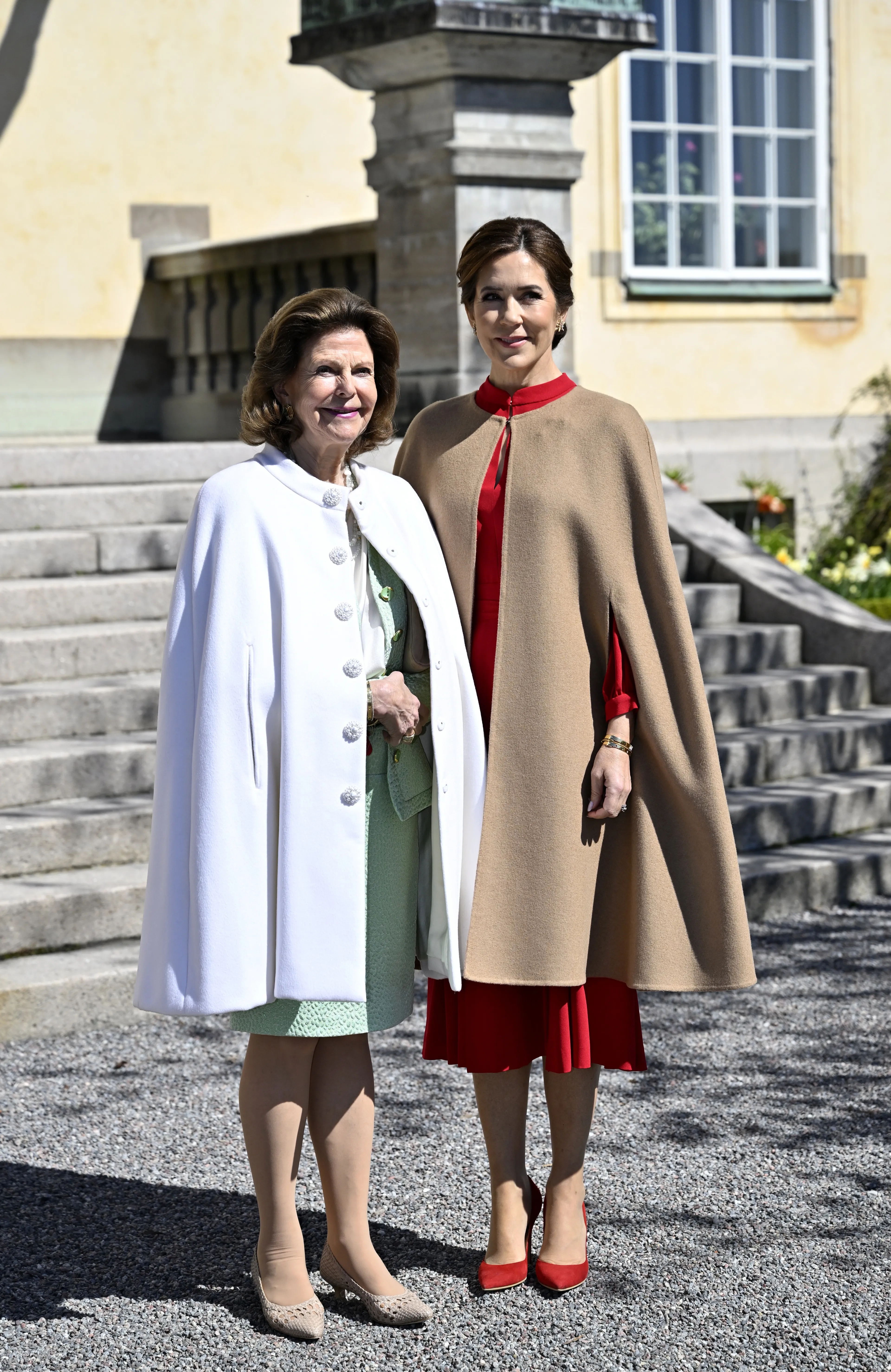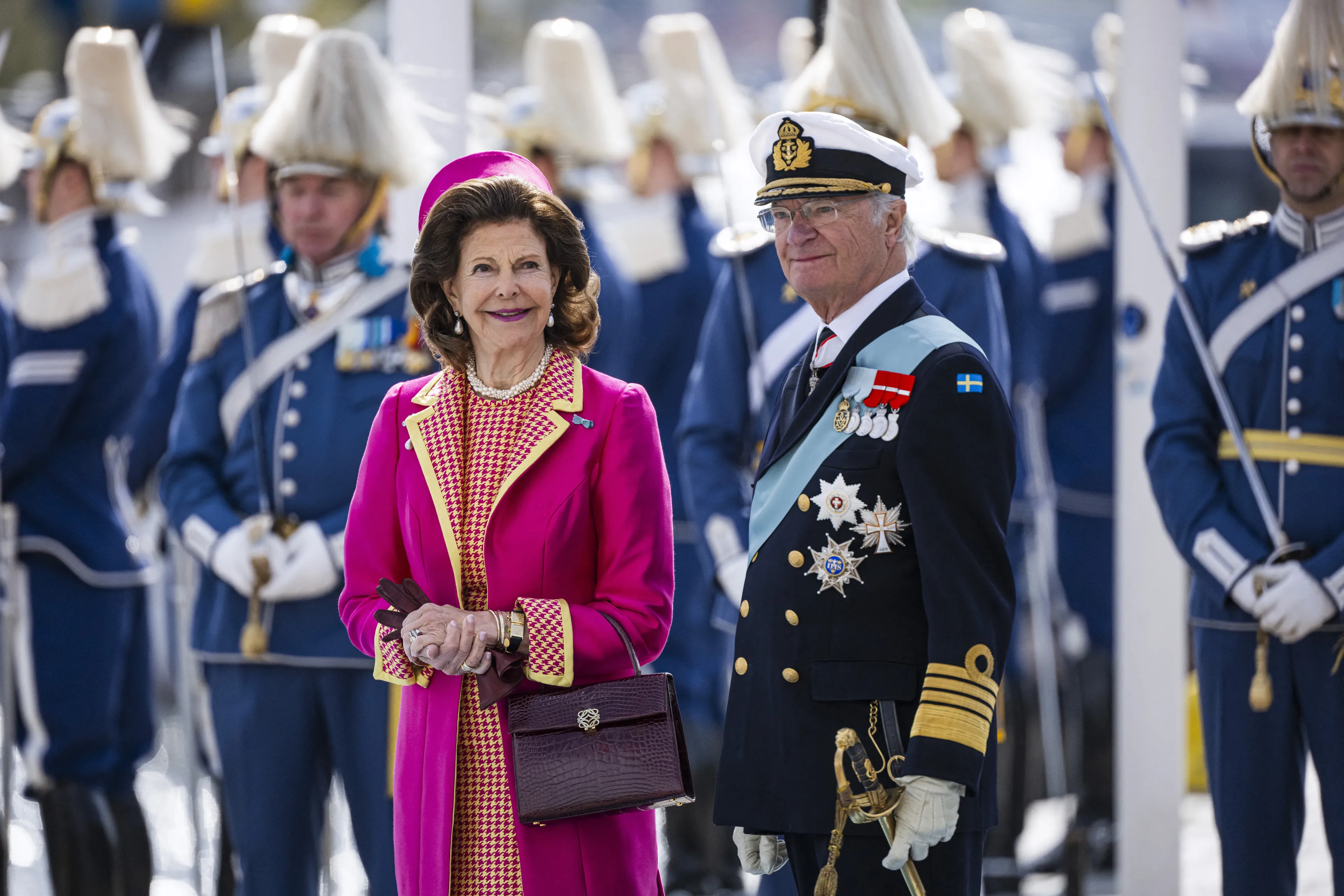 Koningin Silvia verscheen in een kleurrijke japon met bijpassende jas. De roze en gele jas valt op, zeker in combinatie met de geprinte japon eronder. Haar bordeauxrode tas is van het merk Loewe. De Deense koningin Mary droeg een witte japon van bouclé die ze in 2018 voor het eerst heeft gedragen. In haar haren zagen we een nieuwe hoed. Het is een donkerblauwe halfronde hoed met achterop een grote strik. Haar pumps van Gianvito Rossi hadden exact dezelfde kleur. Kroonprinses Victoria droeg een poederroze japon met bijpassende mantel.