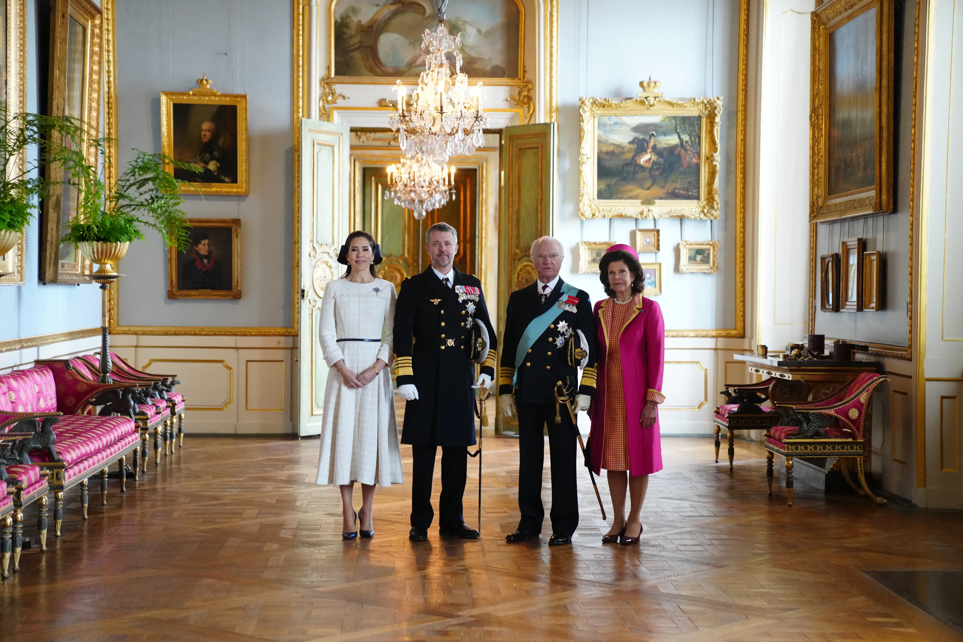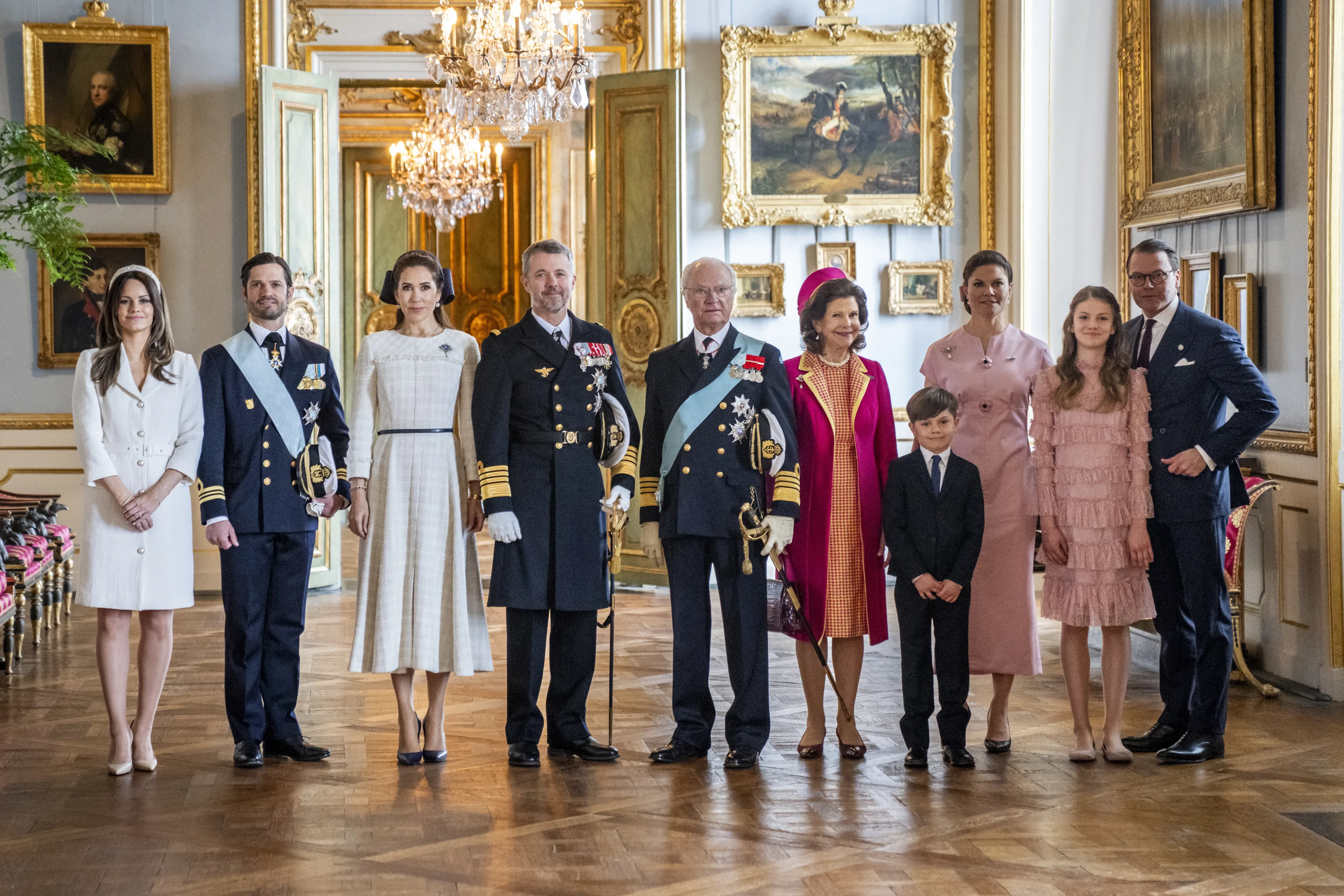 De Deense en Zweedse royals poseerden ook voor een eerste officiële foto van het staatsbezoek vanuit het Koninklijk Paleis. Hier kunnen we zien dat ook prinses Estelle, prins Oscar, prins Carl Philip en prinses Sofia aanwezig waren bij de ontvangst.