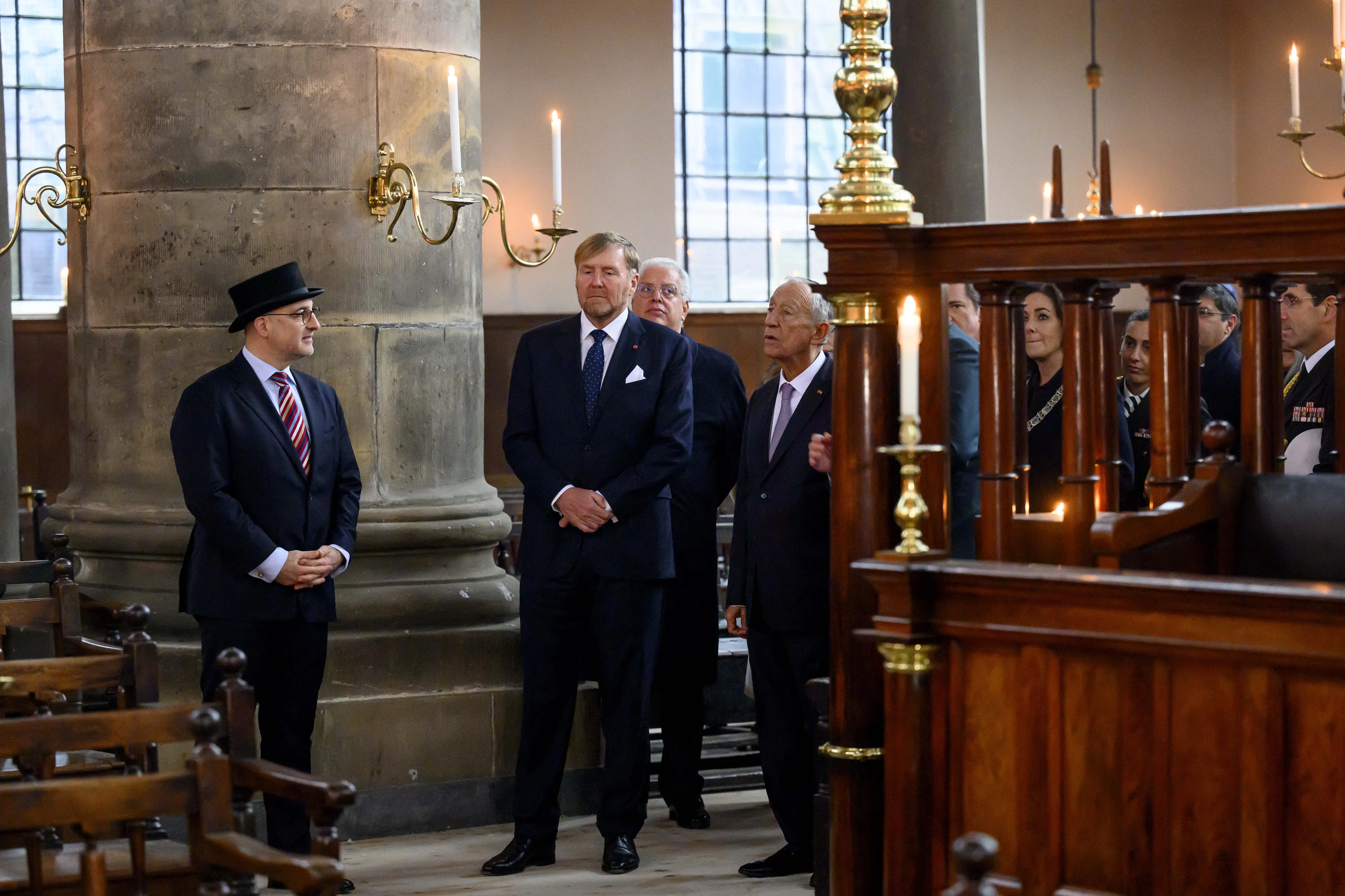 Later op de middag zijn Willem-Alexander en Marcelo Rebelo de Sousa in de Portugese synagoge in Amsterdam. Het bezoek is vooraf niet openbaar aangekondigd. In de hoofdstad is de beveiliging bij Joodse objecten opgeschroefd, naar aanleiding van de onrust vorige maand. Ook burgemeester Femke Halsema sluit aan bij het bezoek.
