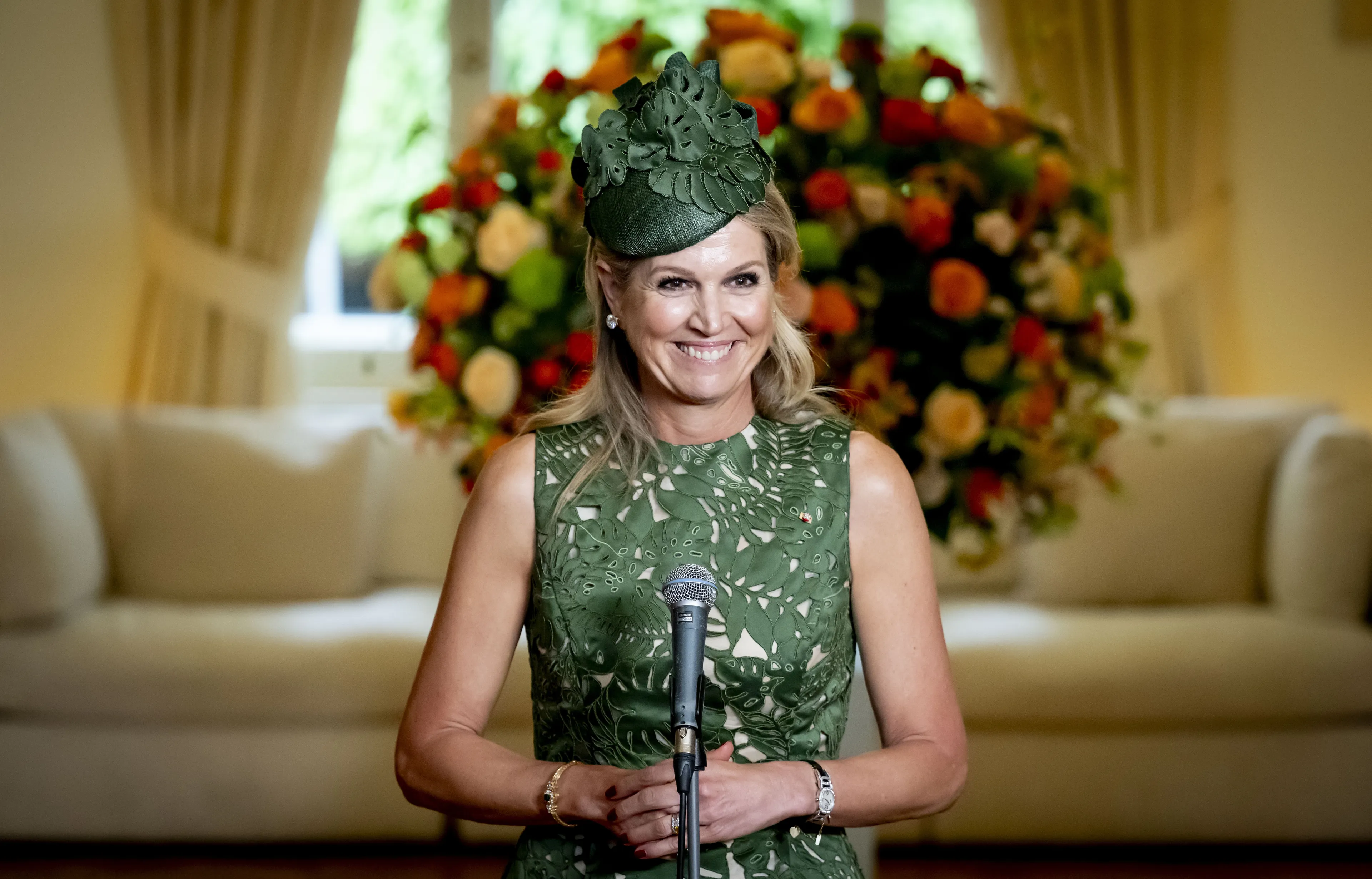 Koningin Máxima draagt vandaag een outfit die we kennen van Koningsdag 2024 in Emmen. De japon met opengewerkte details is van het Belgische modehuis Natan. Waren haar lokken gisteren nog opgestoken, vandaag draagt Máxima haar haar los in de krul.