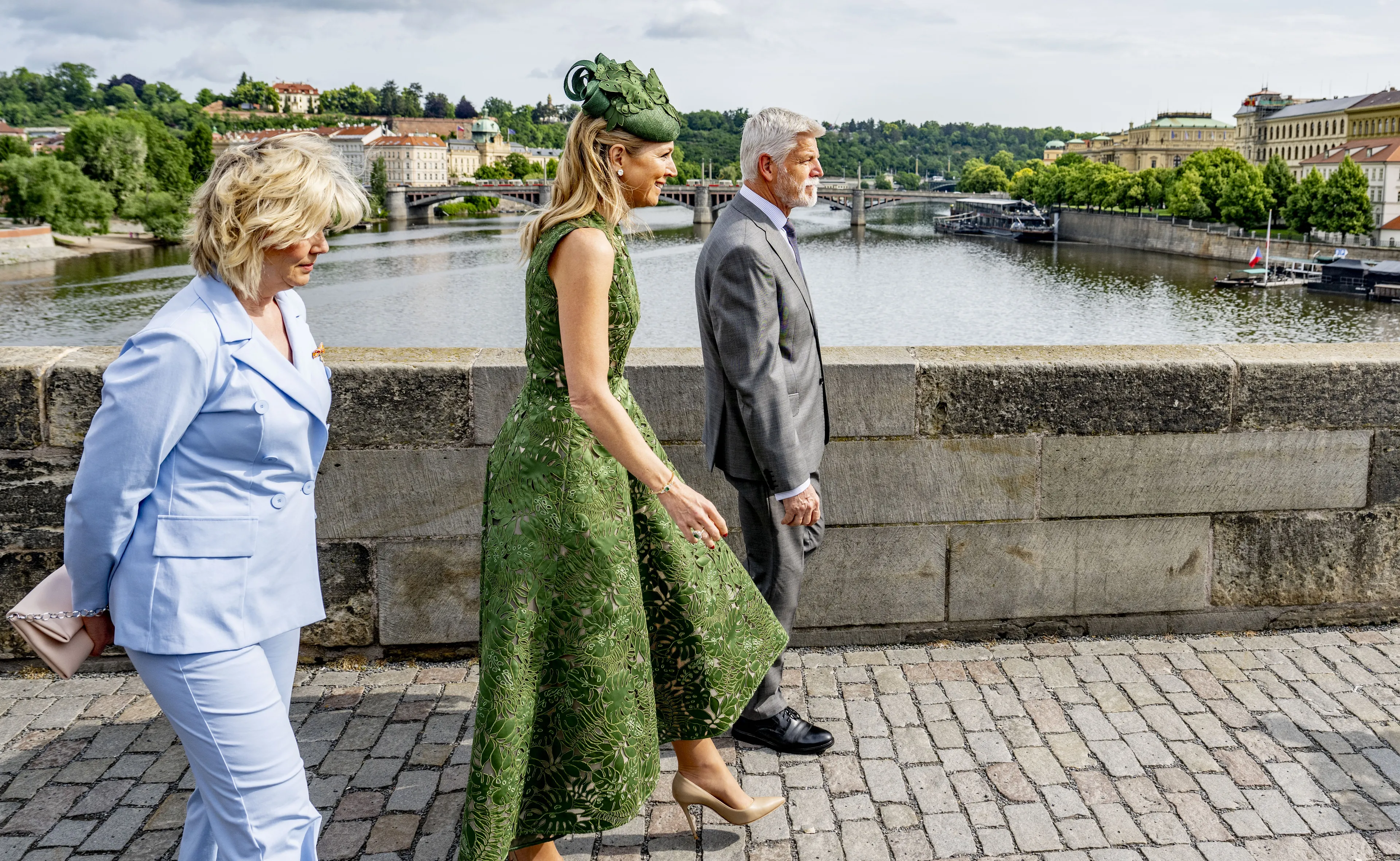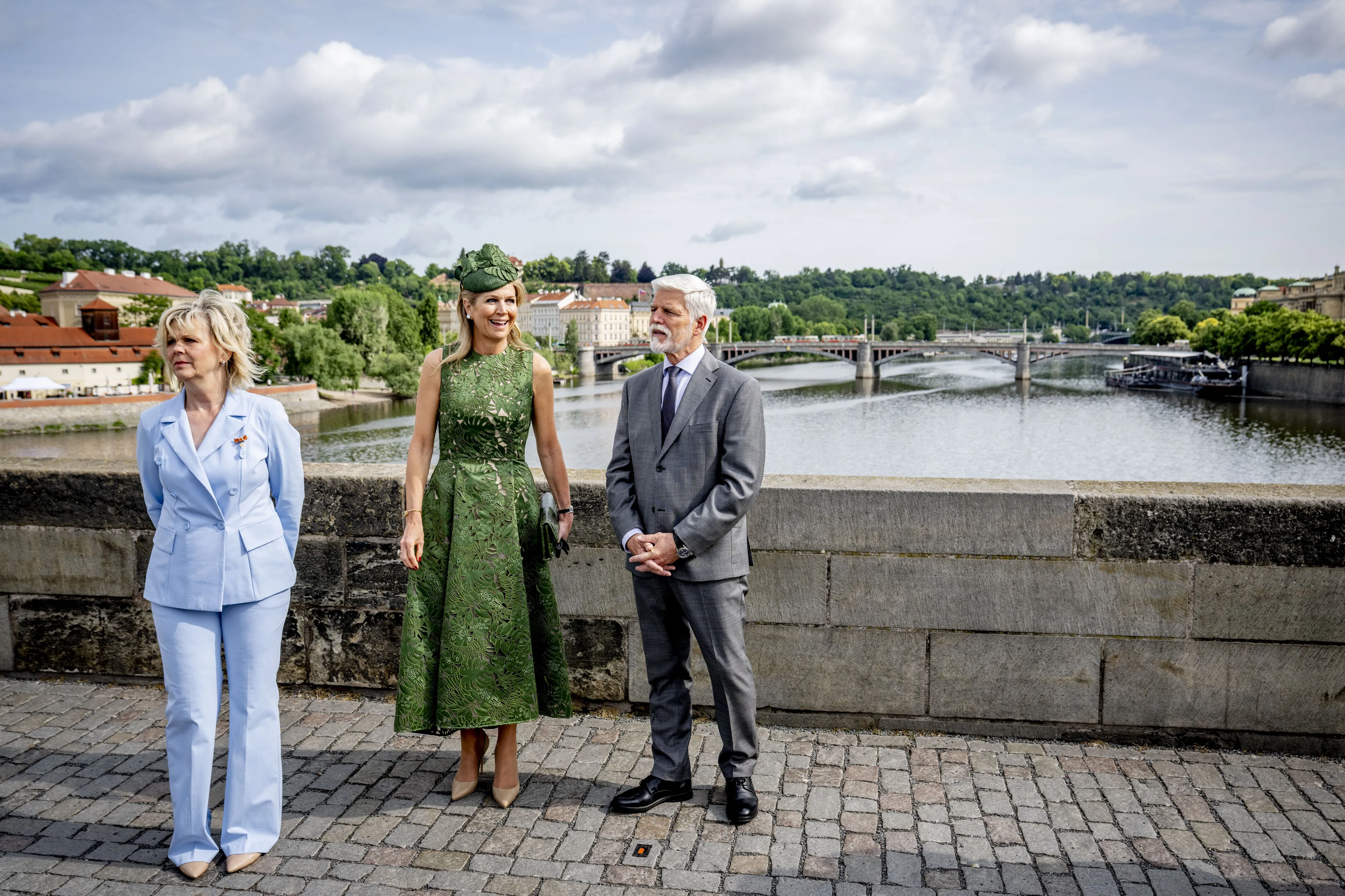 Koningin Máxima poseert in alle vroegte met president Pavel en zijn echtgenote op de Karelsbrug in Praag. Deze brug verbindt de wijken Malá Strana en Staré Město en zou volgens de overlevering al gebouwd zijn tussen 1357 en 1402. Het is een echte bezienswaardigheid in Tsjechië en populair bij toeristen.
