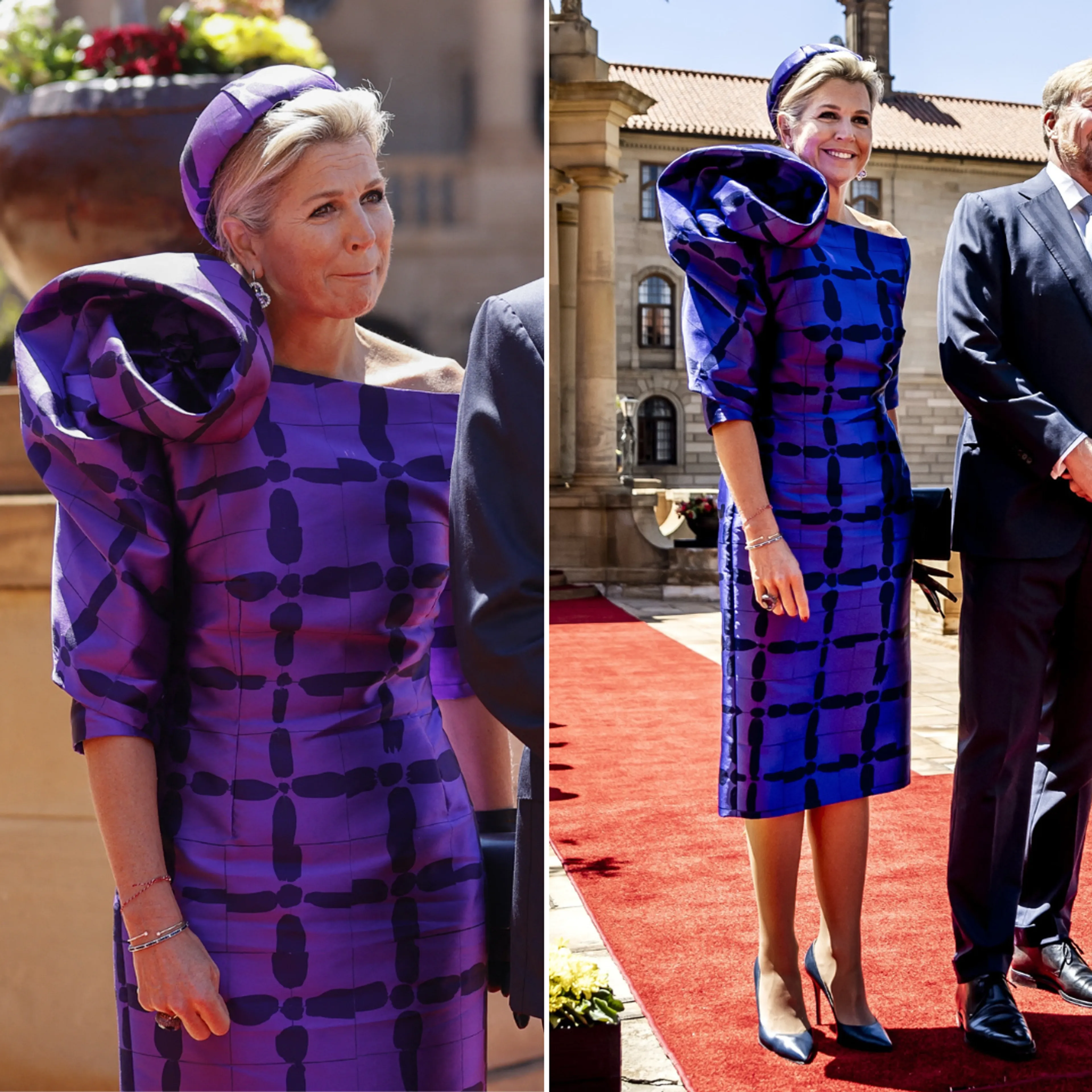 #2 De paarse jurk van Natan met groot schouder-detail. Tijdens het staatsbezoek aan Zuid-Afrika in oktober dit jaar verscheen koningin Máxima in een nieuwe paarse japon van Natan. De jurk viel op door de print én de grote roos op de schouder.