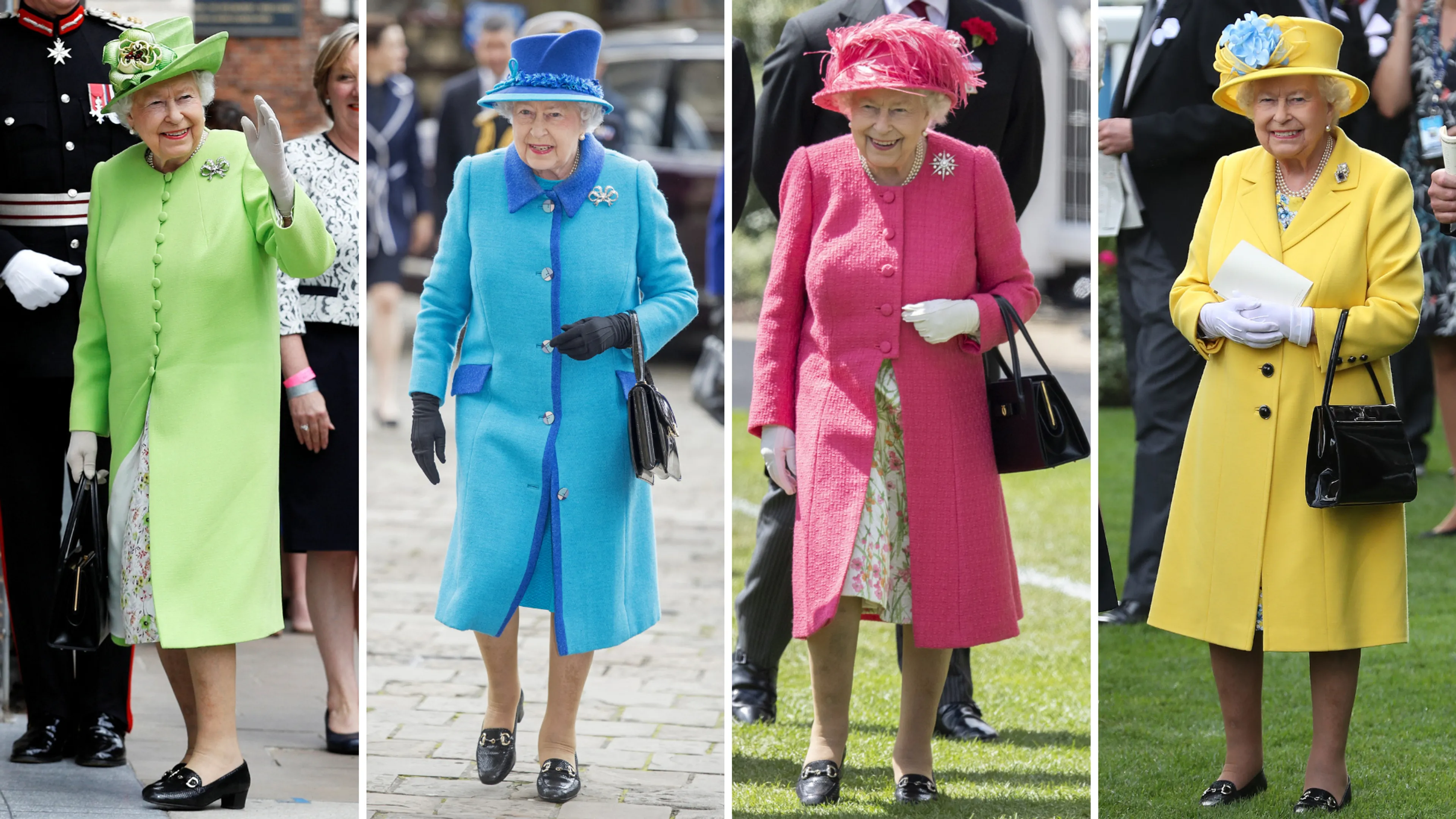 Het zijn vooral de felgekleurde outfits die we kennen van koningin Elizabeth. Van top tot teen verscheen de koningin in het gifgroen, kanariegeel of donkerpaars. Geen kleur was haar te gek. Ze droeg deze kleuren niet zomaar, want ze had een duidelijke reden om dit te doen. Schoondochter hertogin Sophie legt uit waarom Elizabeth regelmatig voor een fel kleurenpallet koos: "Ze moet opvallen zodat mensen kunnen zeggen: 'Ik heb de koningin gezien.' Iemand wil kunnen zeggen dat ze een stukje van de hoed van de koningin hebben gezien toen ze langsliep."