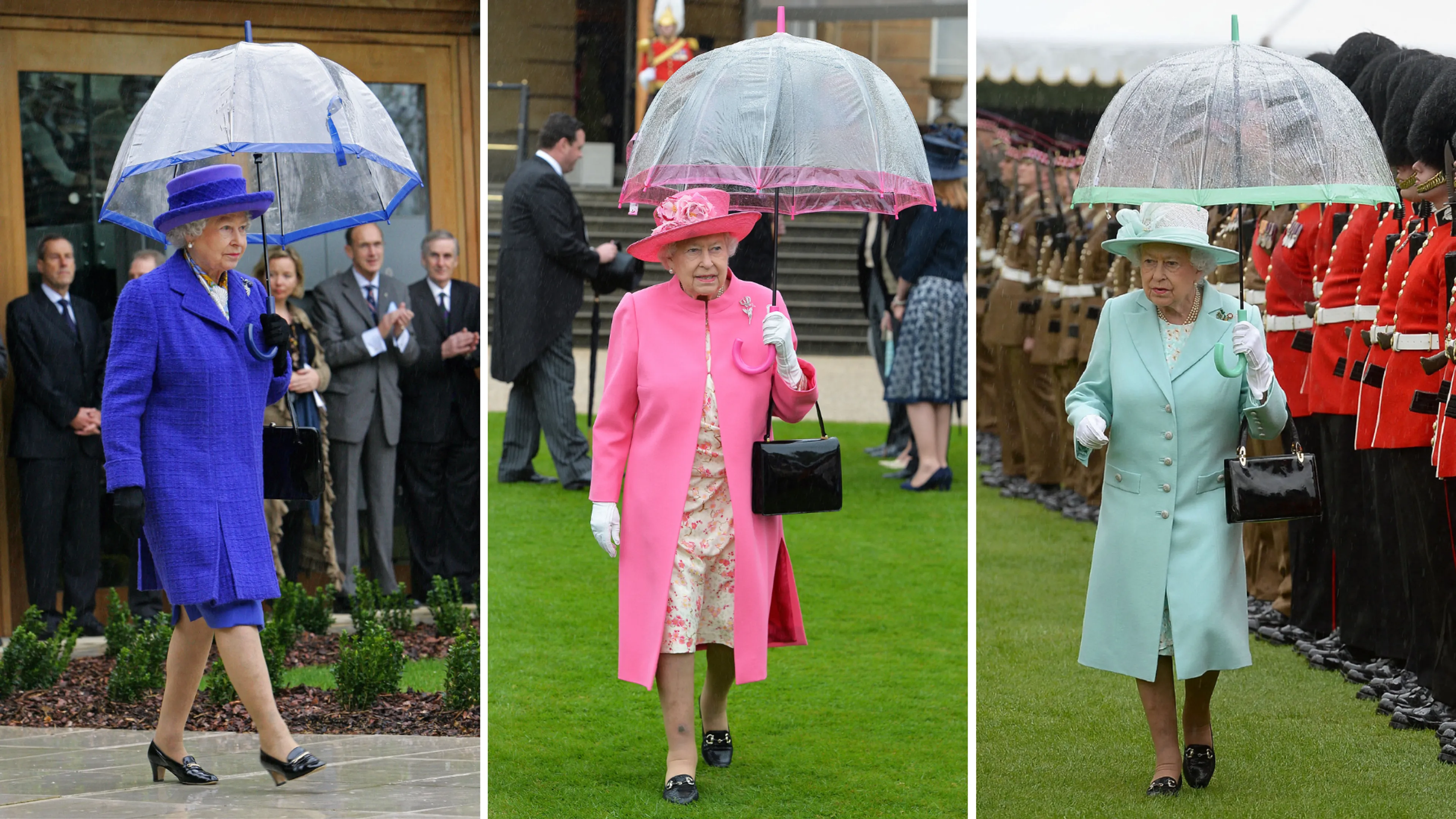 En als het regent? Dan zag de koningin er nog steeds stijlvol uit en zorgde ze dat haar paraplu dezelfde kleuren als haar outfit had. Hoe slim is dat?