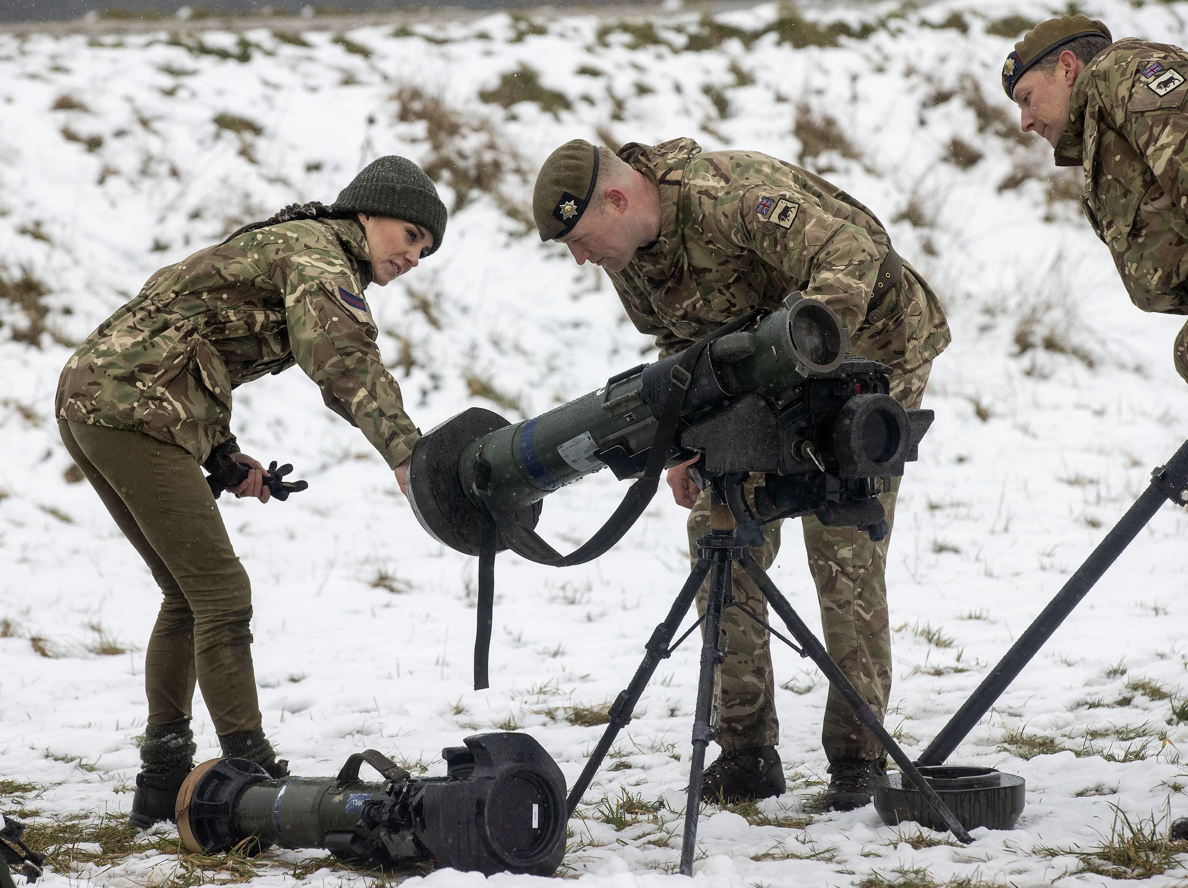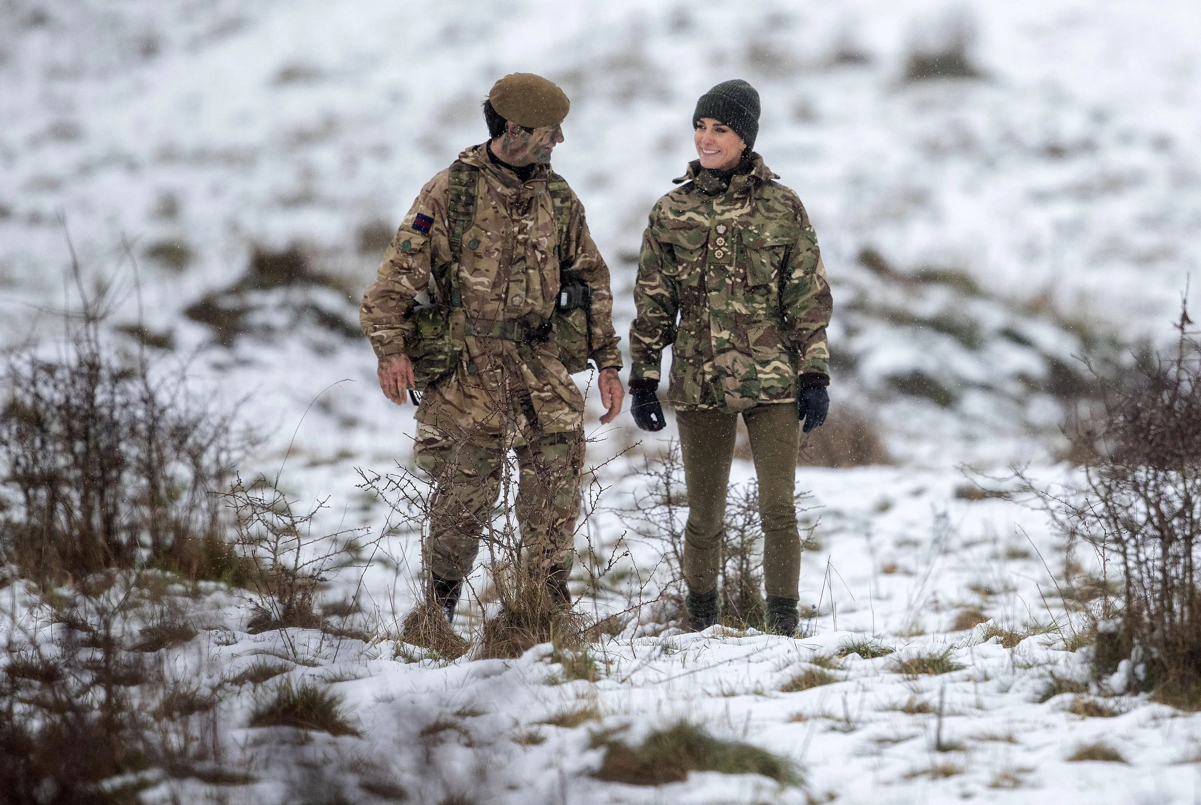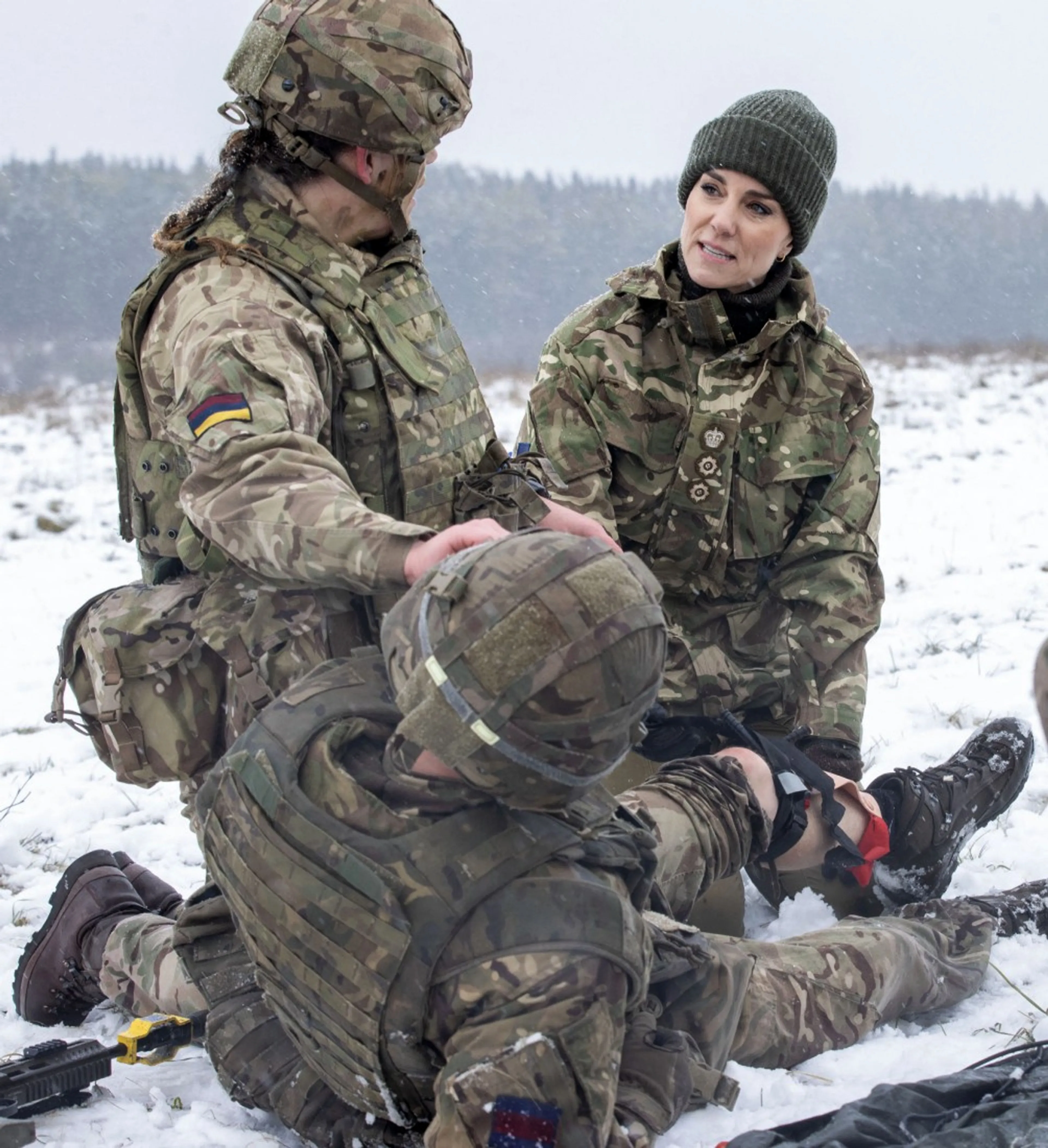 Prinses Catherine nam woensdag een kijkje bij een oefening van de Irish Guards in Salisbury Plain. De vrouw van de Britse prins William arriveerde, onder zwaar vallende sneeuw, in een bijpassende legeroutfit. Tijdens haar bezoek deed Catherine mee aan een EHBO-training. Daar leerde zij over verschillende manieren van verband aanleggen. Ook zag de prinses van Wales hoe slachtoffers in het veld verzorgd worden door legermedici.