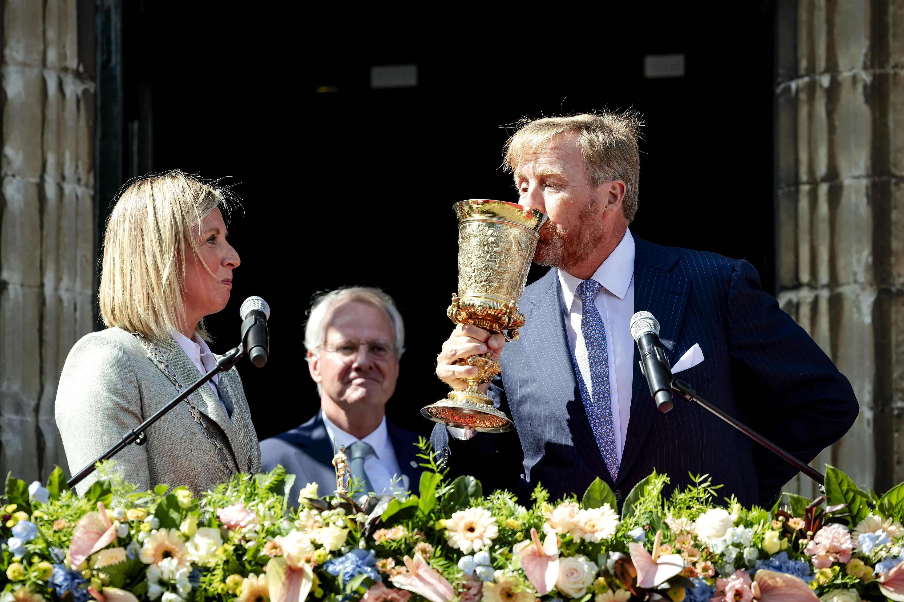 Het koningspaar wandelt naar het Oude Stadhuis van Veere, waar ze op het bordes de vergulde zilveren beker van Maximiliaan van Bourgondië ontvangen uit de hand van de burgemeester. Leuk feitje: de beker is in de 16e eeuw in opdracht van keizer Karel V gemaakt en door Maximiliaan van Bourgondië aan de stad geschonken. De Markies van Veere en Vlissingen is de enige die uit de beker mag drinken en doet dit tijdens zijn of haar eerste bezoek als vorst aan Veere.