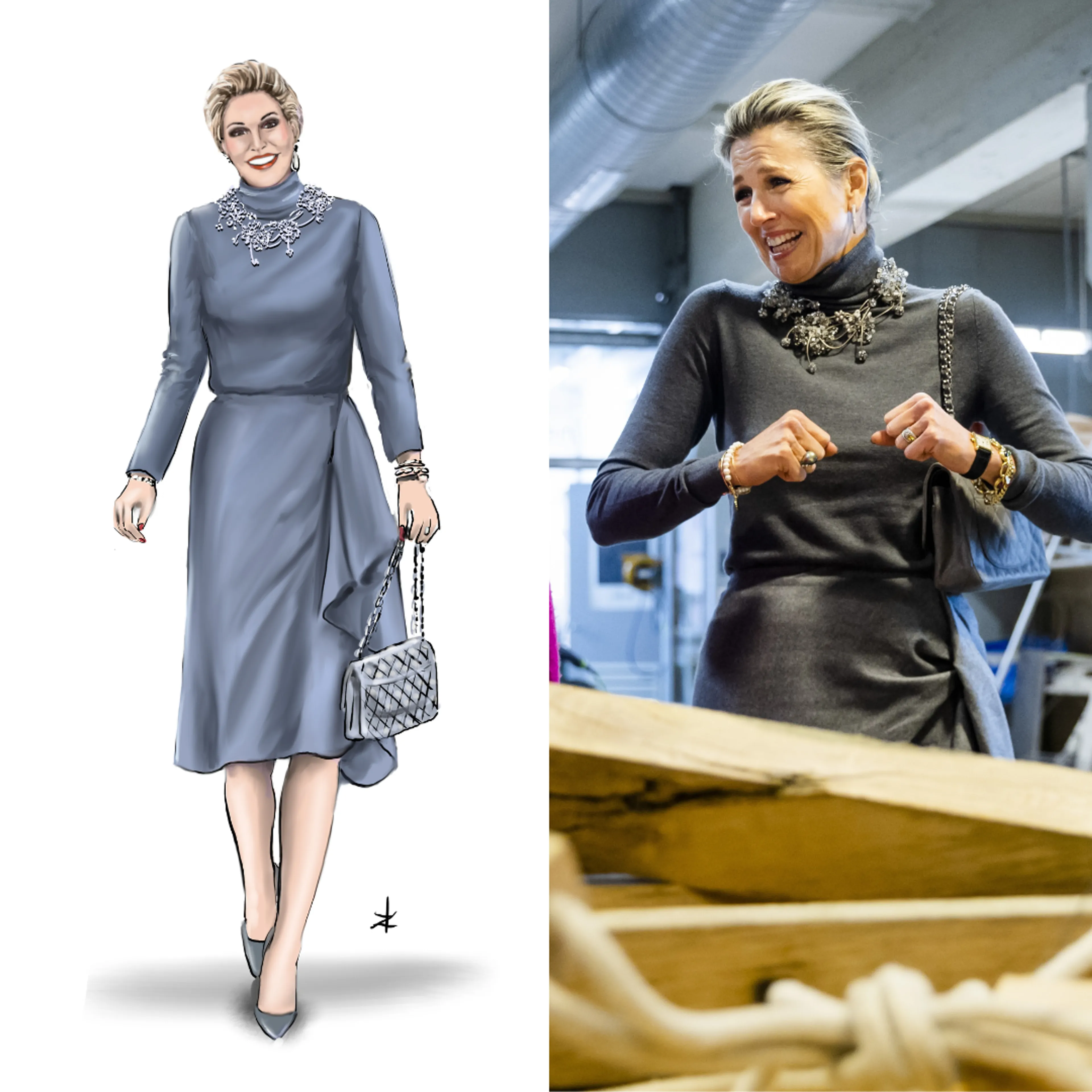 "In Eindhoven tijdens een werkbezoek droeg de koningin een grijze outfit met zo'n mooi collier van een Argentijnse ontwerper. Dat pimpte de hele outfit op", vertelt Linda. Het collier heeft ze ook gedetailleerd getekend. "Juwelen hebben allemaal schakeltjes en steentjes, als ik die in detail wil tekenen dan ben ik daar wel een dag mee bezig."