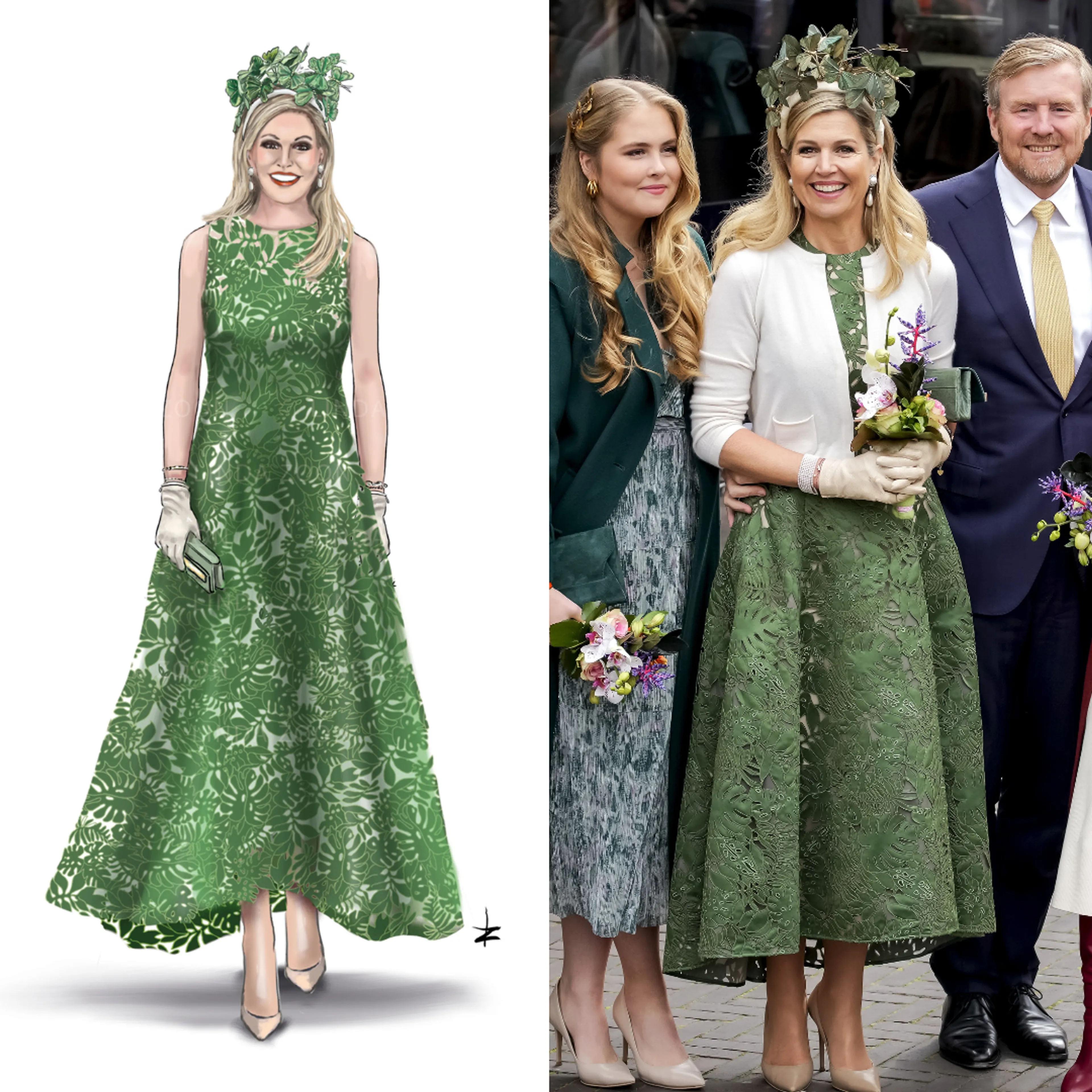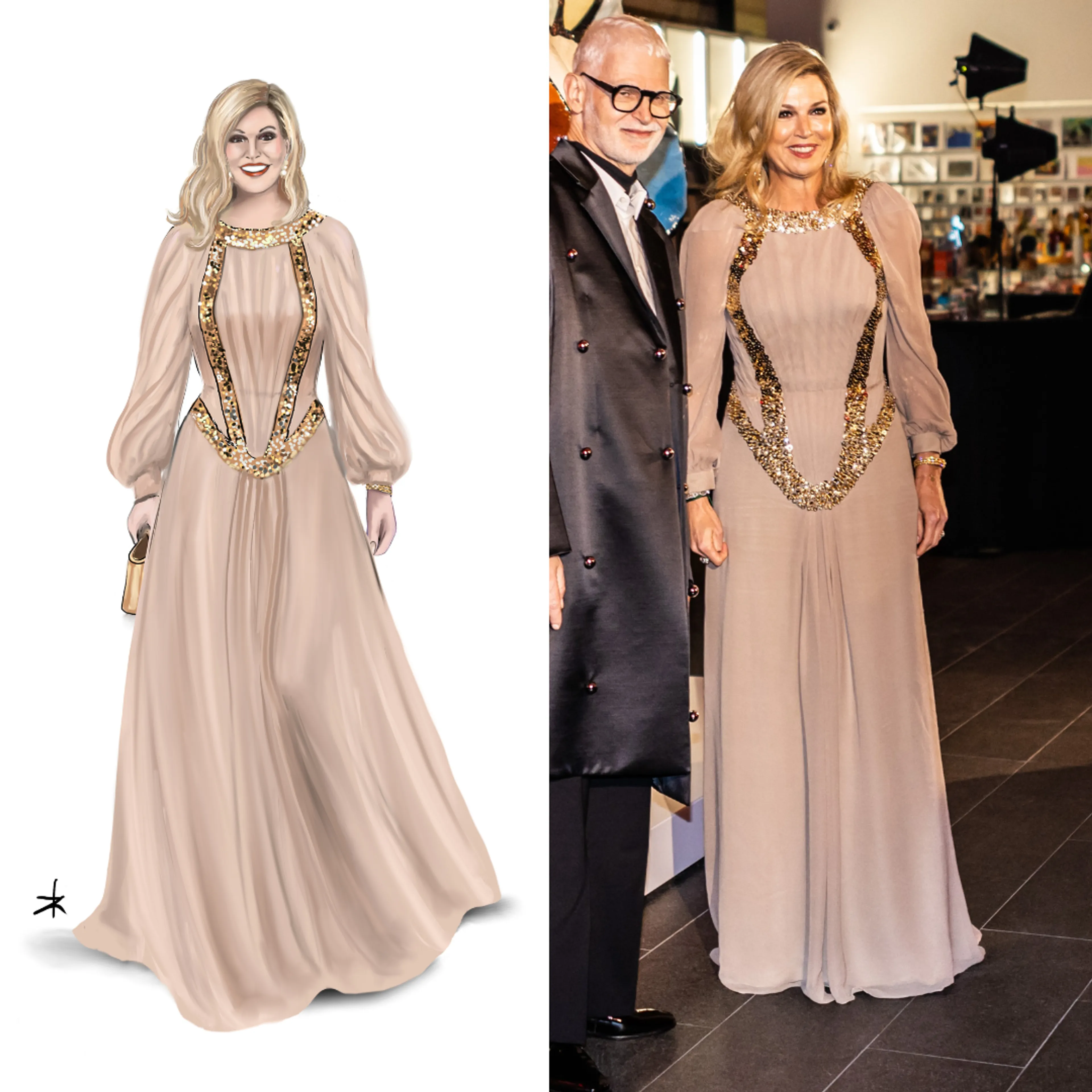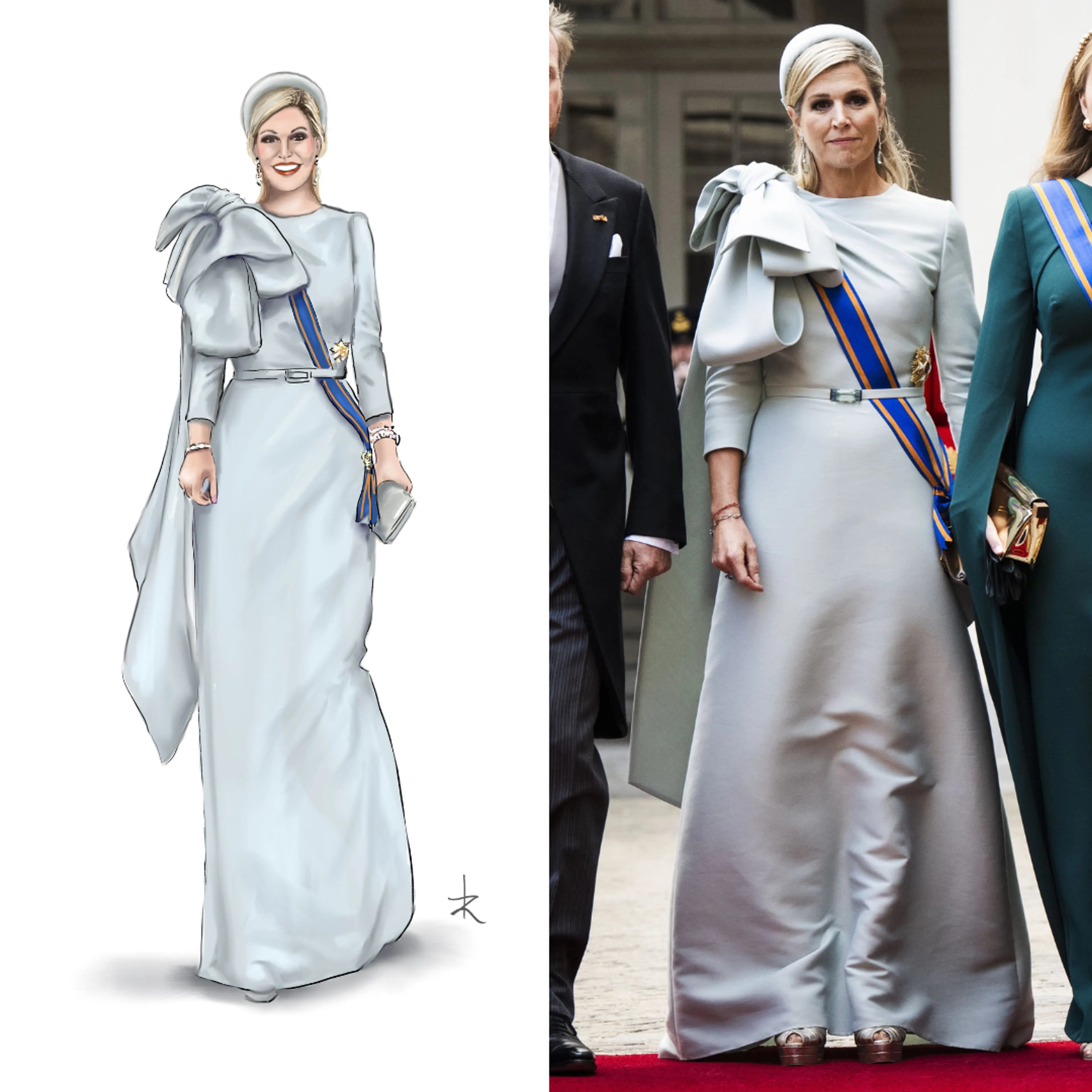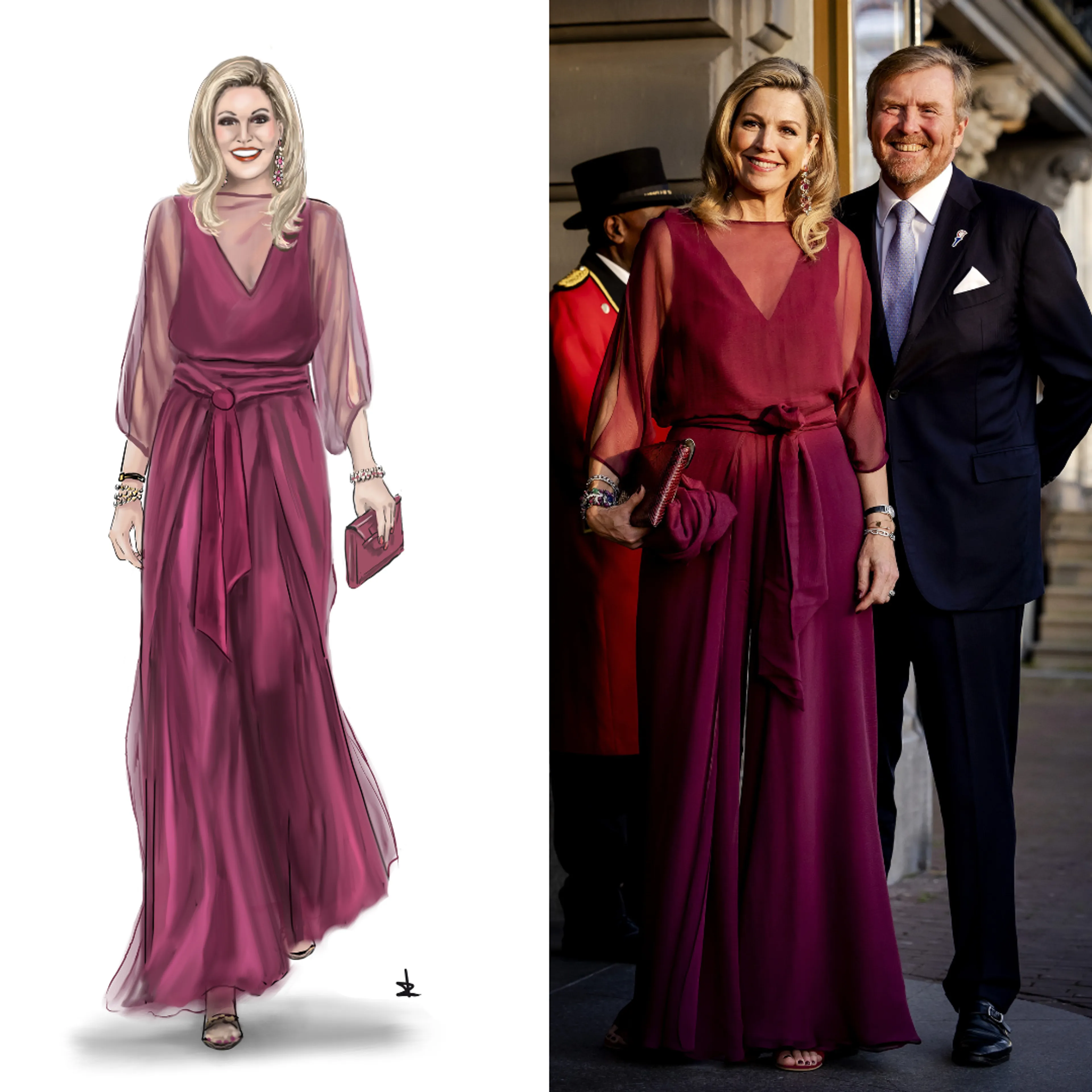 We nemen het afgelopen modejaar door aan de hand van de favoriete outfits én de bijpassende tekeningen. "Het viel mij op dat de koningin het afgelopen jaar best veel items heeft gerecycled", vertelt Linda. Al is haar favoriete outfit van het jaar toch echt een nieuwe creatie, en wel een van Jan Taminiau. "Met van die grote, mooie lijnen van goud. Geborduurd. Echt te gek."
