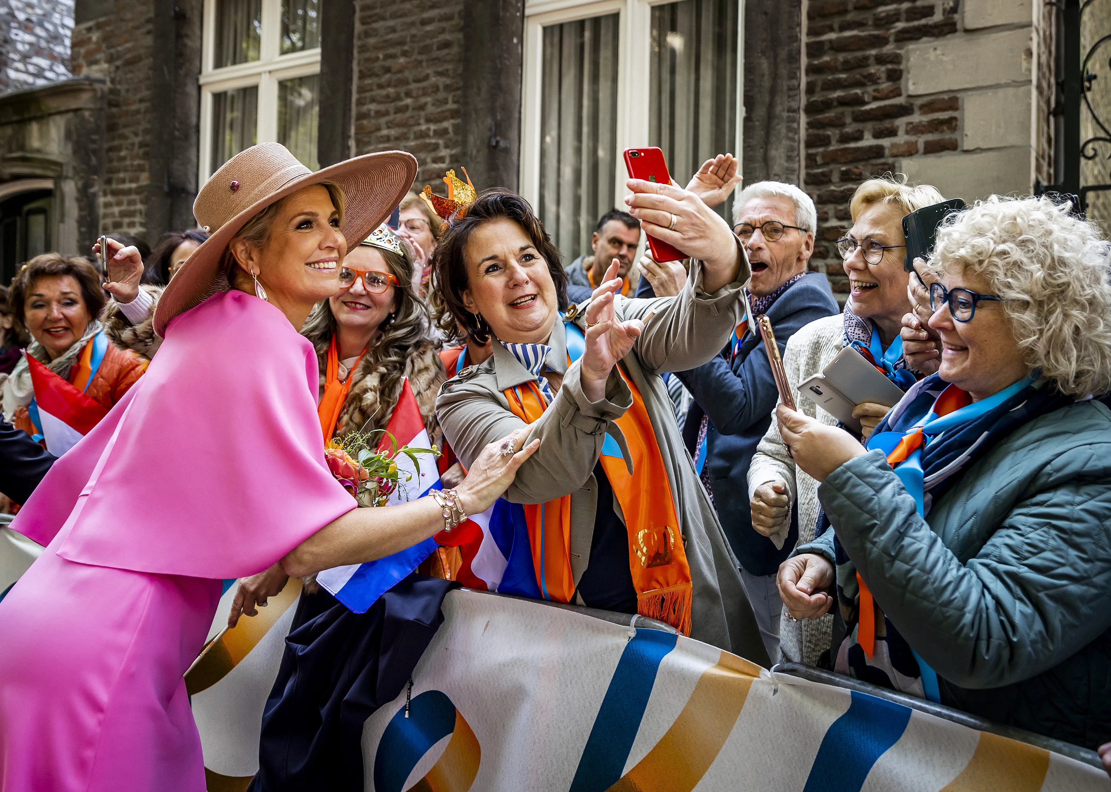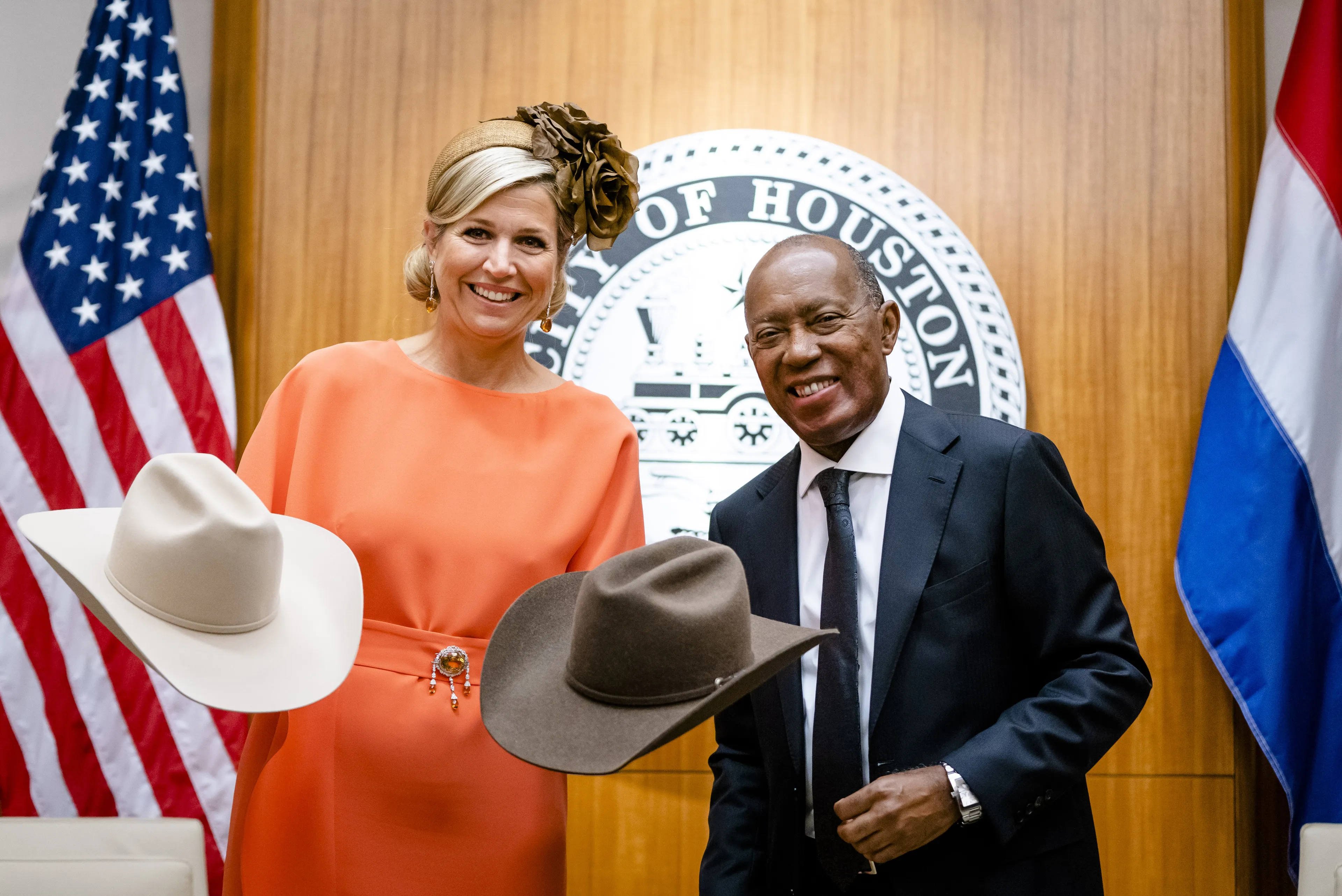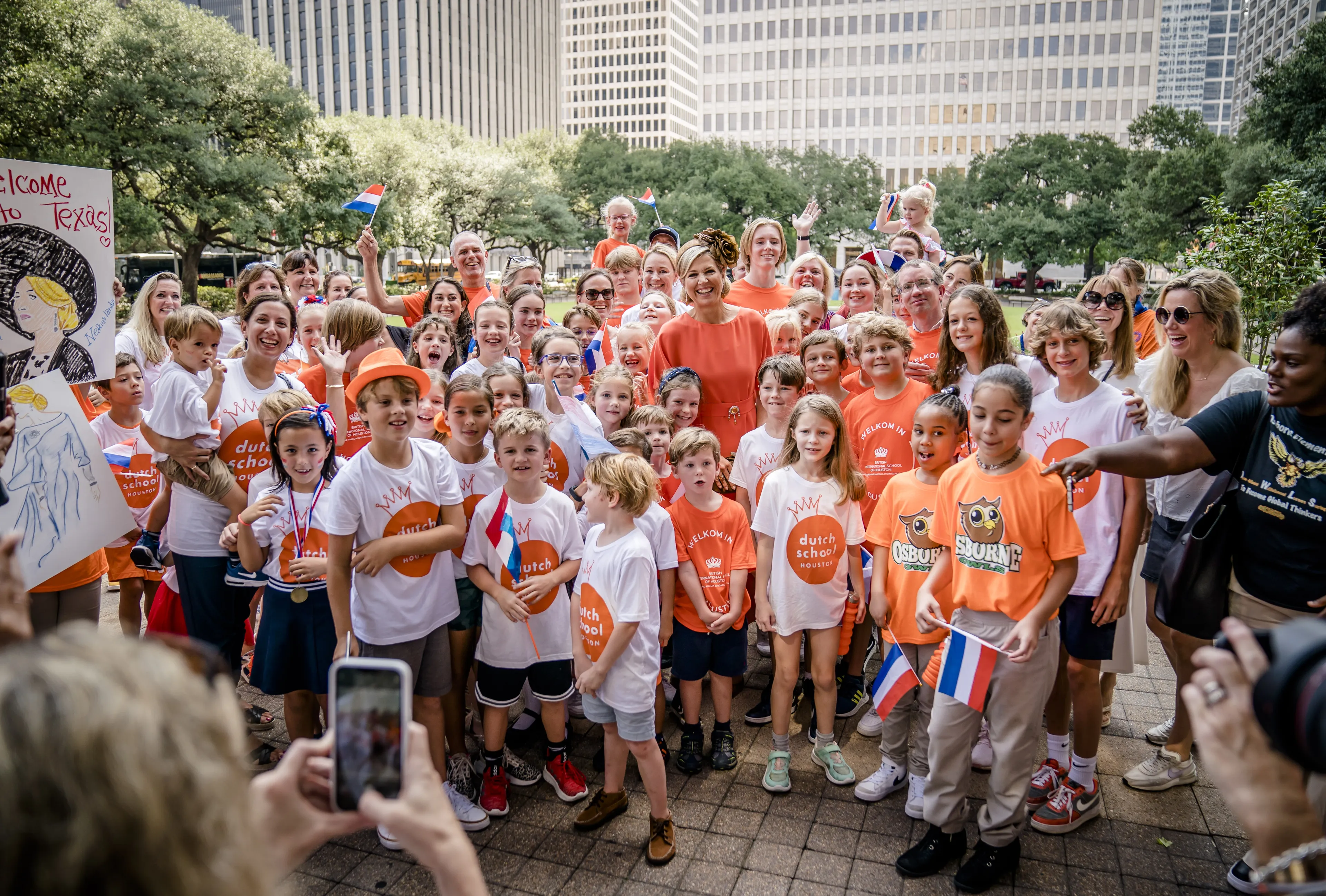 Koningin Máxima sluit haar werkbezoek vrijdag af in de stad Houston. Bij het stadhuis wordt zij opgewacht door Nederlandse kinderen die, net als de koningin, in het oranje gekleed waren.