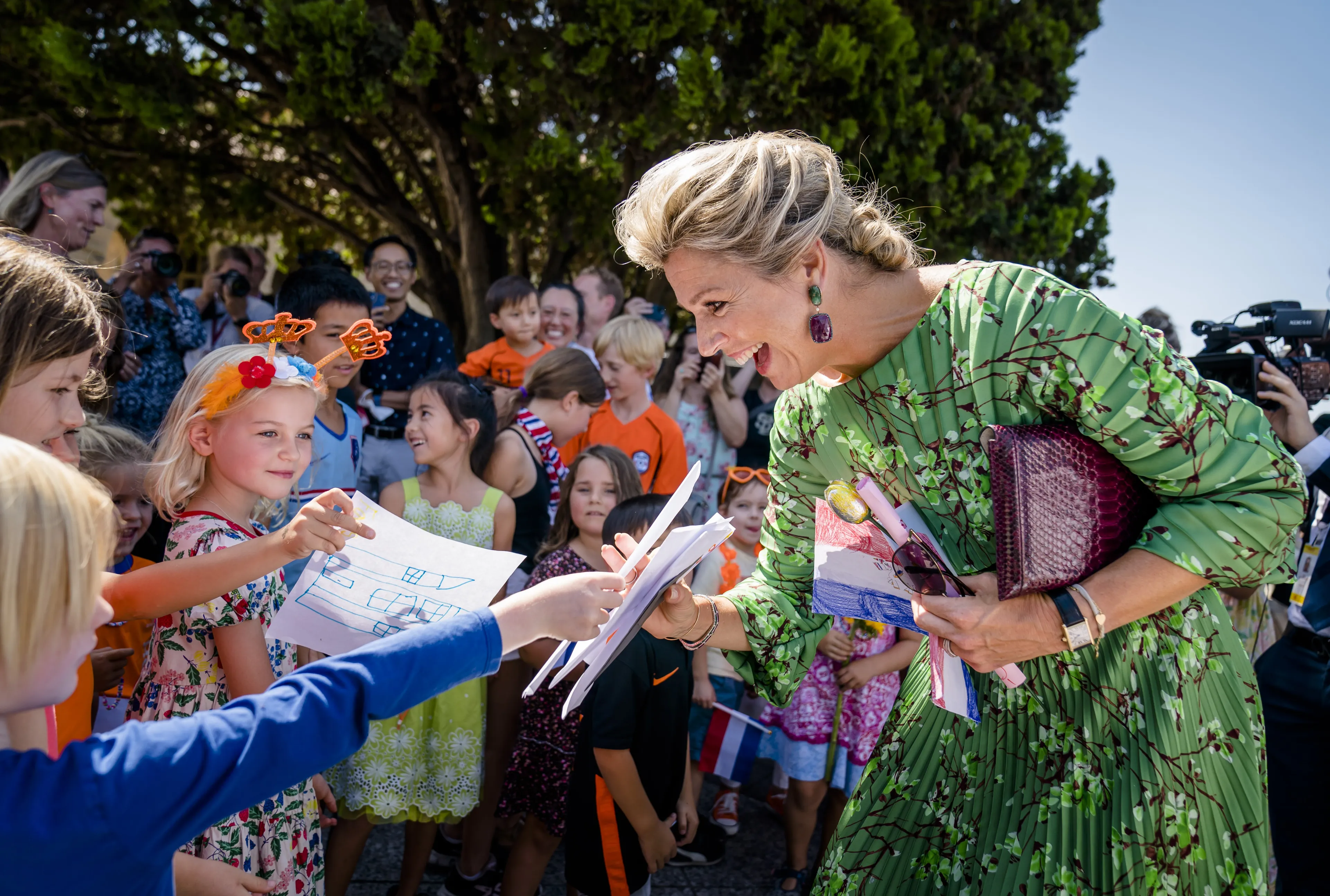 Op een Nederlandse school in Silicon Valley wordt de koningin overladen met cadeautjes van kinderen. Zo kreeg zij meerdere tekeningen, kaarten en zelfs een tulp van chocola. Van het laatstgenoemde presentje gaat Máxima naar eigen zeggen "smullen". De koningin wilde ook graag weten hoe de kinderen het leven in Californië ervaren. "Heel veel zon en heel warm denk ik", schatte ze in.