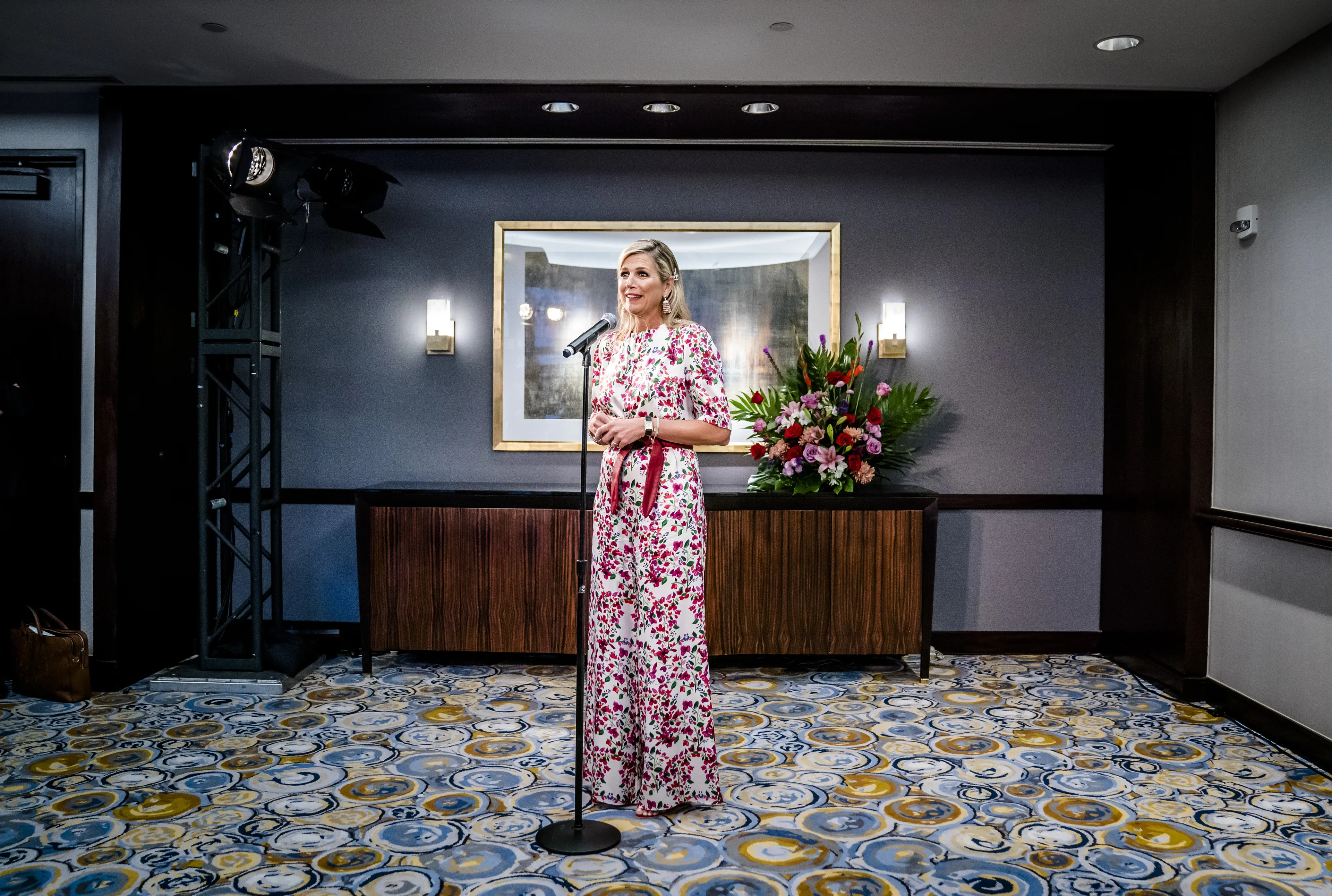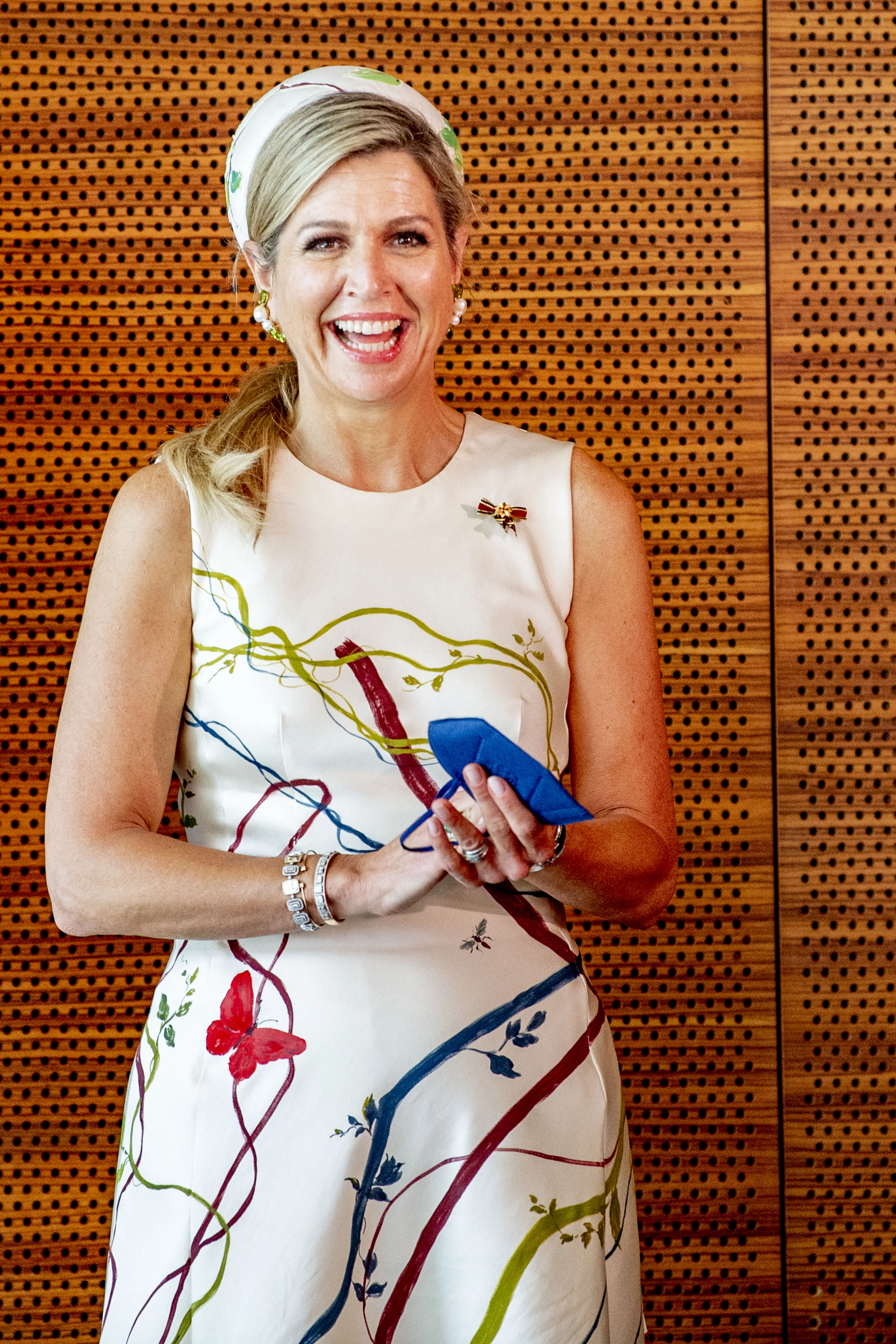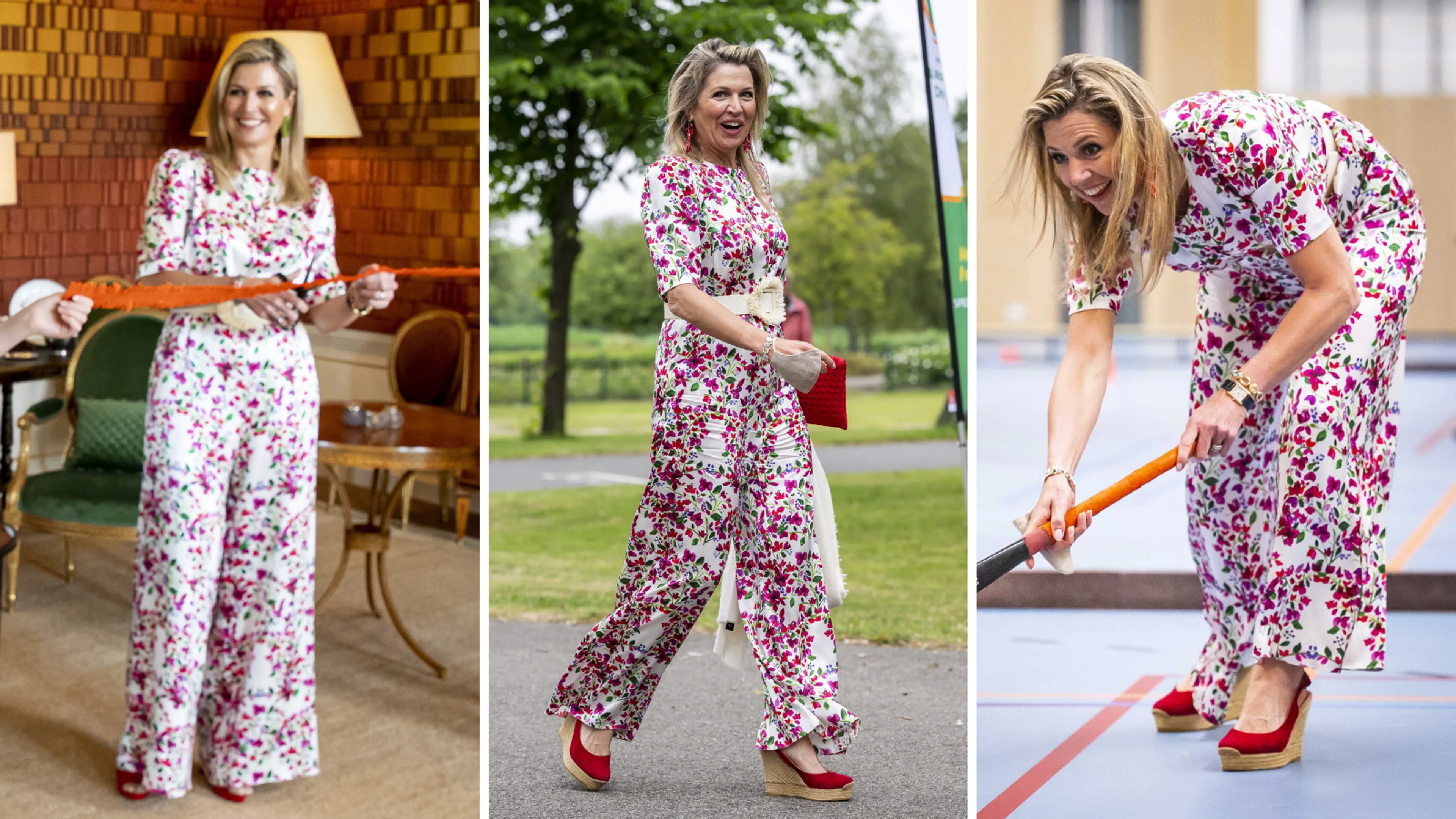 Máxima draagt tijdens het laatste onderdeel van haar reis een gebloemde jumpsuit van Seren. We hebben deze outfit al meerdere keren bij de koningin gezien. Zo droeg ze het broekpak in 2020 op Koningsdag en in 2021 tijdens de speciale Olympische Spelen in Den Haag.