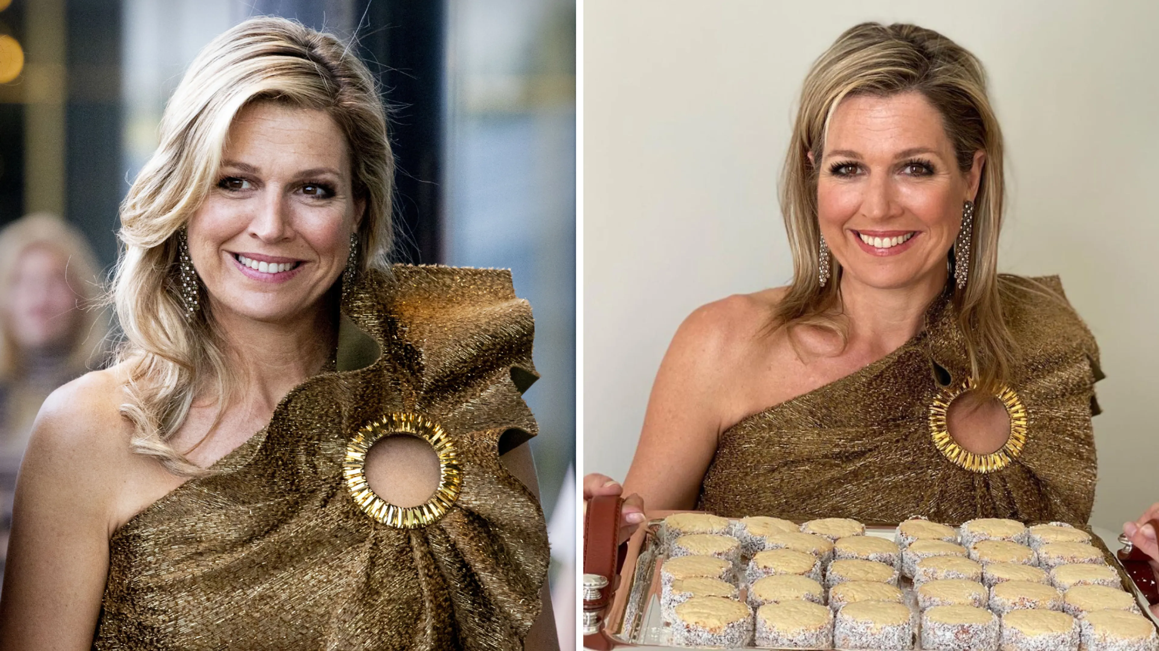 Máxima droeg dinsdagavond een gouden outfit van ontwerper Claes Iversen. We hebben dit pak meerde malen gezien: onder andere op het Holland Festival in 2019 en op haar 49e verjaardag in 2020.