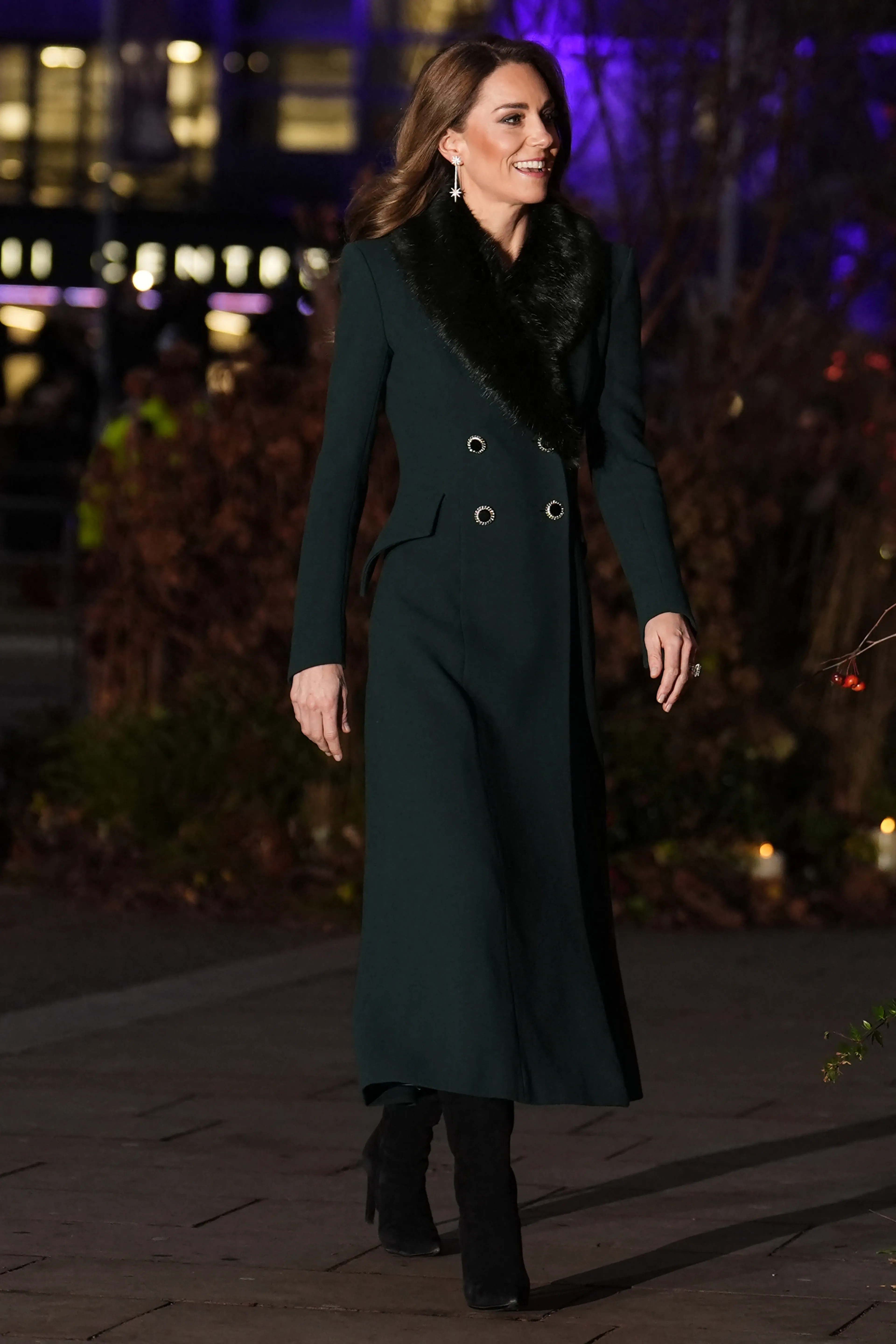 Catherine droeg vrijdagavond een lange donkergroene mantel met warme kraag van Catherine Walker. Daaronder droeg ze een rok met een Schotse ruit van MiuMiu. Prinses Charlotte droeg een donkerblauwe jurk met Peter Pan-kraag, een bijpassende maillot en ballerina's.