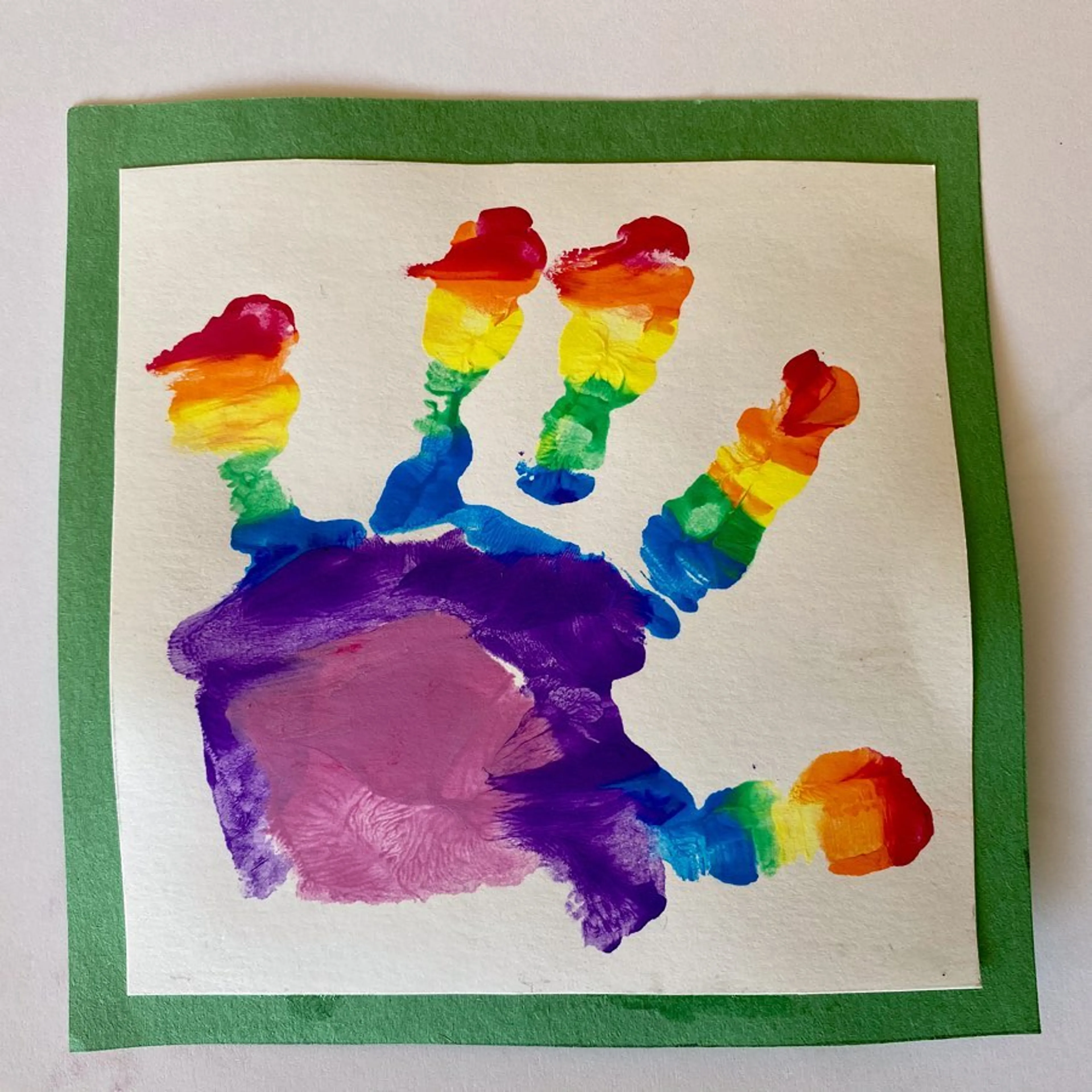 Op de foto's is Louis met brede grijns op zijn gezicht en met verf op zijn handen bezig met een van zijn eerste artistieke creaties. Het levert een regenboogkleurige afdruk op papier op. Veel kinderen in de Groot-Brittannië kleuren of verven regenbogen als steun voor de NHS, de Britse gezondheidsdienst.