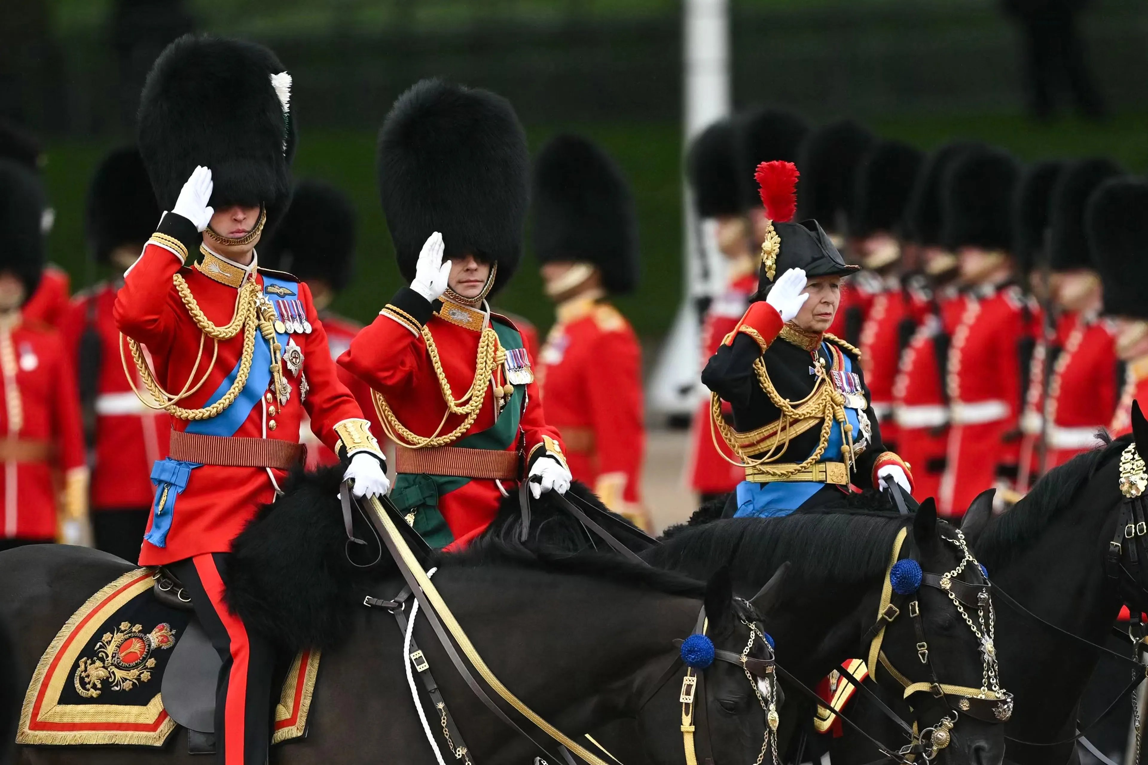 Prins William, prinses Anne en prins Edward rijden ter paard mee in de parade.