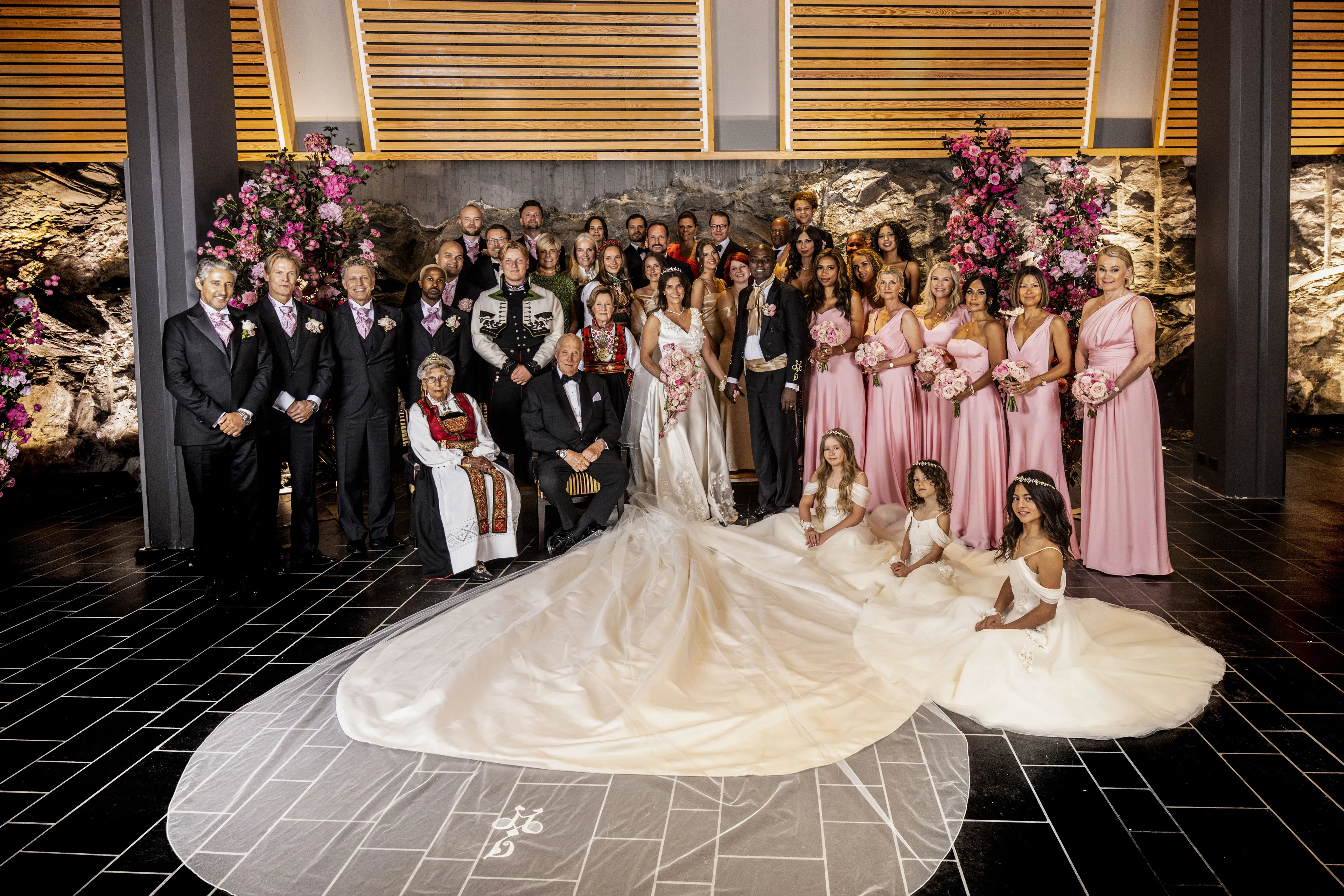Na afloop van de bruiloft maken Märtha Louise en Durek een groepsfoto met de genodigden. Naast leden van de Noorse koninklijke familie, staan ook de Zweedse royals op de afbeelding. Evenals prins Constantijn en prinses Laurentien. De foto verschijnt aan het einde van de dag ook op de Instagram pagina van het Noorse hof.