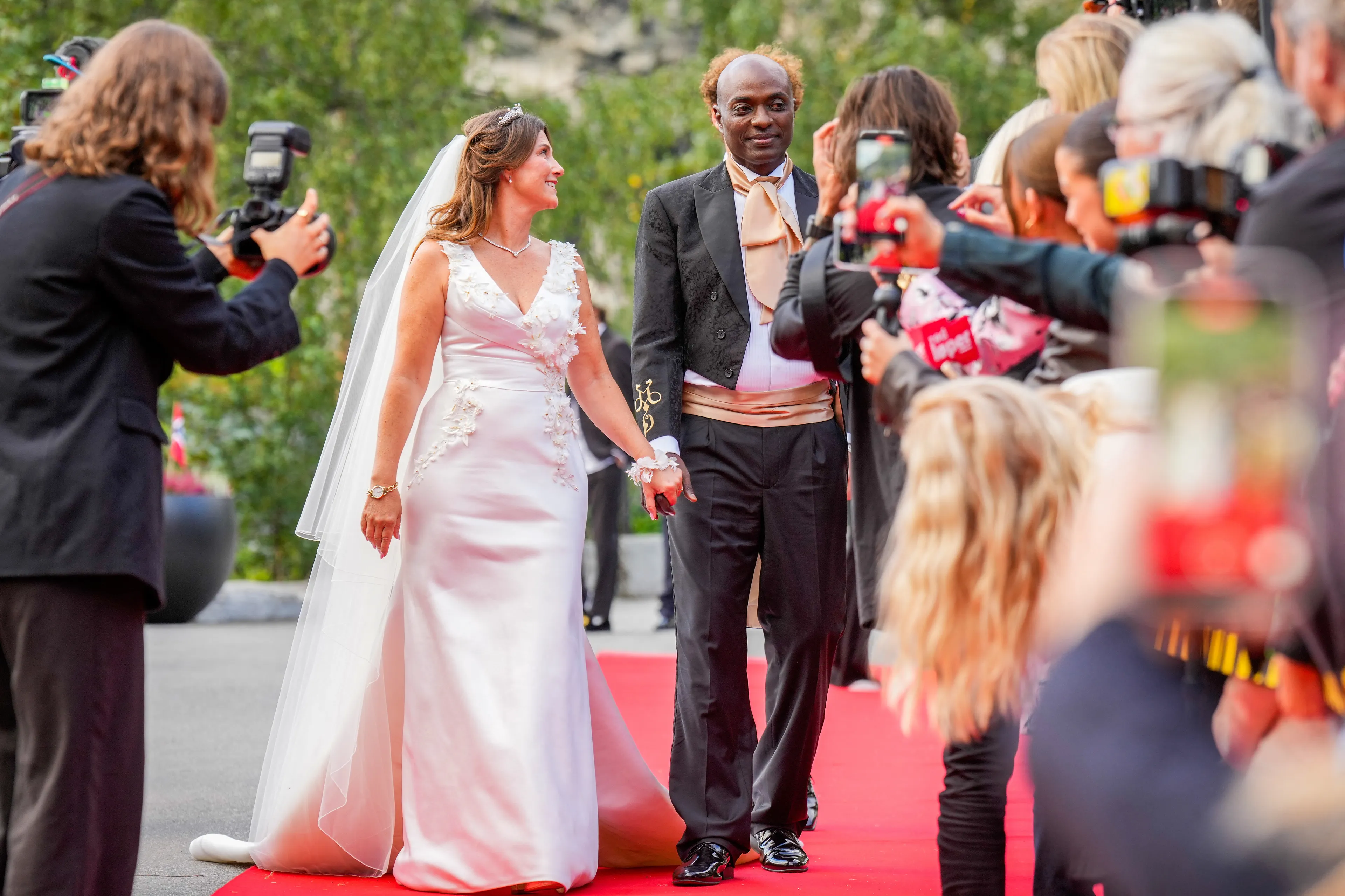 Prinses Märtha Louise en haar kersverse echtgenoot gaan een uitgebreide feestavond tegemoet. Tijdens de aankomst bij het hotel wordt het bruidspaar tóch nog vastgelegd door de aanwezige pers. En dat levert héle leuke plaatjes op!