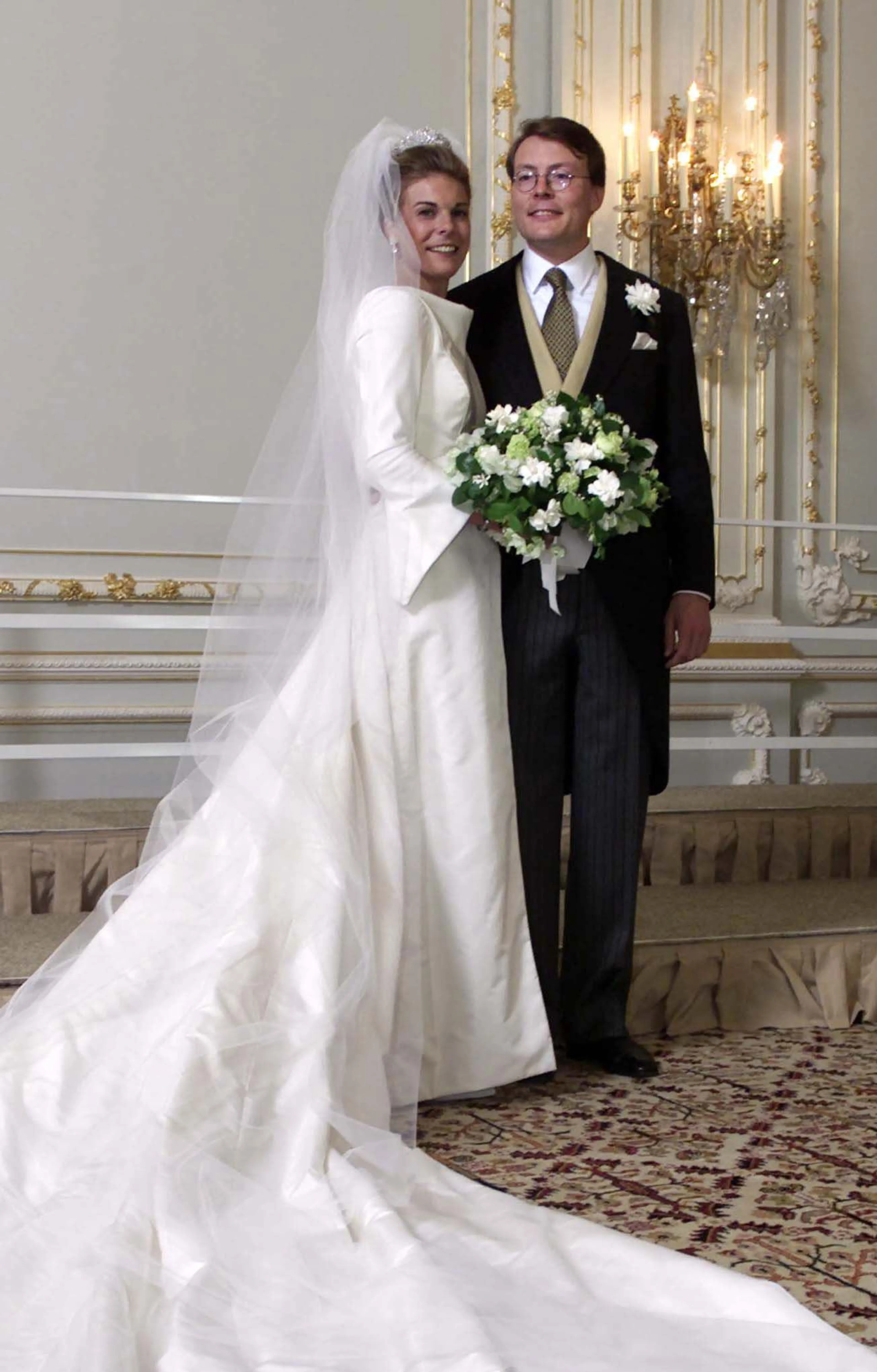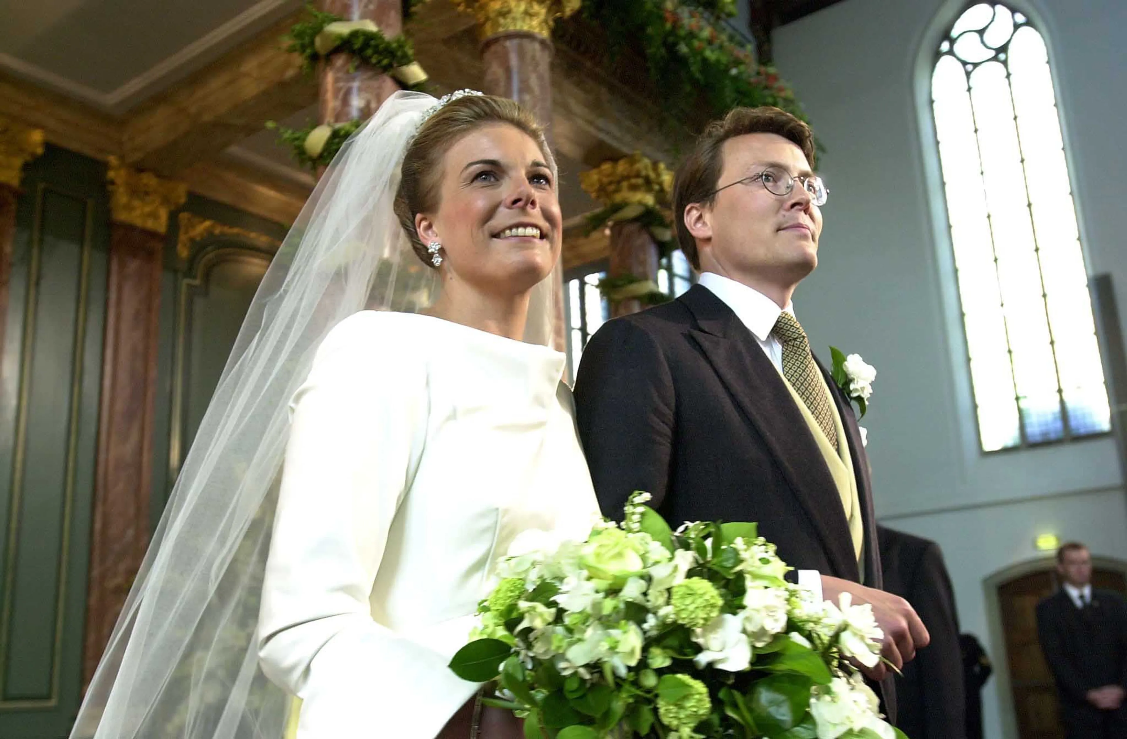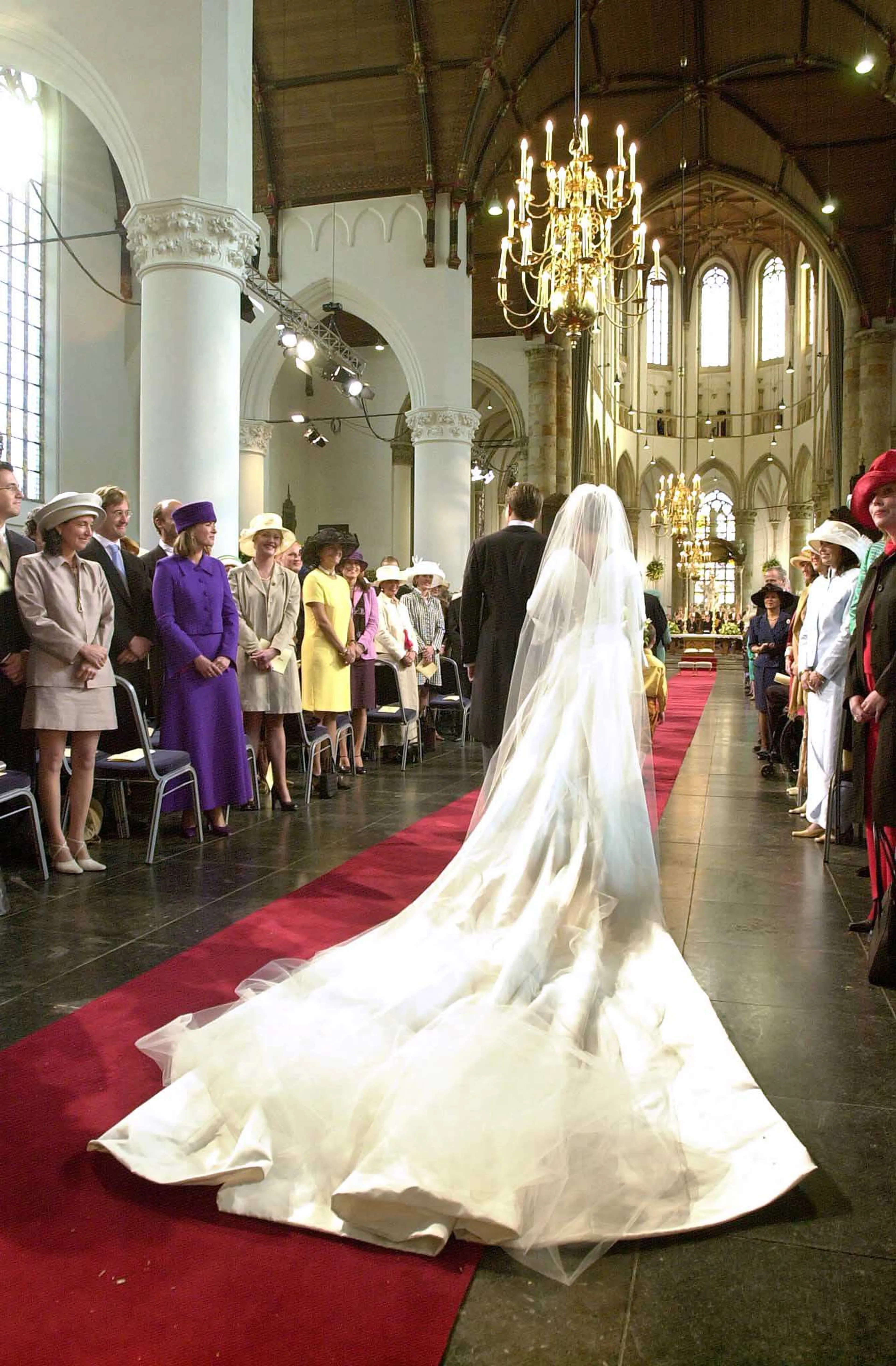 We gaan naar het jaar 2001, waar op 17 en 19 mei prins Constantijn en Petra Laurentien Brinkhorst met elkaar trouwen. Tijdens het civiele huwelijk op 17 mei draagt de aanstaande prinses nog een knalroze jurk met een grote hoed, maar voor de kerkelijke inzegening kiest ze voor een traditionele witte trouwjurk.