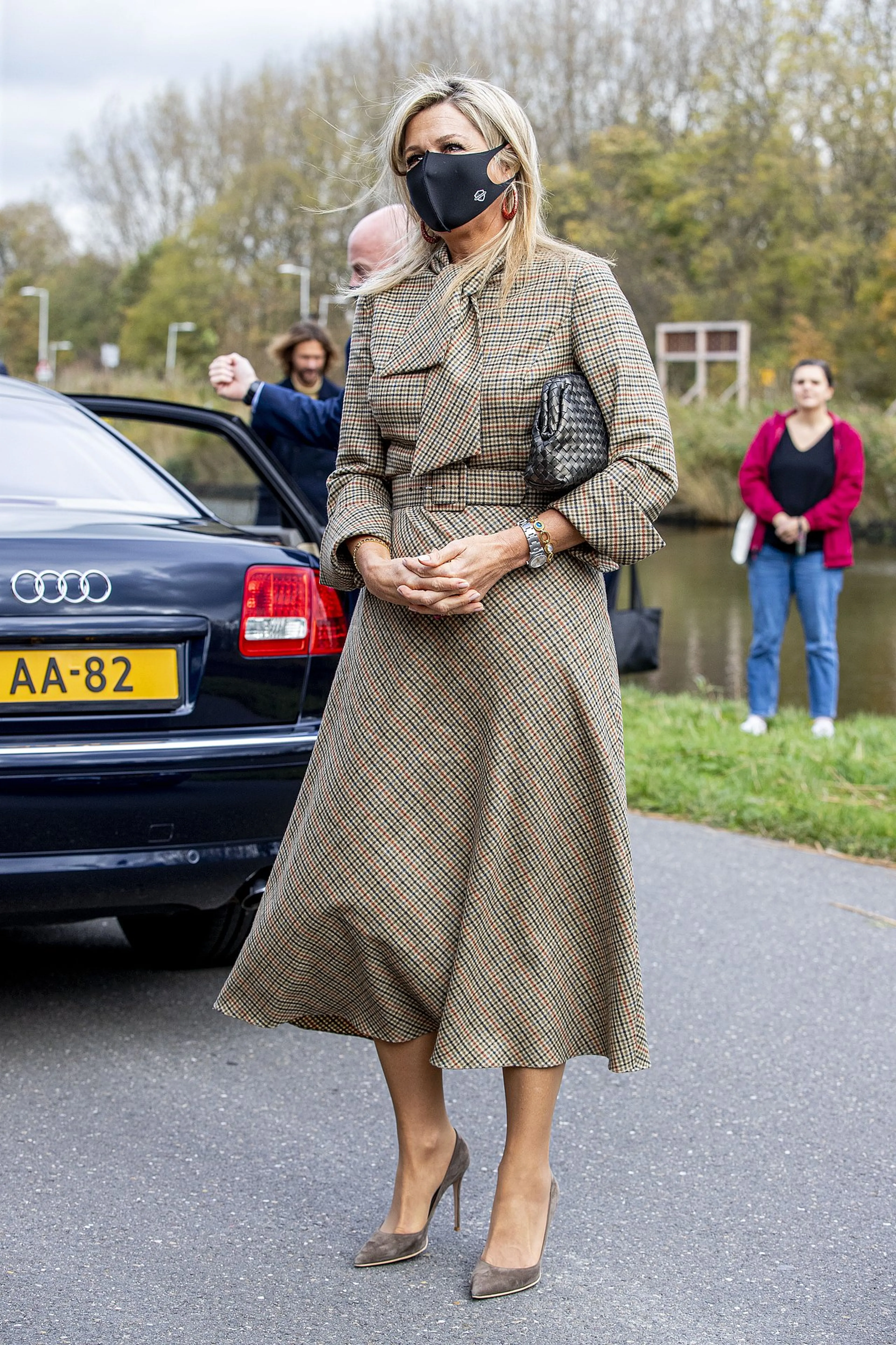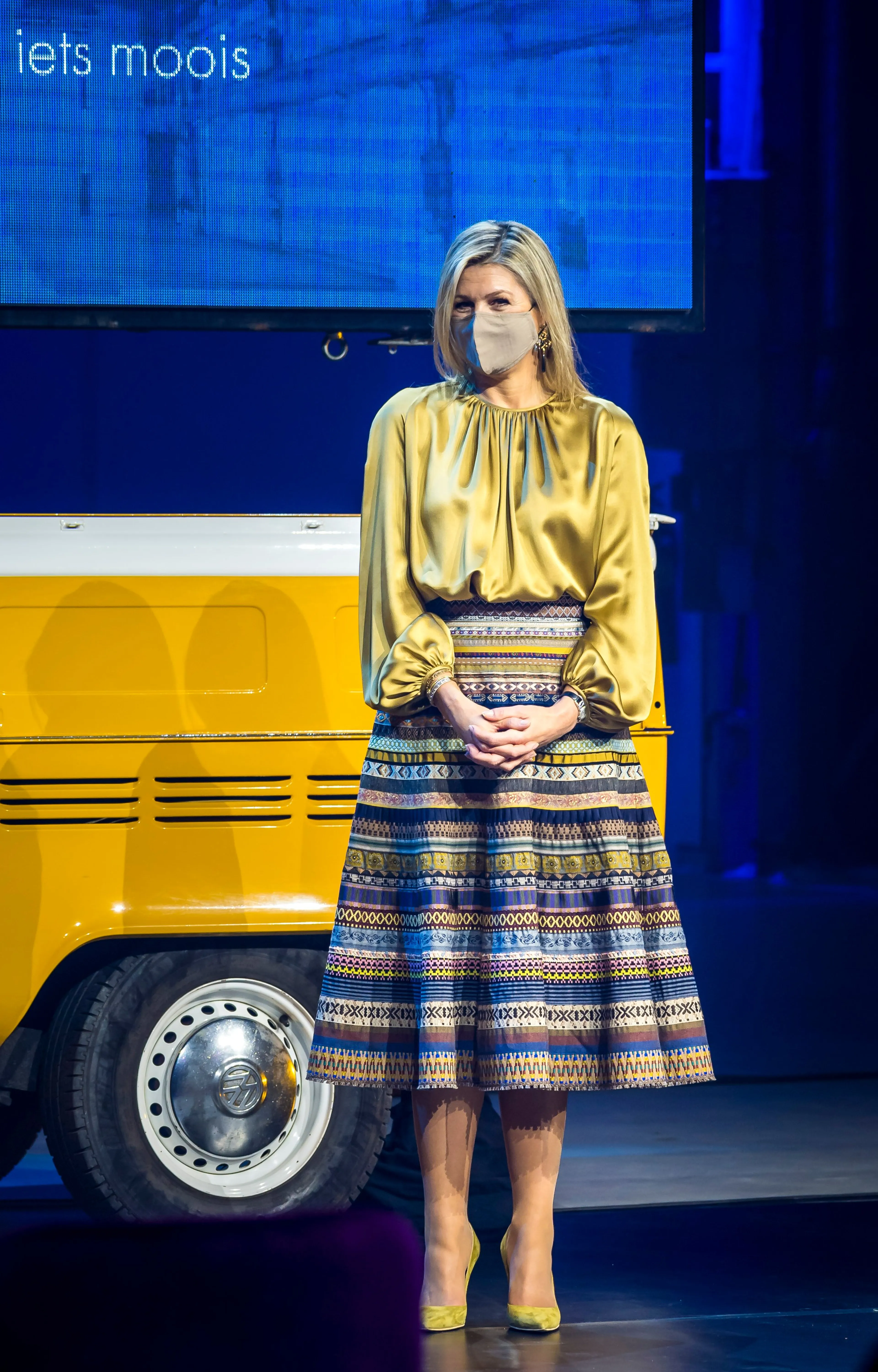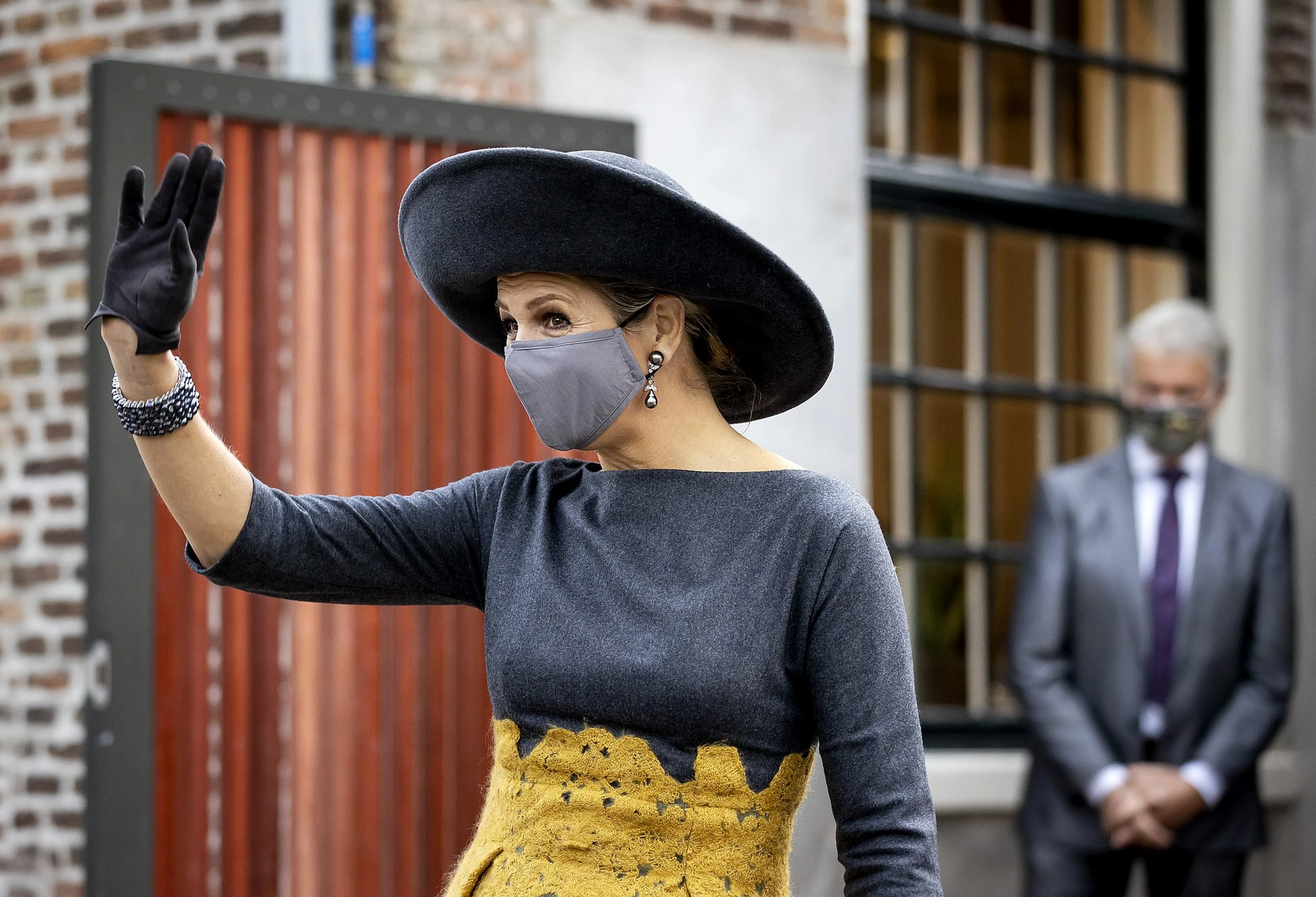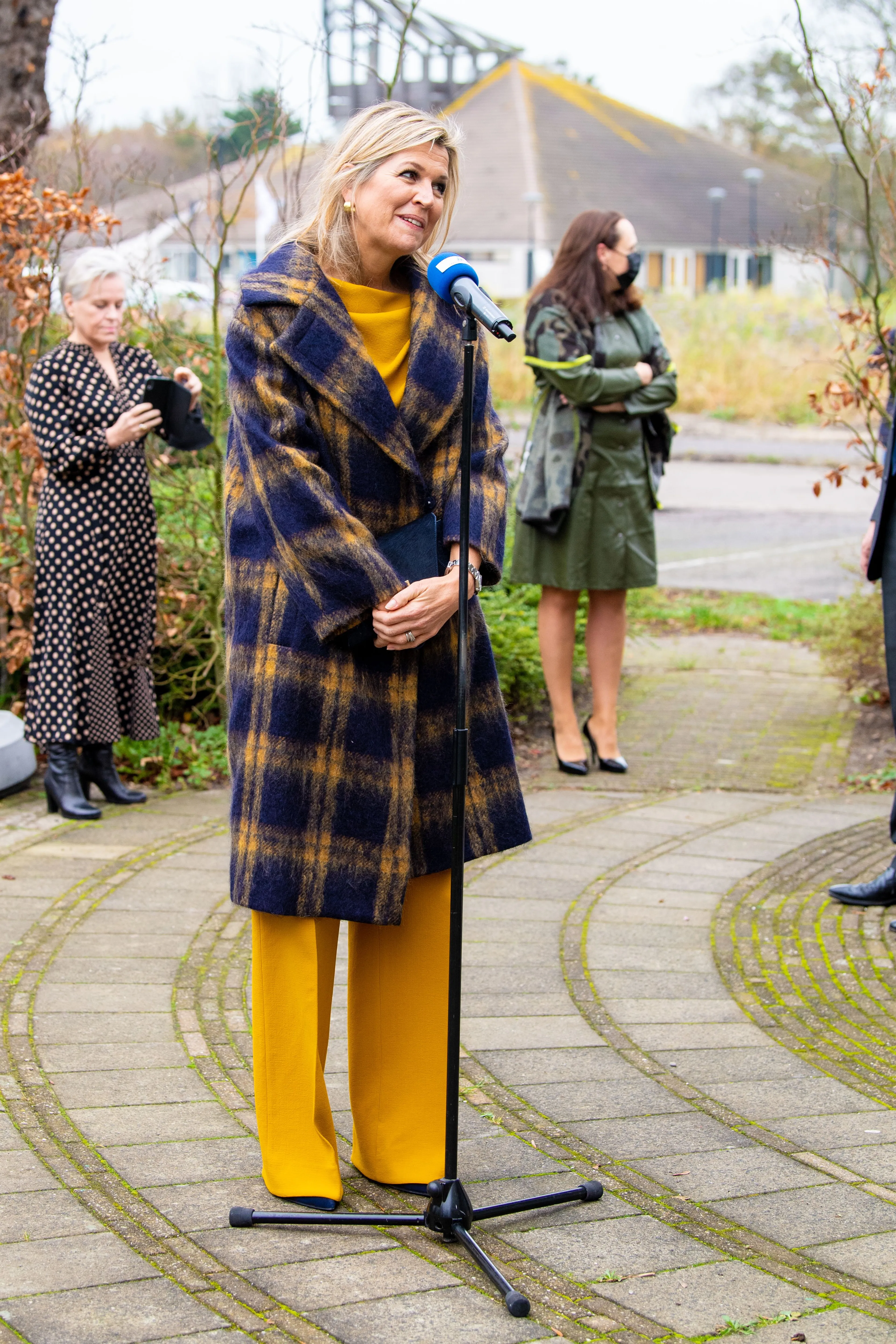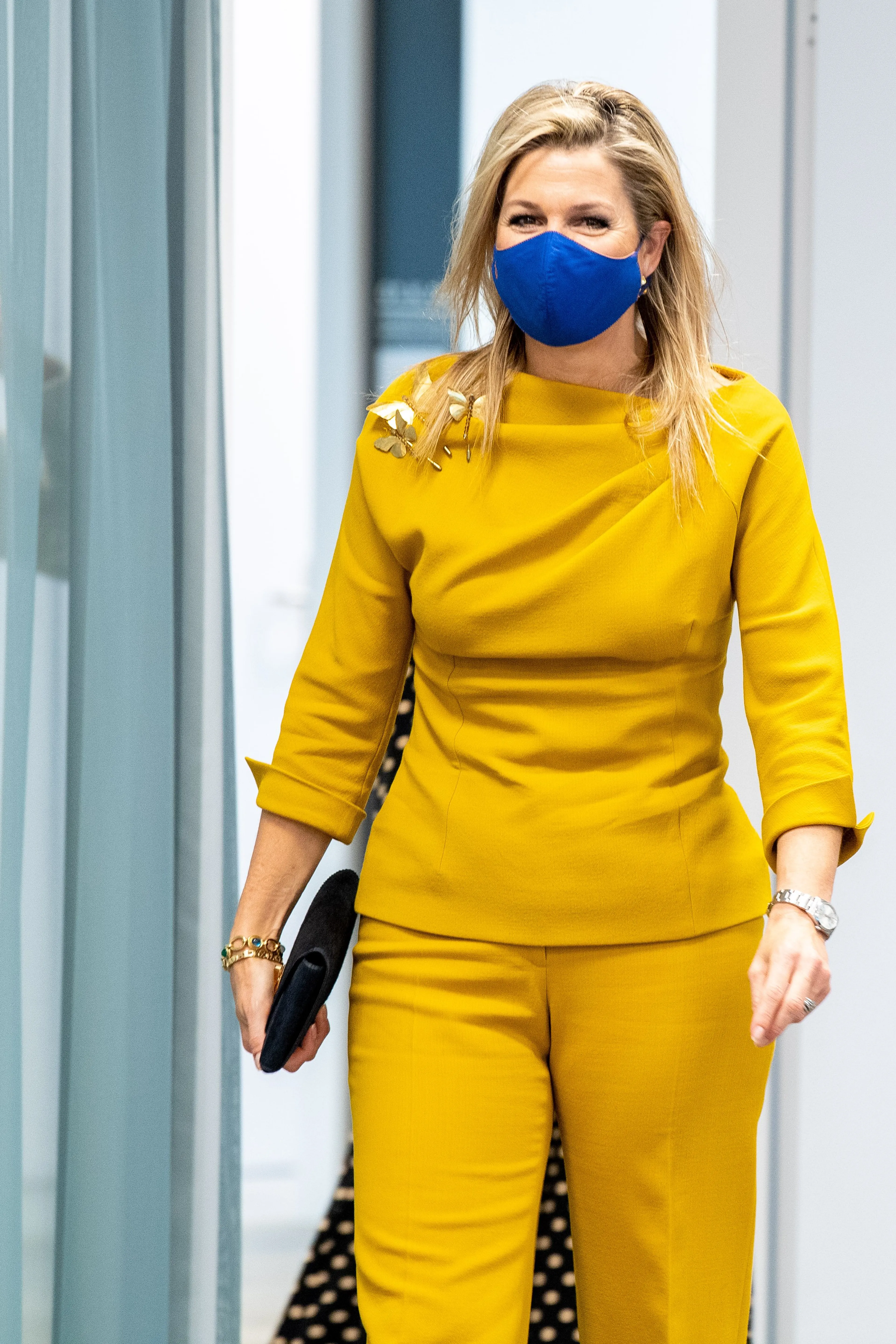 Voor haar bezoek naar woonzorgpark Willem van den Bergh koos Máxima voor een gele pantalon met top van Natan. De broche van gouden vlinders op haar schouder staat als een glimmend accent. Haar lange geruite jas paste perfect bij haar gele outfit en bij haar koningsblauwe mondkapje, dat ze binnen droeg.
