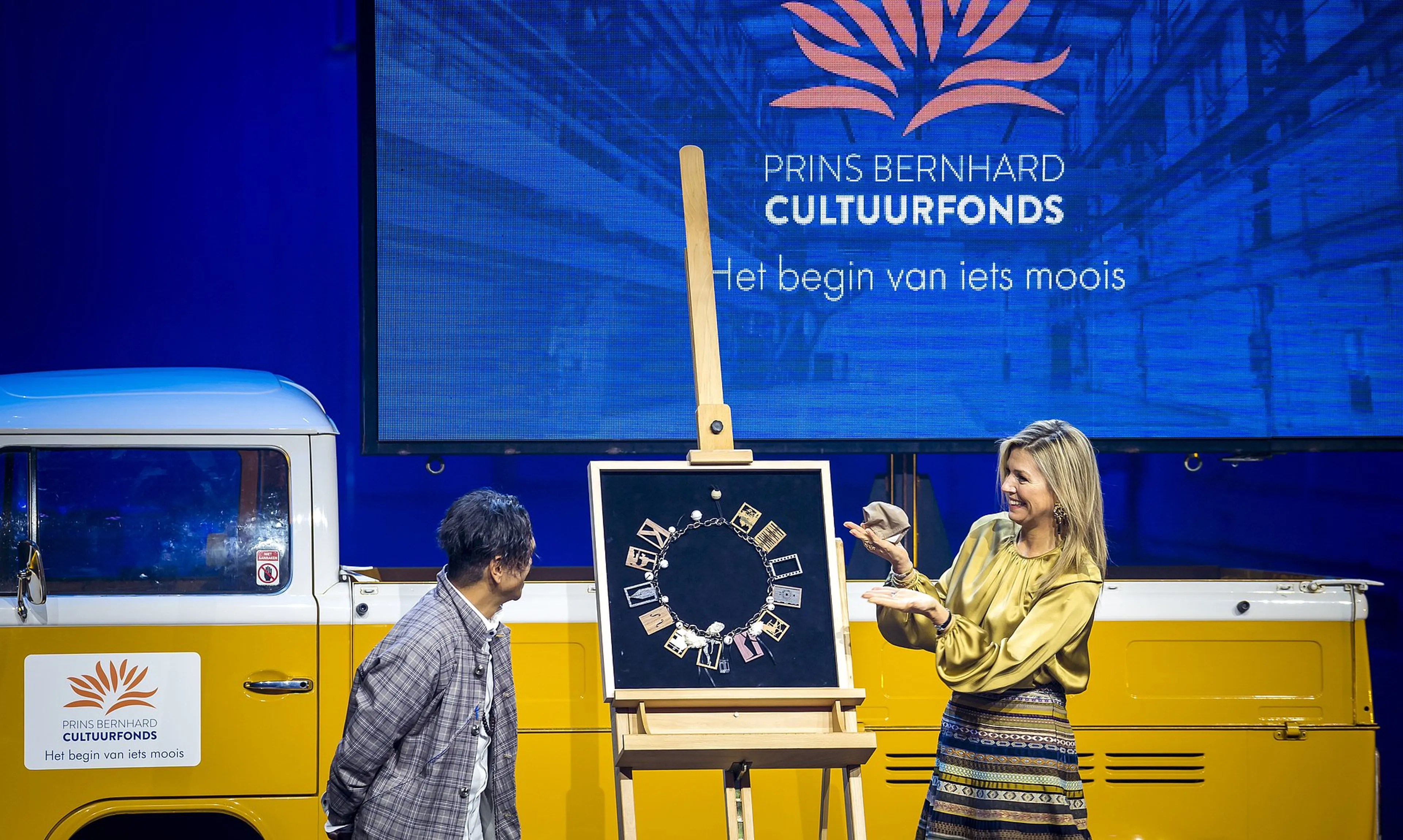 We hebben Máxima vaak in het goud deze maand gezien. Voor de uitreiking van de Prins Bernhard Cultuurfonds Prijs droeg de koningin een lange kleurige patroonrok gecombineerd met een goudkleurige blouse.