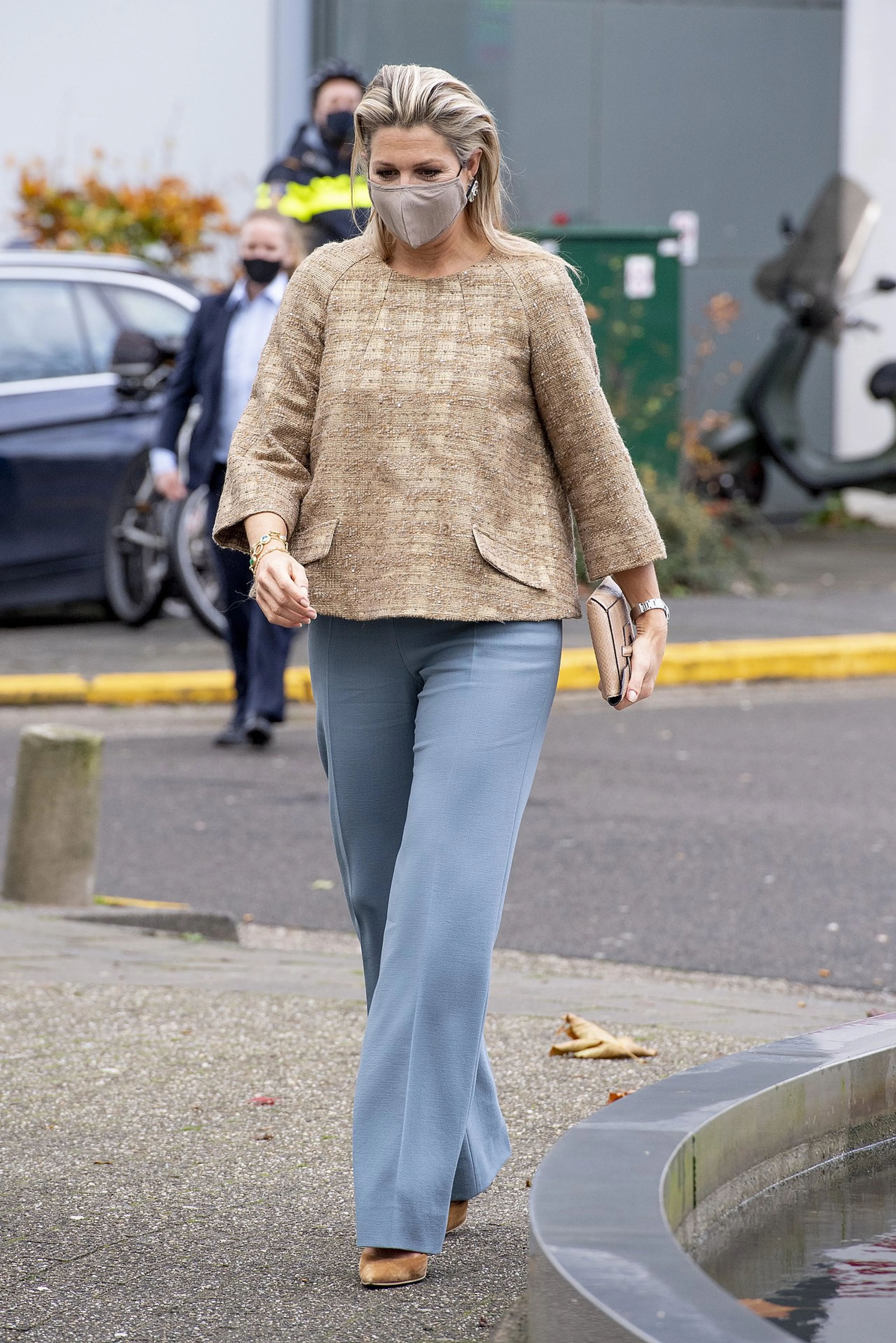 Máxima is niet alleen de koningin van prachtige jurken en pantalons. Ze ziet er ook stijlvol uit in een blouse en een broek, zoals we hier kunnen zien. Ze combineerde een subtiel gouden top van Natan, met een lichtblauwe broek.