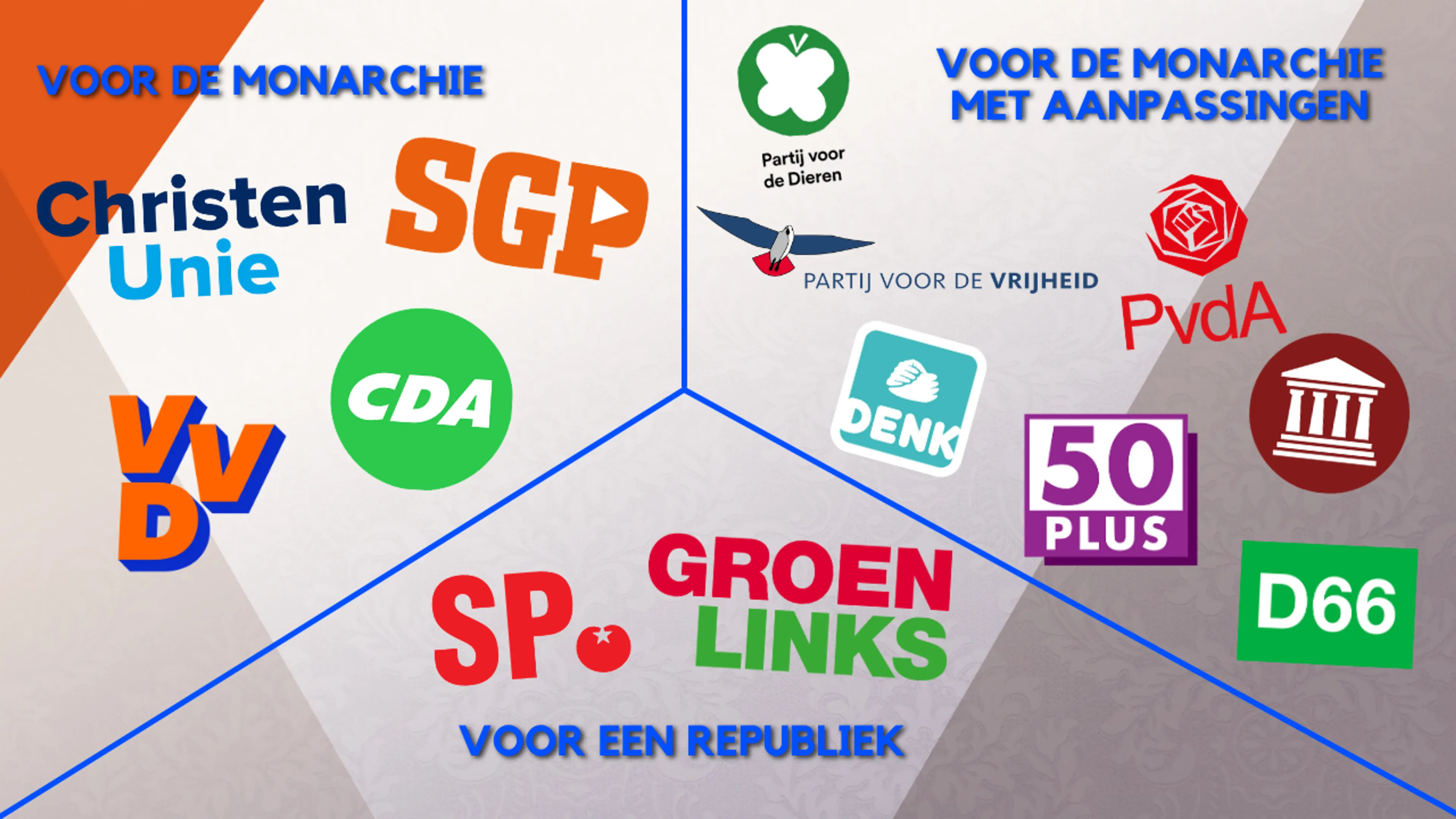 Om te beginnen zijn er onder de 13 partijen in de Tweede Kamer eigenlijk 3 smaken op de politieke markt. Zo heb je partijen die voor de monarchie zijn zónder aanpassingen en die de monarchie willen behouden maar aanpassen. Tot slot zijn er partijen die het liefst van Nederland een republiek maken.