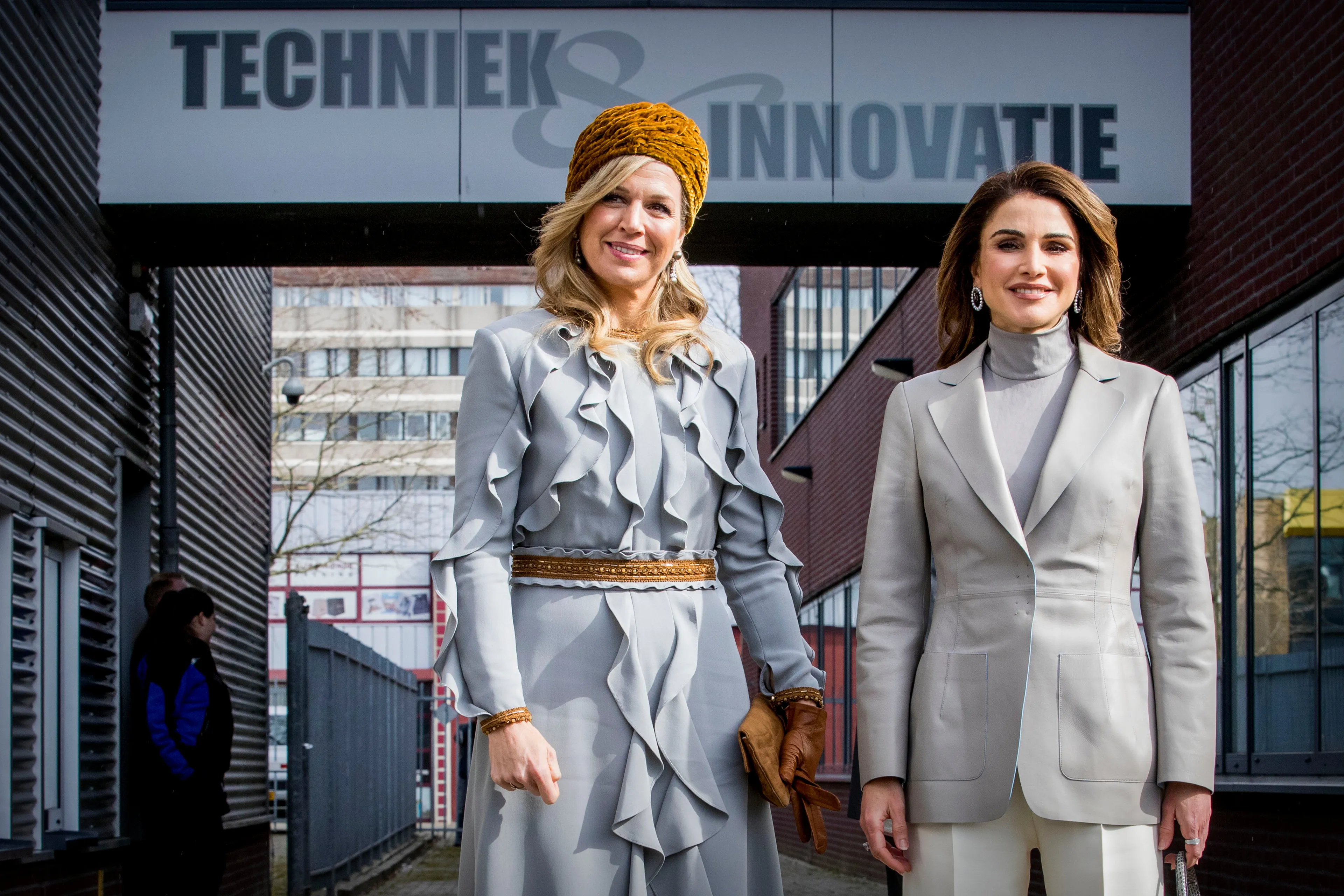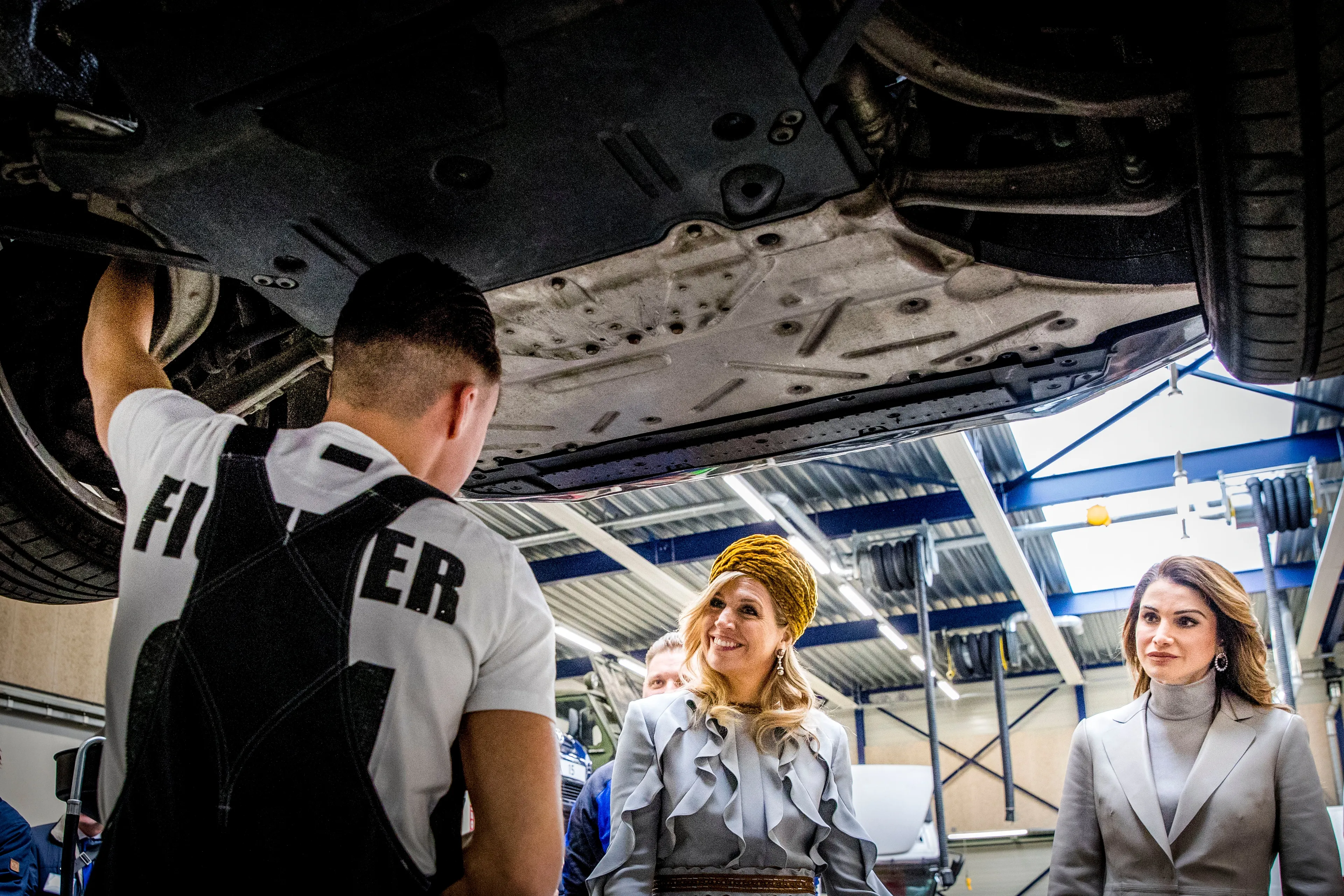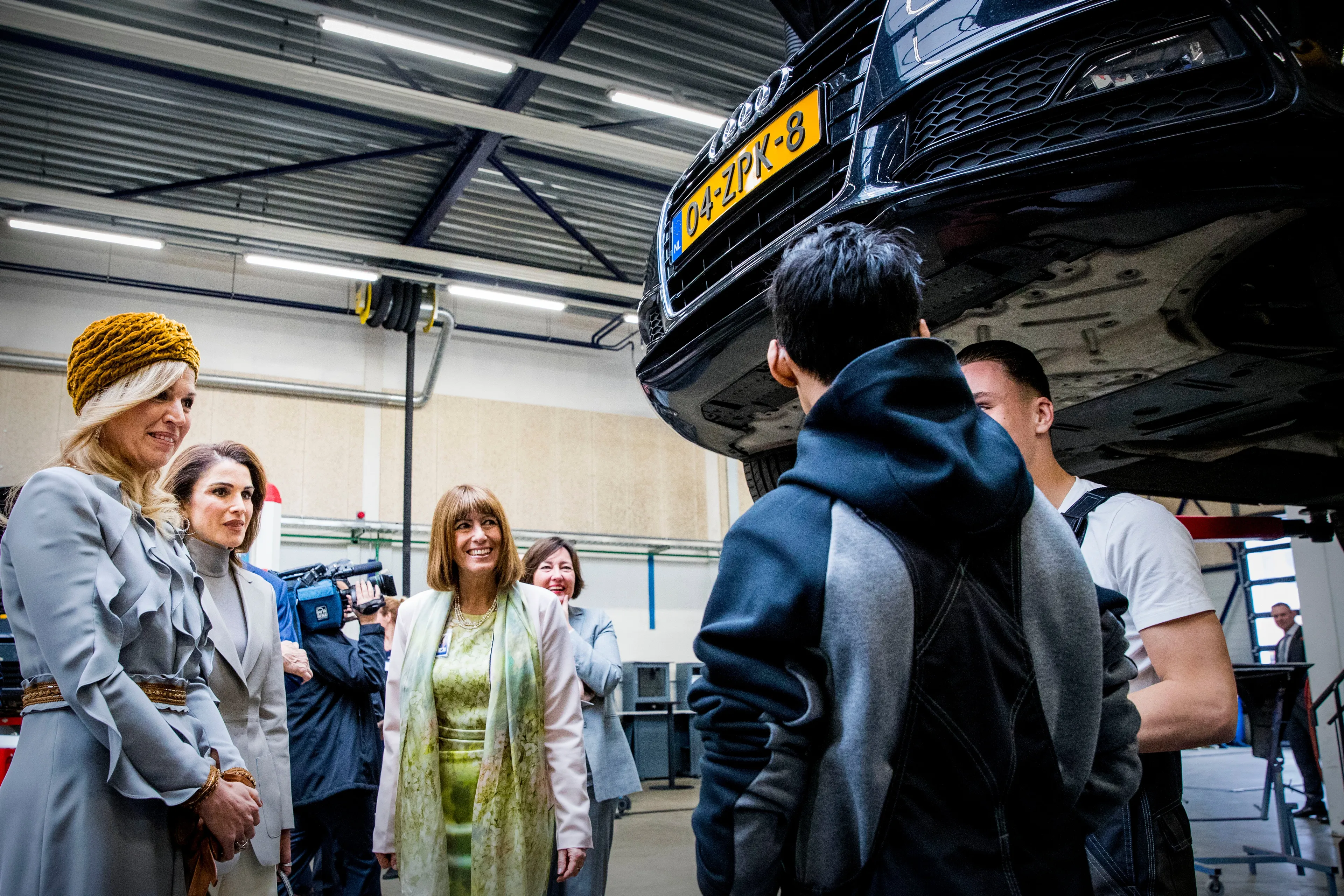 Koningin Máxima heeft woensdagmorgen in Den Haag samen met de Jordaanse koningin Rania de afdeling techniek en ICT bezocht van ROC Mondriaan. Op de houtwerkplaats spraken zij het enige meisje dat de opleiding tot schilder volgt.