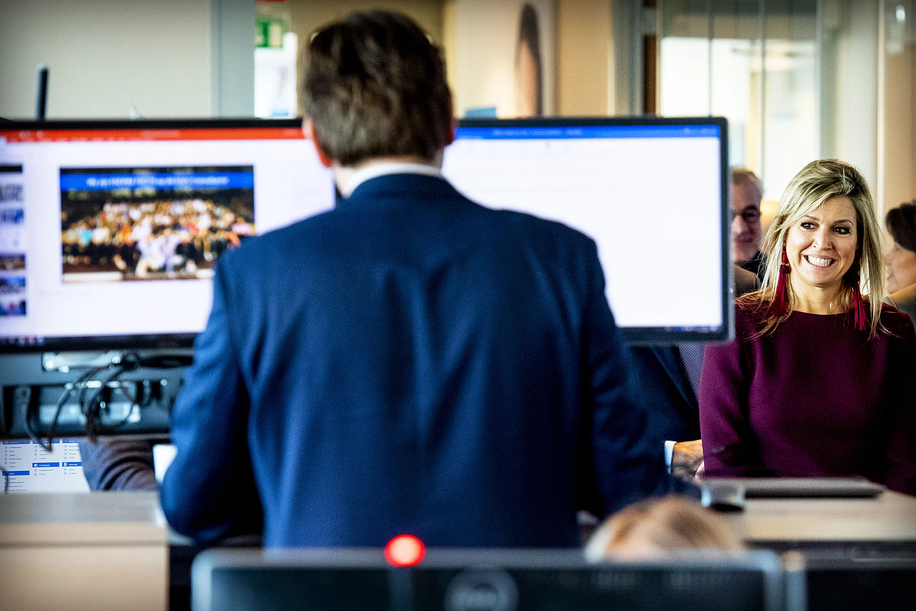 Video: Máxima straalt in nieuwe outfit tussen de computers