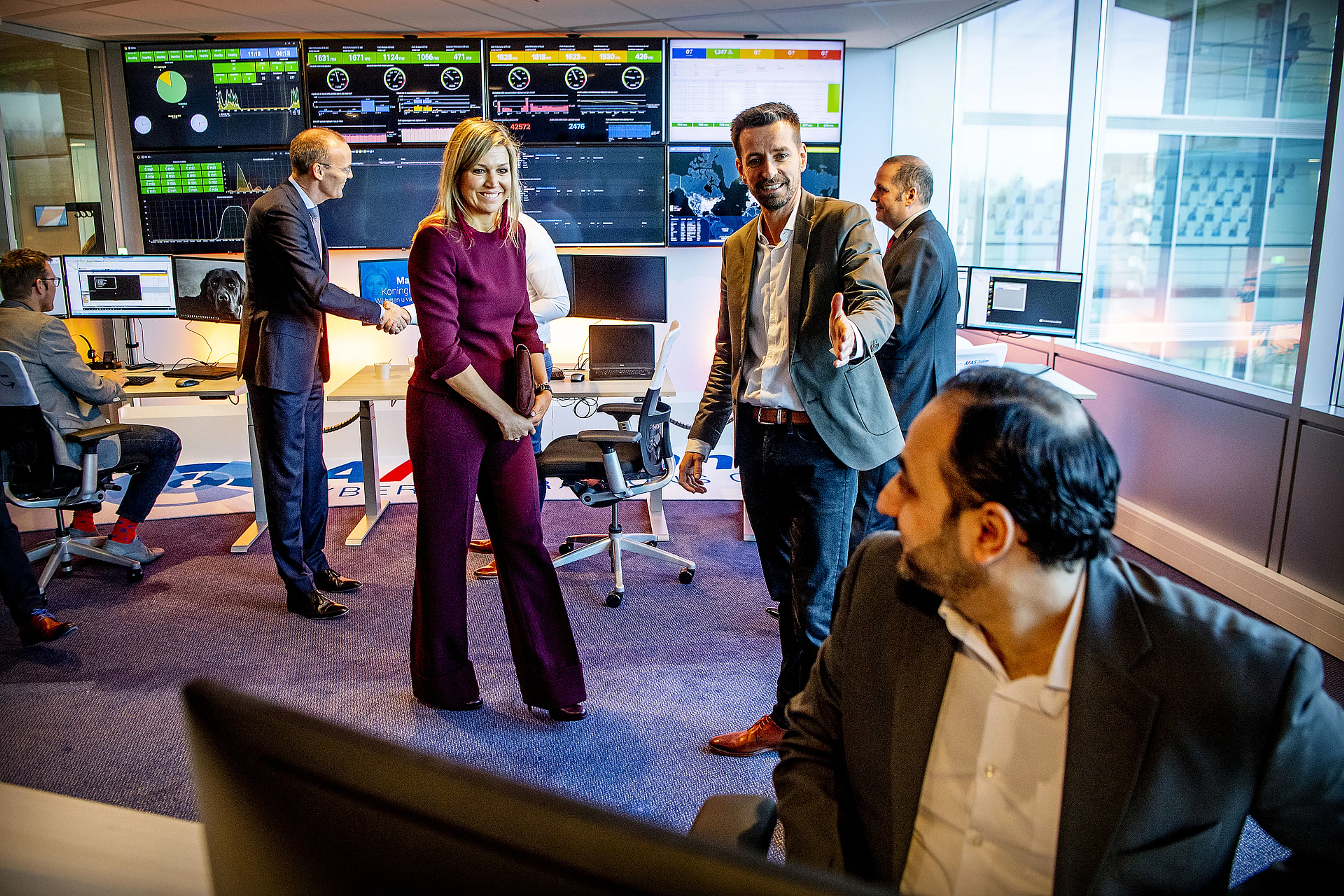 Het bedrijf AFAS Software kreeg dinsdag koninklijk bezoek. Koningin Máxima stond voor de deur voor een rondleiding bij het hoofdkantoor in Leusden. Voor de gelegenheid trok de koningin een nieuwe outfit uit de kast: een auberginekleurig broekpak van het Belgische modehuis Natan.