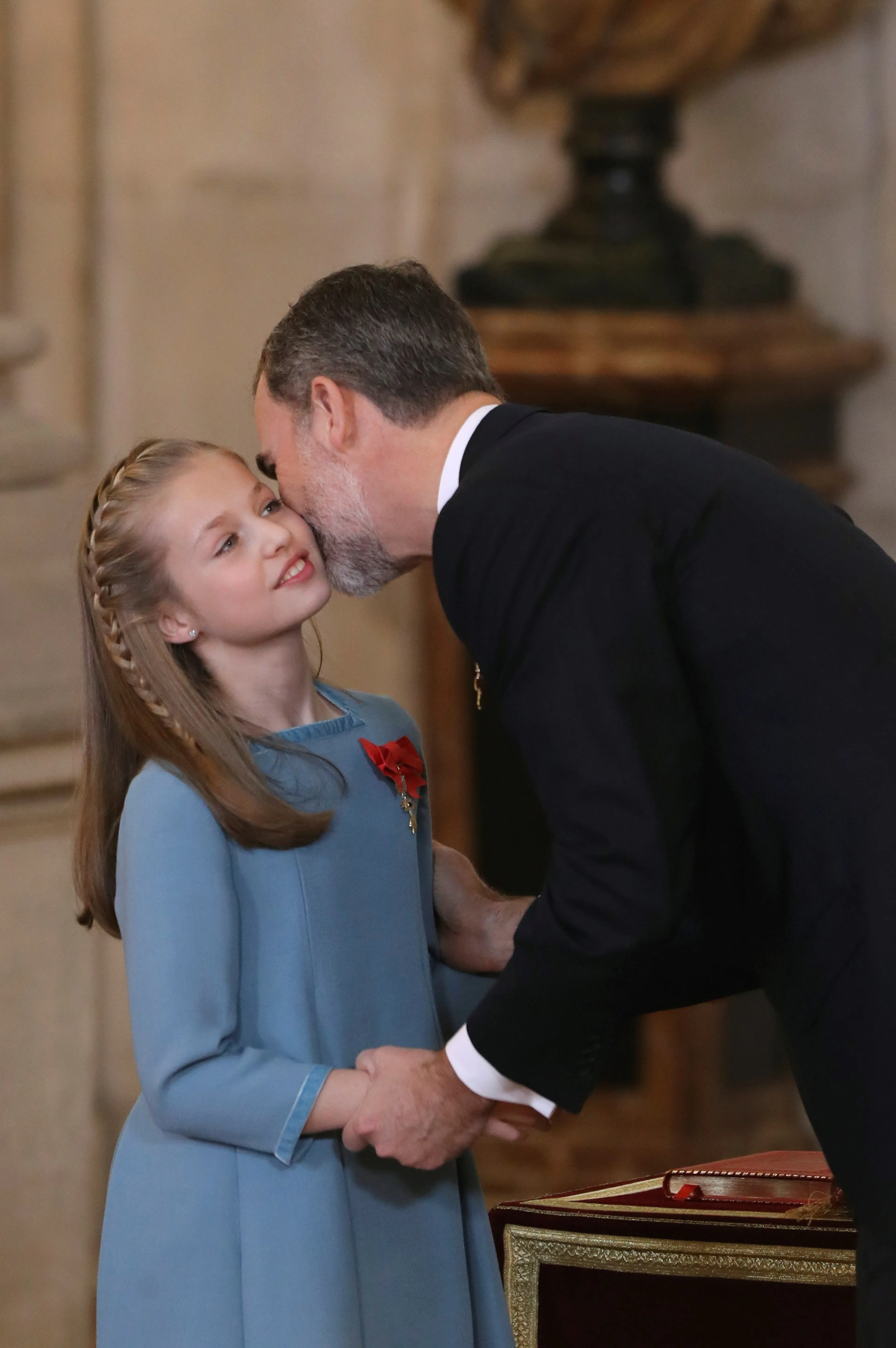 Prinses Leonor (12) heeft de historische onderscheiding tijdens een bijzondere bijeenkomst in het Koninklijk Paleis in Madrid gekregen. Naast haar ouders en zusje prinses Sofia waren ook haar grootouders koning Juan Carlos en koningin Sofia aanwezig, alsmede vertegenwoordigers van de hoogste staatsorganen.