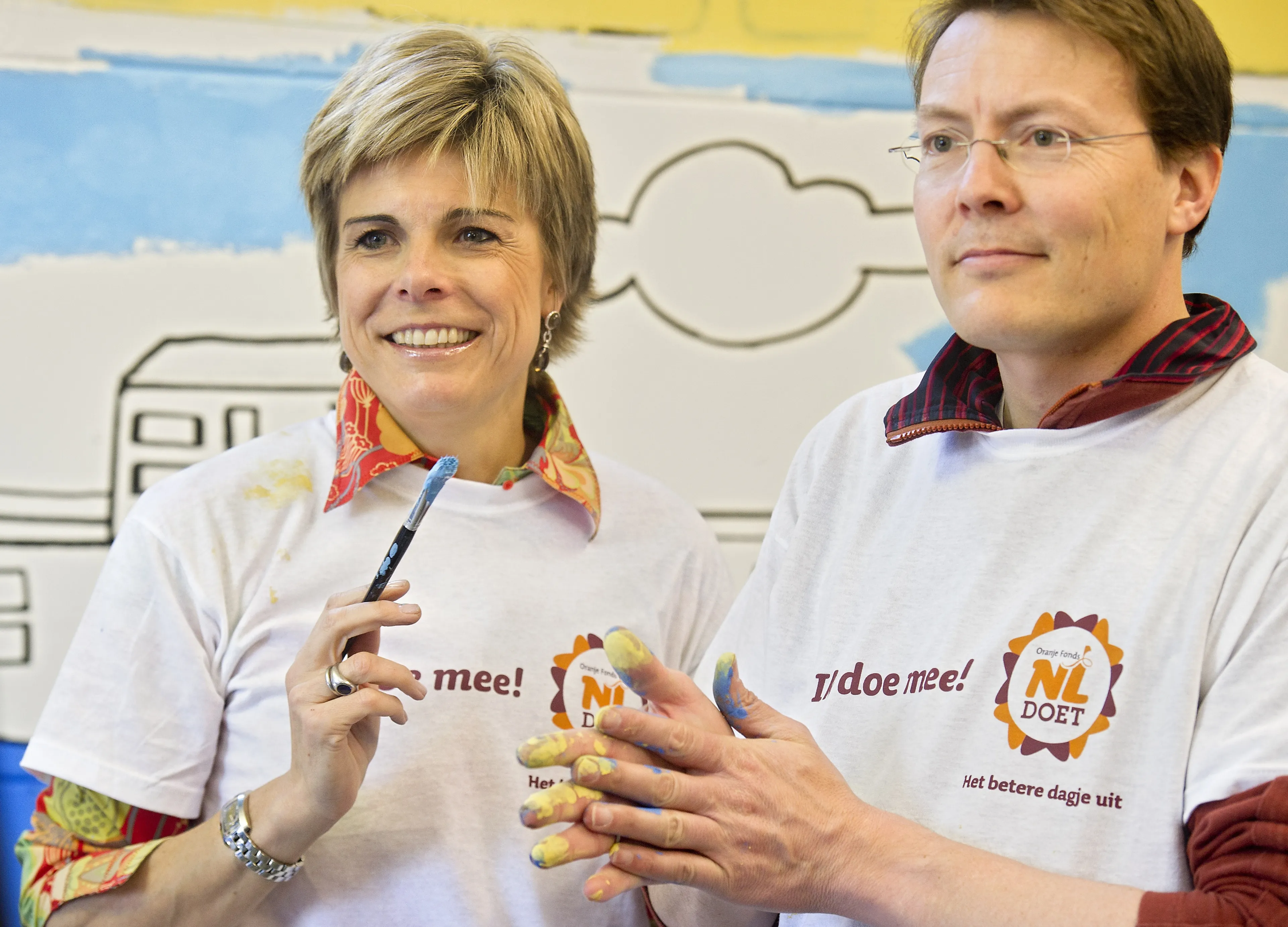 Het Oranje Fonds organiseert elk jaar een landelijke actie om vrijwilligerswerk te stimuleren. Door het hele land zijn dan initiatieven te vinden waar ook leden van de koninklijke familie bij betrokken zijn. Zo zien we ons Koninklijk Paar eens in een heel andere setting dan we van ze gewend zijn. Zo was ons koningspaar dit jaar door weer en wind aan het werk in een buurthuis.