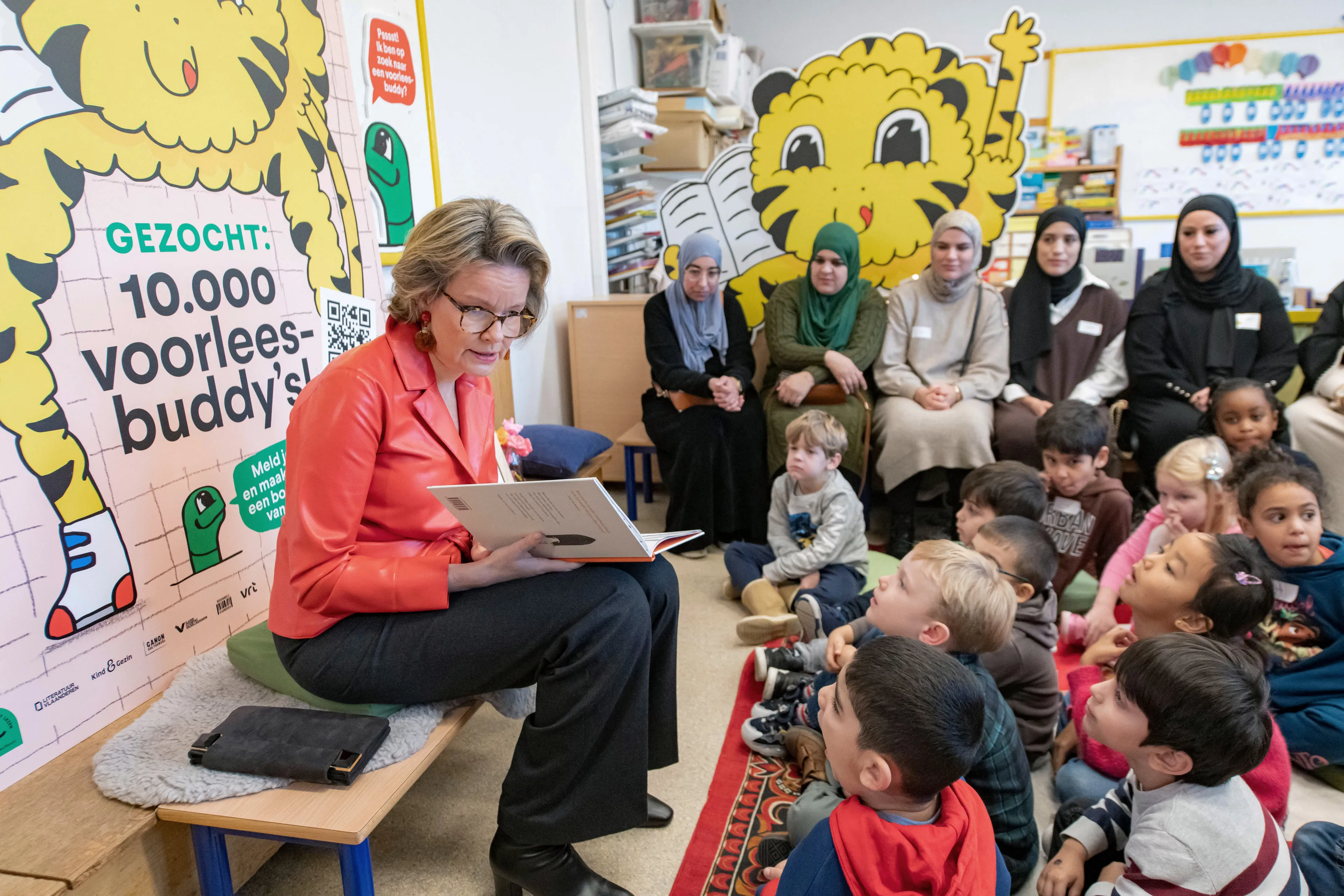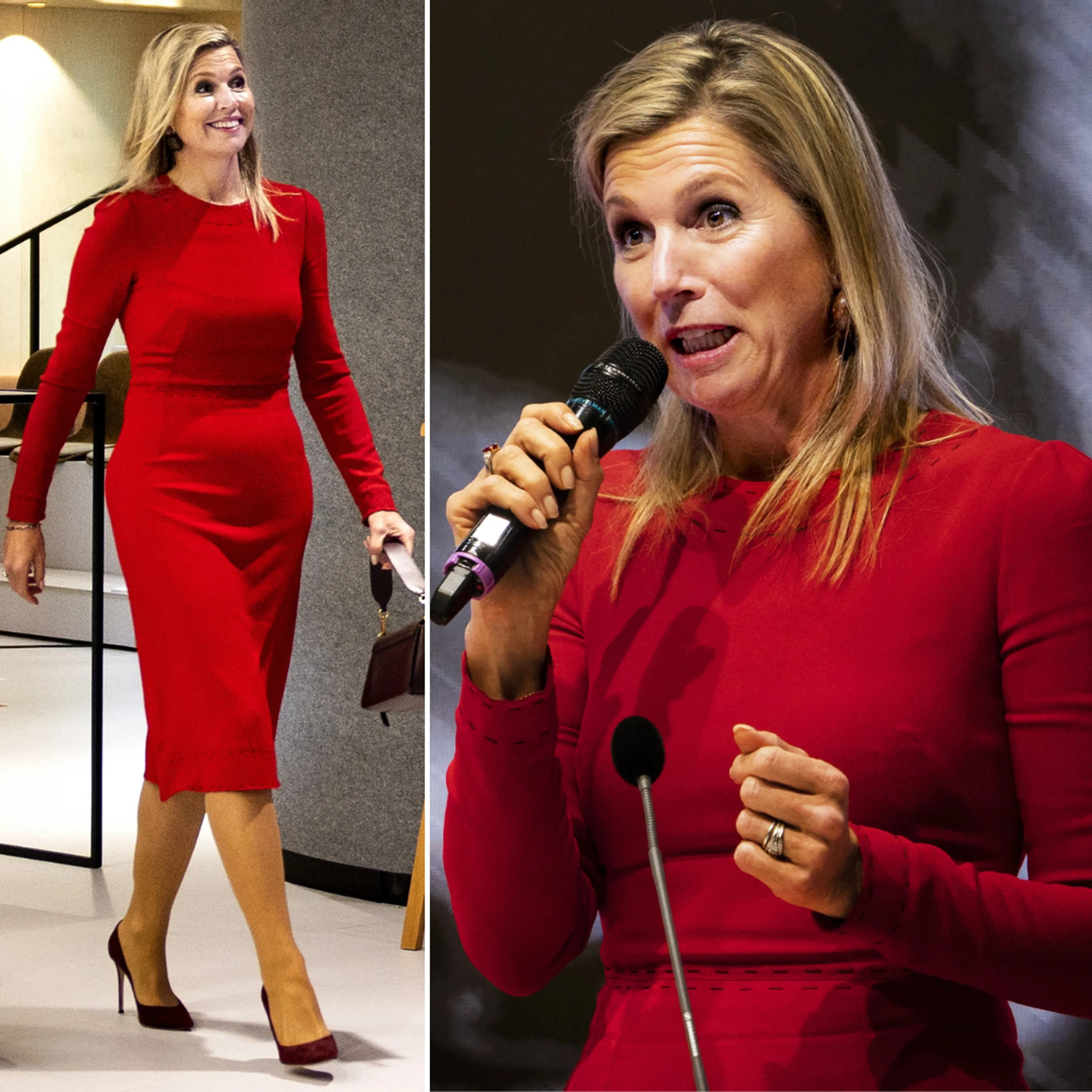 Tijdens een bezoek aan stichting Het Begint met Taal dat dit jaar vijftien jaar bestaat, draagt de koningin opnieuw rood. Dit keer in de vorm van een jurk van Natan.