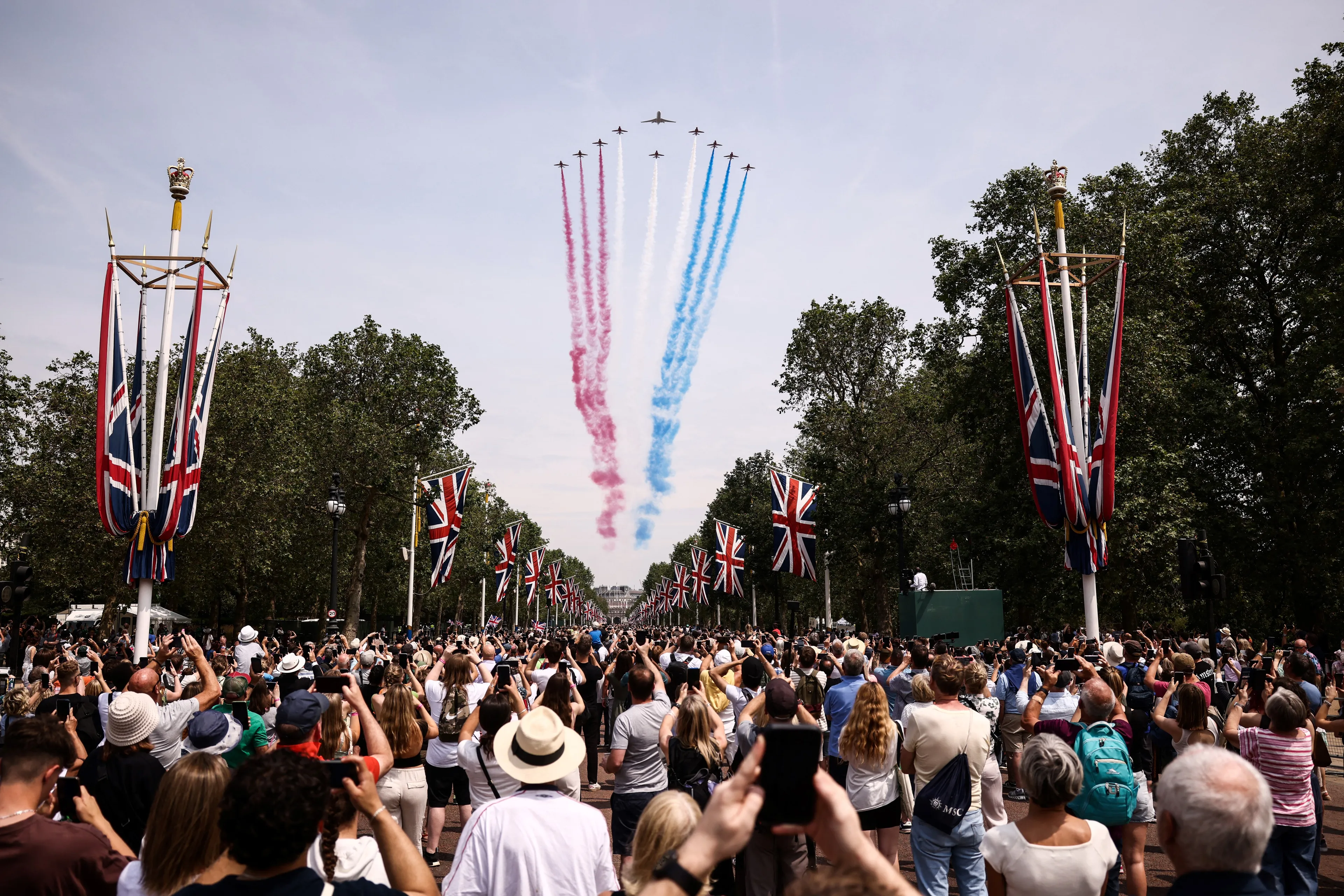 Aan het einde van de parade keert de koninklijke familie terug op Buckingham Palace. Daar verzamelt de koninklijke familie zich op het balkon om daar te kijken naar een luchtparade van 70 vliegtuigen die overvliegen.