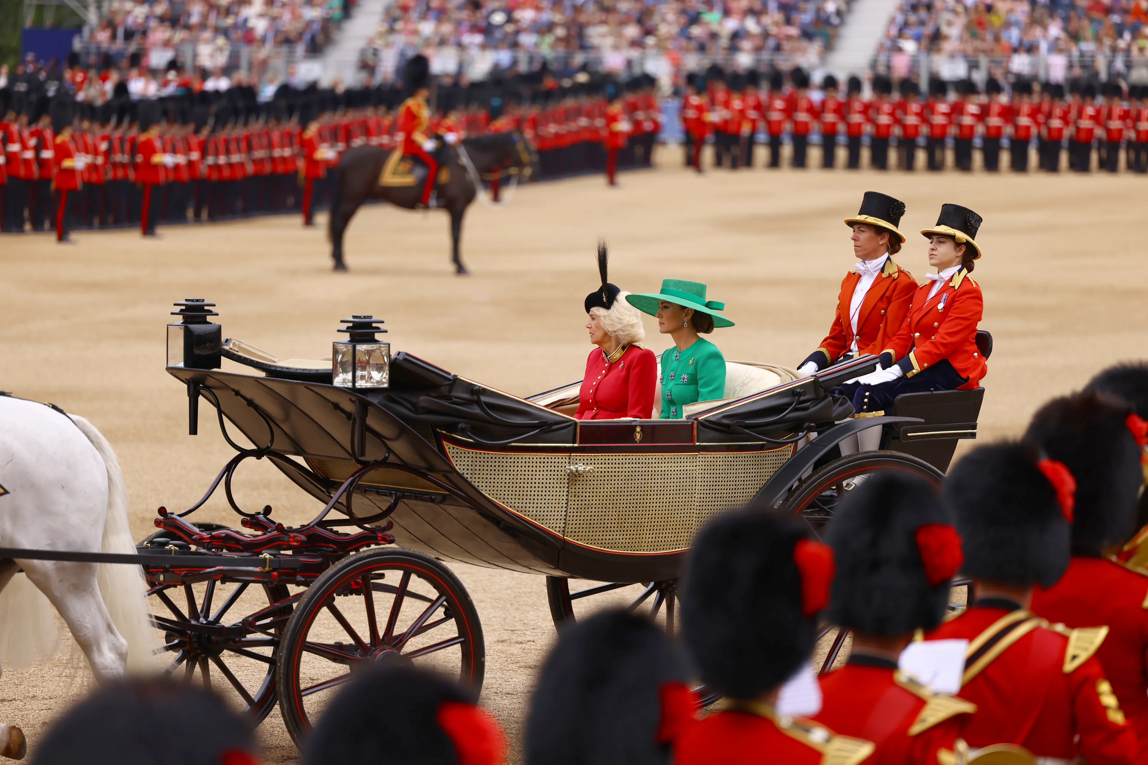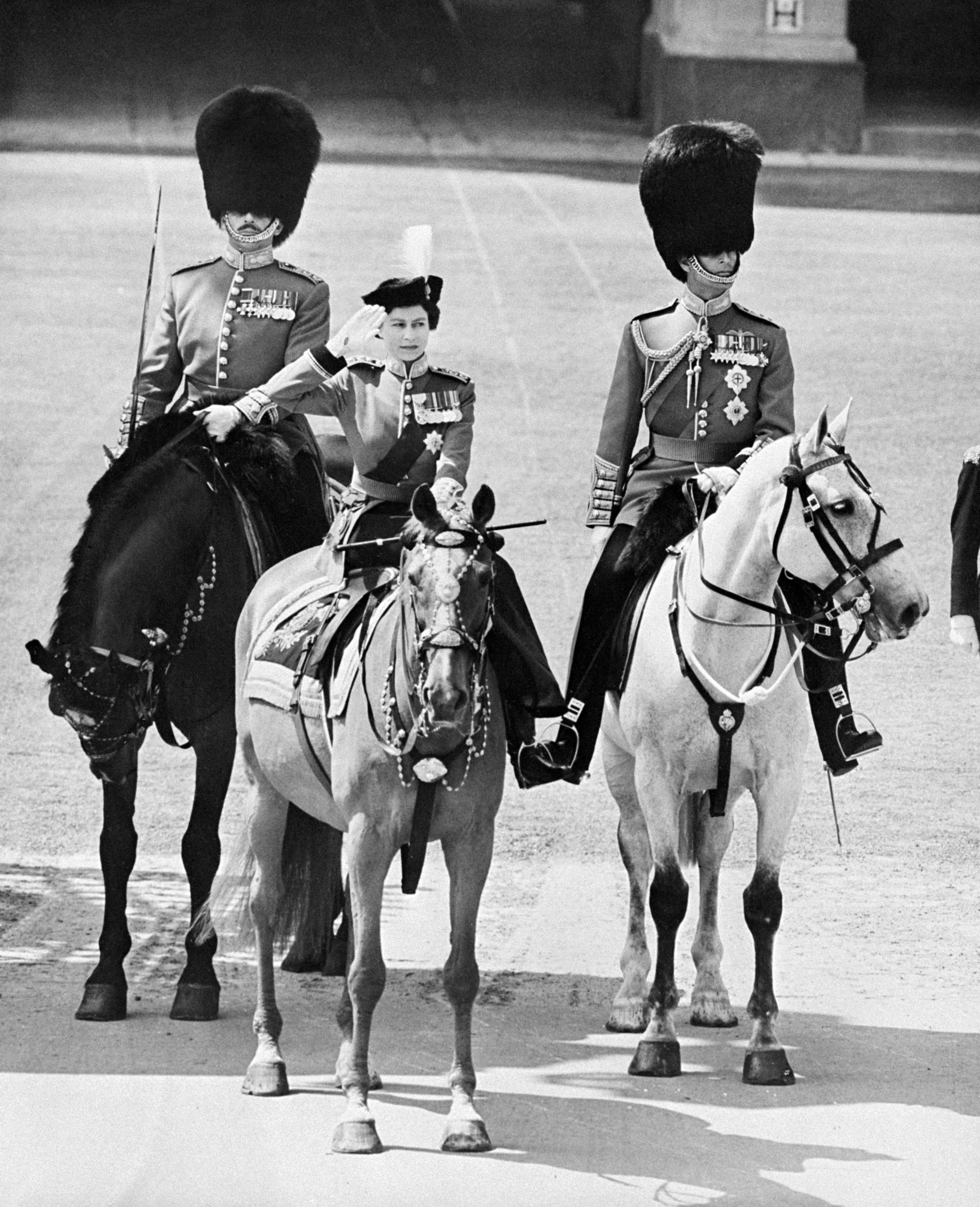 Koningin Elizabeth II (1926-2022) reed tot 1986 mee op haar paard in de route. Een traditie die meerdere leden uit de Britse koninklijke familie hebben overgenomen. Zo hebben prins William, prinses Anne en prins Edward al te paard meegereden. Ook koning Charles rijdt mee te paard, bijvoorbeeld in 2023 tijdens zijn eerste Trooping the Colour als koning. Dit jaar zal hij vanwege zijn gezondheid in de koets meerijden.