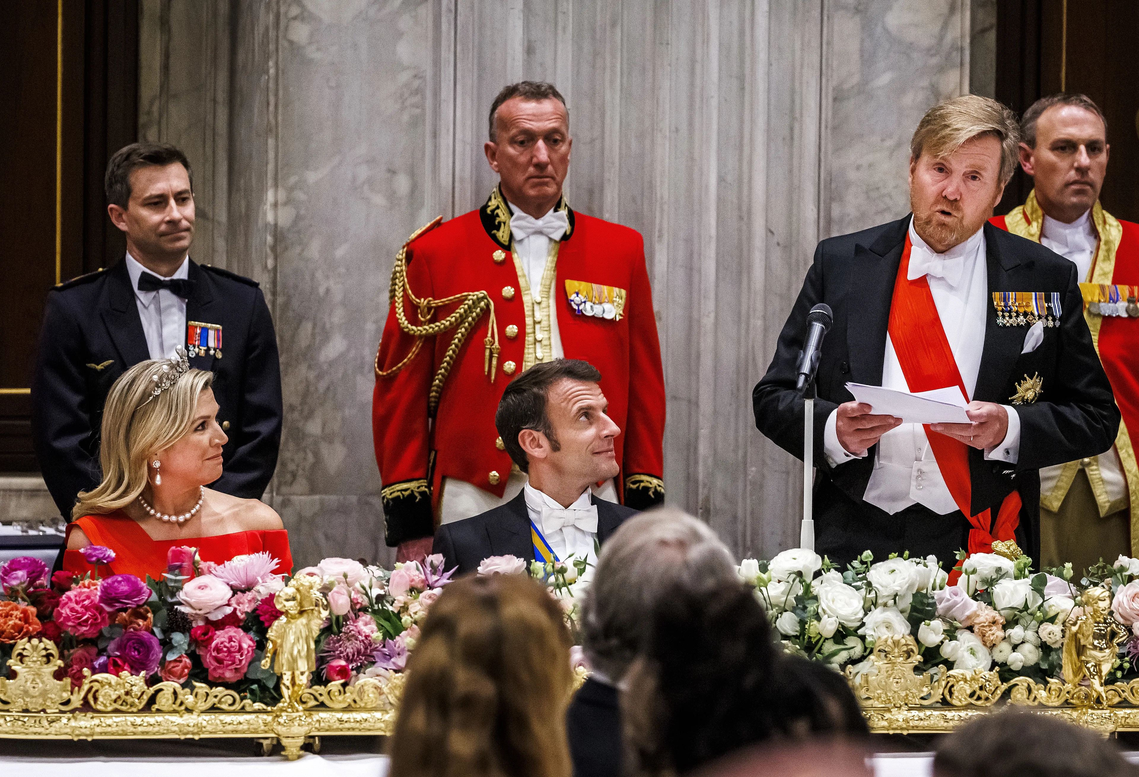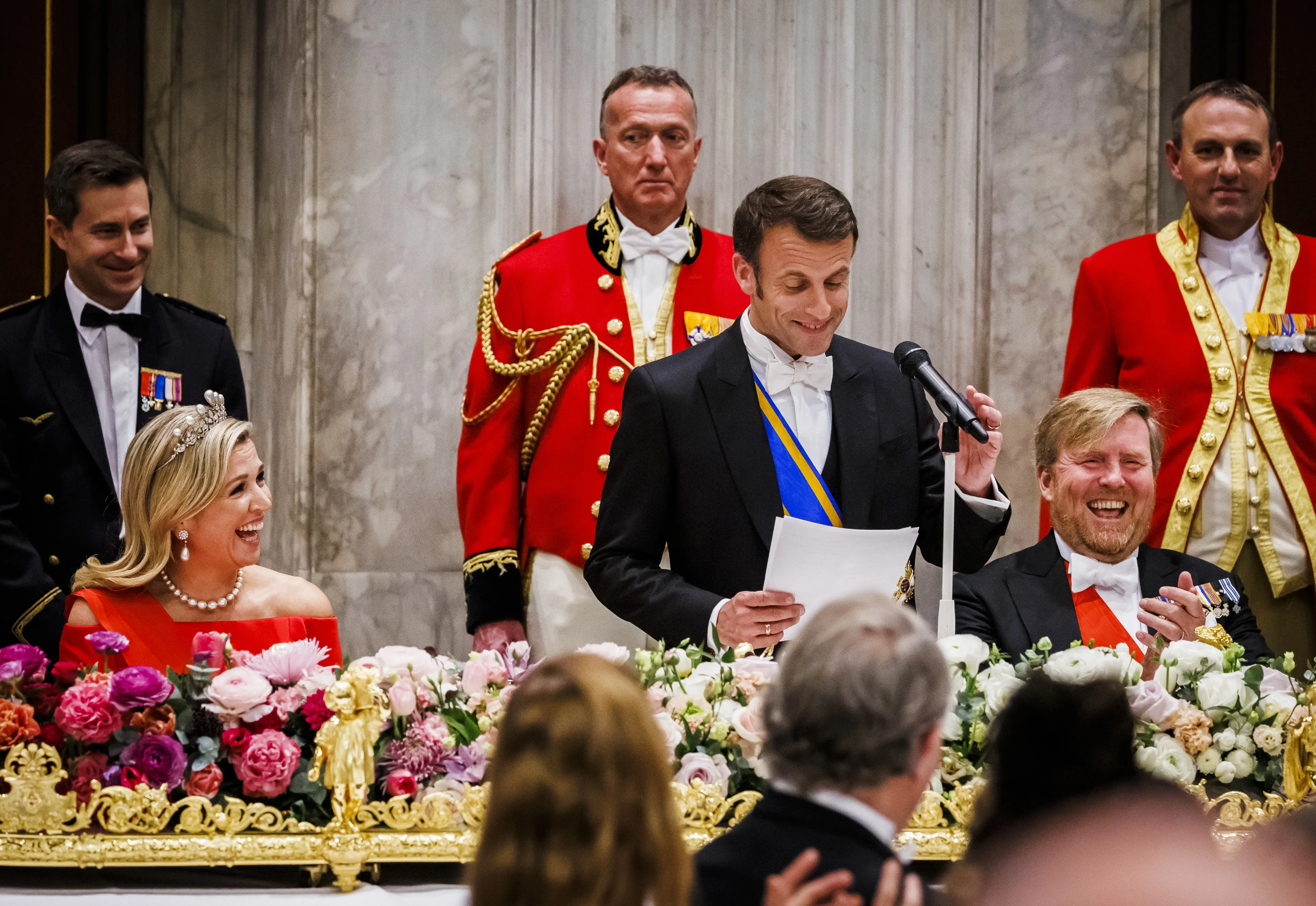 Koning Willem-Alexander en koningin Máxima boden dinsdagavond de Franse president Macron en zijn vrouw Brigitte een staatsbanket aan in het Koninklijk Paleis op de Dam in Amsterdam. Tijdens het staatsbanket schitterde koningin Máxima in een nieuwe jurk van Claes Iversen. Zowel de koning als Macron hield een speech tijdens het staatsbanket.